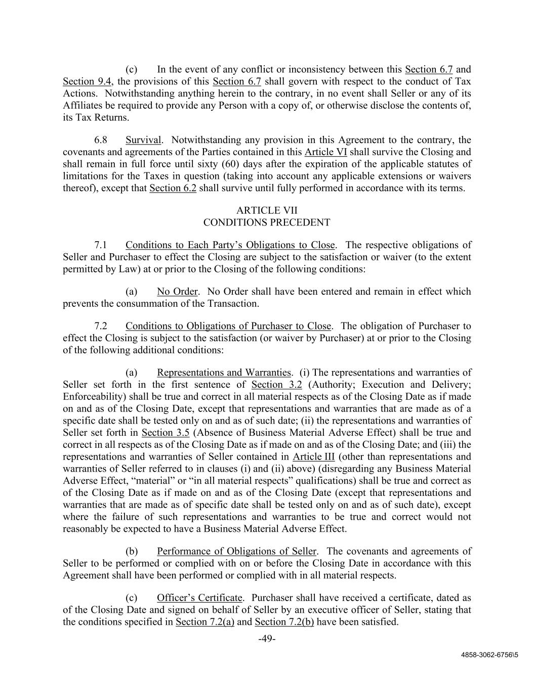 -49- 4858-3062-6756\5 (c) In the event of any conflict or inconsistency between this Section 6.7 and Section 9.4, the provisions of this Section 6.7 shall govern with respect to the conduct of Tax Actions. Notwithstanding anything herein to the contrary, in no event shall Seller or any of its Affiliates be required to provide any Person with a copy of, or otherwise disclose the contents of, its Tax Returns. 6.8 Survival. Notwithstanding any provision in this Agreement to the contrary, the covenants and agreements of the Parties contained in this Article VI shall survive the Closing and shall remain in full force until sixty (60) days after the expiration of the applicable statutes of limitations for the Taxes in question (taking into account any applicable extensions or waivers thereof), except that Section 6.2 shall survive until fully performed in accordance with its terms. ARTICLE VII CONDITIONS PRECEDENT 7.1 Conditions to Each Party’s Obligations to Close. The respective obligations of Seller and Purchaser to effect the Closing are subject to the satisfaction or waiver (to the extent permitted by Law) at or prior to the Closing of the following conditions: (a) No Order. No Order shall have been entered and remain in effect which prevents the consummation of the Transaction. 7.2 Conditions to Obligations of Purchaser to Close. The obligation of Purchaser to effect the Closing is subject to the satisfaction (or waiver by Purchaser) at or prior to the Closing of the following additional conditions: (a) Representations and Warranties. (i) The representations and warranties of Seller set forth in the first sentence of Section 3.2 (Authority; Execution and Delivery; Enforceability) shall be true and correct in all material respects as of the Closing Date as if made on and as of the Closing Date, except that representations and warranties that are made as of a specific date shall be tested only on and as of such date; (ii) the representations and warranties of Seller set forth in Section 3.5 (Absence of Business Material Adverse Effect) shall be true and correct in all respects as of the Closing Date as if made on and as of the Closing Date; and (iii) the representations and warranties of Seller contained in Article III (other than representations and warranties of Seller referred to in clauses (i) and (ii) above) (disregarding any Business Material Adverse Effect, “material” or “in all material respects” qualifications) shall be true and correct as of the Closing Date as if made on and as of the Closing Date (except that representations and warranties that are made as of specific date shall be tested only on and as of such date), except where the failure of such representations and warranties to be true and correct would not reasonably be expected to have a Business Material Adverse Effect. (b) Performance of Obligations of Seller. The covenants and agreements of Seller to be performed or complied with on or before the Closing Date in accordance with this Agreement shall have been performed or complied with in all material respects. (c) Officer’s Certificate. Purchaser shall have received a certificate, dated as of the Closing Date and signed on behalf of Seller by an executive officer of Seller, stating that the conditions specified in Section 7.2(a) and Section 7.2(b) have been satisfied.