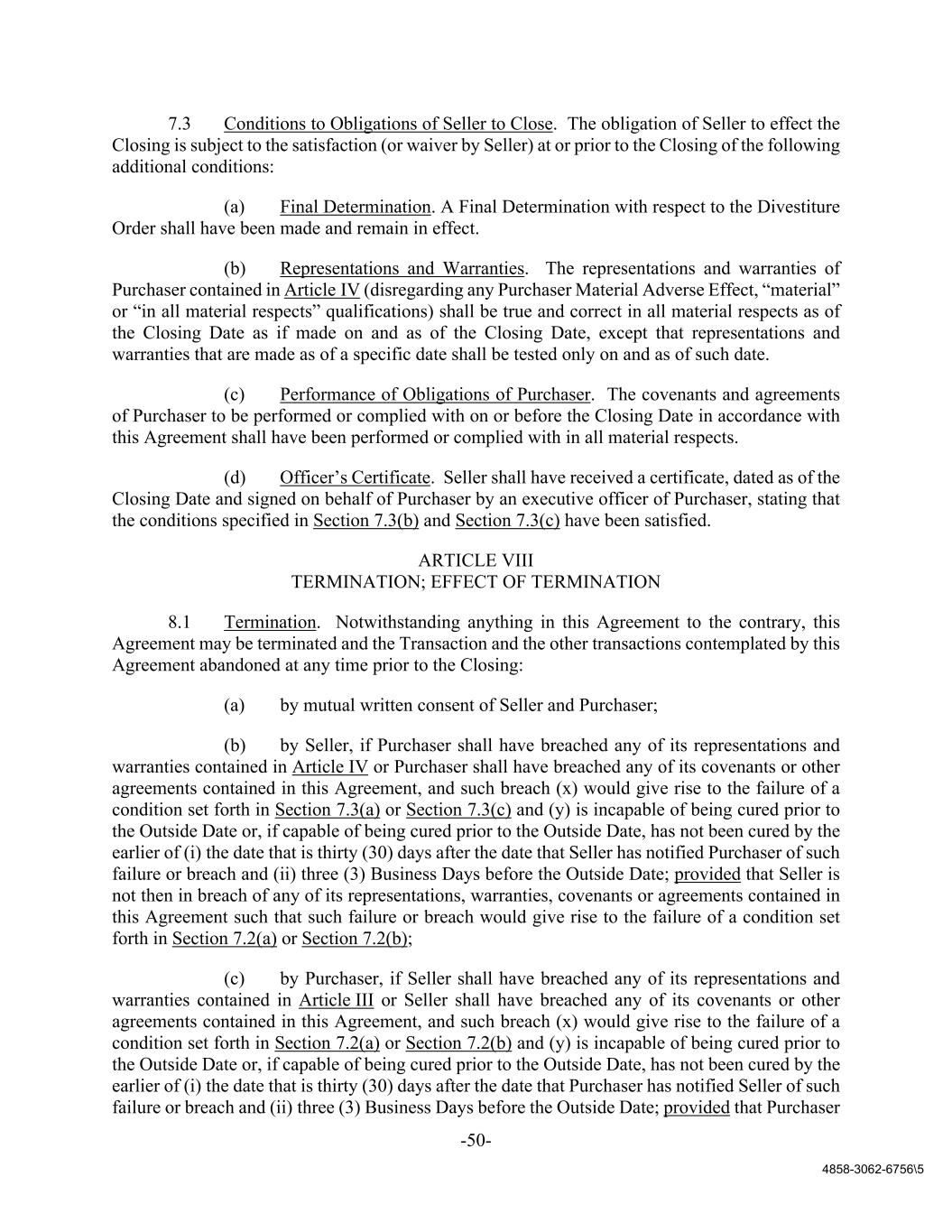 -50- 4858-3062-6756\5 7.3 Conditions to Obligations of Seller to Close. The obligation of Seller to effect the Closing is subject to the satisfaction (or waiver by Seller) at or prior to the Closing of the following additional conditions: (a) Final Determination. A Final Determination with respect to the Divestiture Order shall have been made and remain in effect. (b) Representations and Warranties. The representations and warranties of Purchaser contained in Article IV (disregarding any Purchaser Material Adverse Effect, “material” or “in all material respects” qualifications) shall be true and correct in all material respects as of the Closing Date as if made on and as of the Closing Date, except that representations and warranties that are made as of a specific date shall be tested only on and as of such date. (c) Performance of Obligations of Purchaser. The covenants and agreements of Purchaser to be performed or complied with on or before the Closing Date in accordance with this Agreement shall have been performed or complied with in all material respects. (d) Officer’s Certificate. Seller shall have received a certificate, dated as of the Closing Date and signed on behalf of Purchaser by an executive officer of Purchaser, stating that the conditions specified in Section 7.3(b) and Section 7.3(c) have been satisfied. ARTICLE VIII TERMINATION; EFFECT OF TERMINATION 8.1 Termination. Notwithstanding anything in this Agreement to the contrary, this Agreement may be terminated and the Transaction and the other transactions contemplated by this Agreement abandoned at any time prior to the Closing: (a) by mutual written consent of Seller and Purchaser; (b) by Seller, if Purchaser shall have breached any of its representations and warranties contained in Article IV or Purchaser shall have breached any of its covenants or other agreements contained in this Agreement, and such breach (x) would give rise to the failure of a condition set forth in Section 7.3(a) or Section 7.3(c) and (y) is incapable of being cured prior to the Outside Date or, if capable of being cured prior to the Outside Date, has not been cured by the earlier of (i) the date that is thirty (30) days after the date that Seller has notified Purchaser of such failure or breach and (ii) three (3) Business Days before the Outside Date; provided that Seller is not then in breach of any of its representations, warranties, covenants or agreements contained in this Agreement such that such failure or breach would give rise to the failure of a condition set forth in Section 7.2(a) or Section 7.2(b); (c) by Purchaser, if Seller shall have breached any of its representations and warranties contained in Article III or Seller shall have breached any of its covenants or other agreements contained in this Agreement, and such breach (x) would give rise to the failure of a condition set forth in Section 7.2(a) or Section 7.2(b) and (y) is incapable of being cured prior to the Outside Date or, if capable of being cured prior to the Outside Date, has not been cured by the earlier of (i) the date that is thirty (30) days after the date that Purchaser has notified Seller of such failure or breach and (ii) three (3) Business Days before the Outside Date; provided that Purchaser