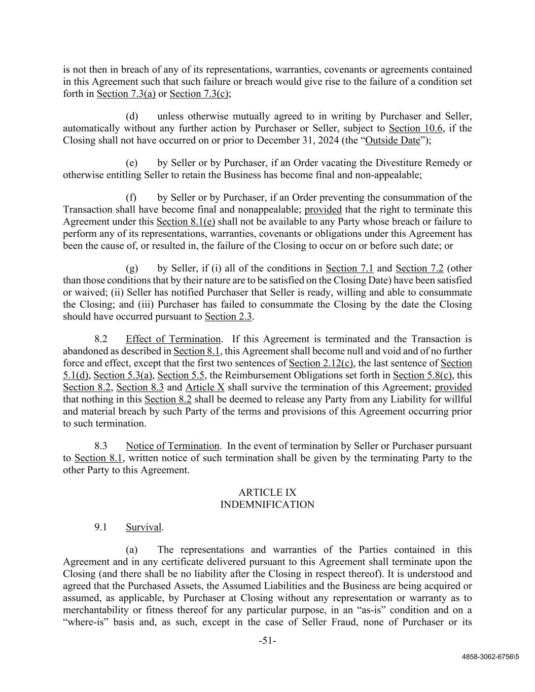 -51- 4858-3062-6756\5 is not then in breach of any of its representations, warranties, covenants or agreements contained in this Agreement such that such failure or breach would give rise to the failure of a condition set forth in Section 7.3(a) or Section 7.3(c); (d) unless otherwise mutually agreed to in writing by Purchaser and Seller, automatically without any further action by Purchaser or Seller, subject to Section 10.6, if the Closing shall not have occurred on or prior to December 31, 2024 (the “Outside Date”); (e) by Seller or by Purchaser, if an Order vacating the Divestiture Remedy or otherwise entitling Seller to retain the Business has become final and non-appealable; (f) by Seller or by Purchaser, if an Order preventing the consummation of the Transaction shall have become final and nonappealable; provided that the right to terminate this Agreement under this Section 8.1(e) shall not be available to any Party whose breach or failure to perform any of its representations, warranties, covenants or obligations under this Agreement has been the cause of, or resulted in, the failure of the Closing to occur on or before such date; or (g) by Seller, if (i) all of the conditions in Section 7.1 and Section 7.2 (other than those conditions that by their nature are to be satisfied on the Closing Date) have been satisfied or waived; (ii) Seller has notified Purchaser that Seller is ready, willing and able to consummate the Closing; and (iii) Purchaser has failed to consummate the Closing by the date the Closing should have occurred pursuant to Section 2.3. 8.2 Effect of Termination. If this Agreement is terminated and the Transaction is abandoned as described in Section 8.1, this Agreement shall become null and void and of no further force and effect, except that the first two sentences of Section 2.12(c), the last sentence of Section 5.1(d), Section 5.3(a), Section 5.5, the Reimbursement Obligations set forth in Section 5.8(c), this Section 8.2, Section 8.3 and Article X shall survive the termination of this Agreement; provided that nothing in this Section 8.2 shall be deemed to release any Party from any Liability for willful and material breach by such Party of the terms and provisions of this Agreement occurring prior to such termination. 8.3 Notice of Termination. In the event of termination by Seller or Purchaser pursuant to Section 8.1, written notice of such termination shall be given by the terminating Party to the other Party to this Agreement. ARTICLE IX INDEMNIFICATION 9.1 Survival. (a) The representations and warranties of the Parties contained in this Agreement and in any certificate delivered pursuant to this Agreement shall terminate upon the Closing (and there shall be no liability after the Closing in respect thereof). It is understood and agreed that the Purchased Assets, the Assumed Liabilities and the Business are being acquired or assumed, as applicable, by Purchaser at Closing without any representation or warranty as to merchantability or fitness thereof for any particular purpose, in an “as-is” condition and on a “where-is” basis and, as such, except in the case of Seller Fraud, none of Purchaser or its