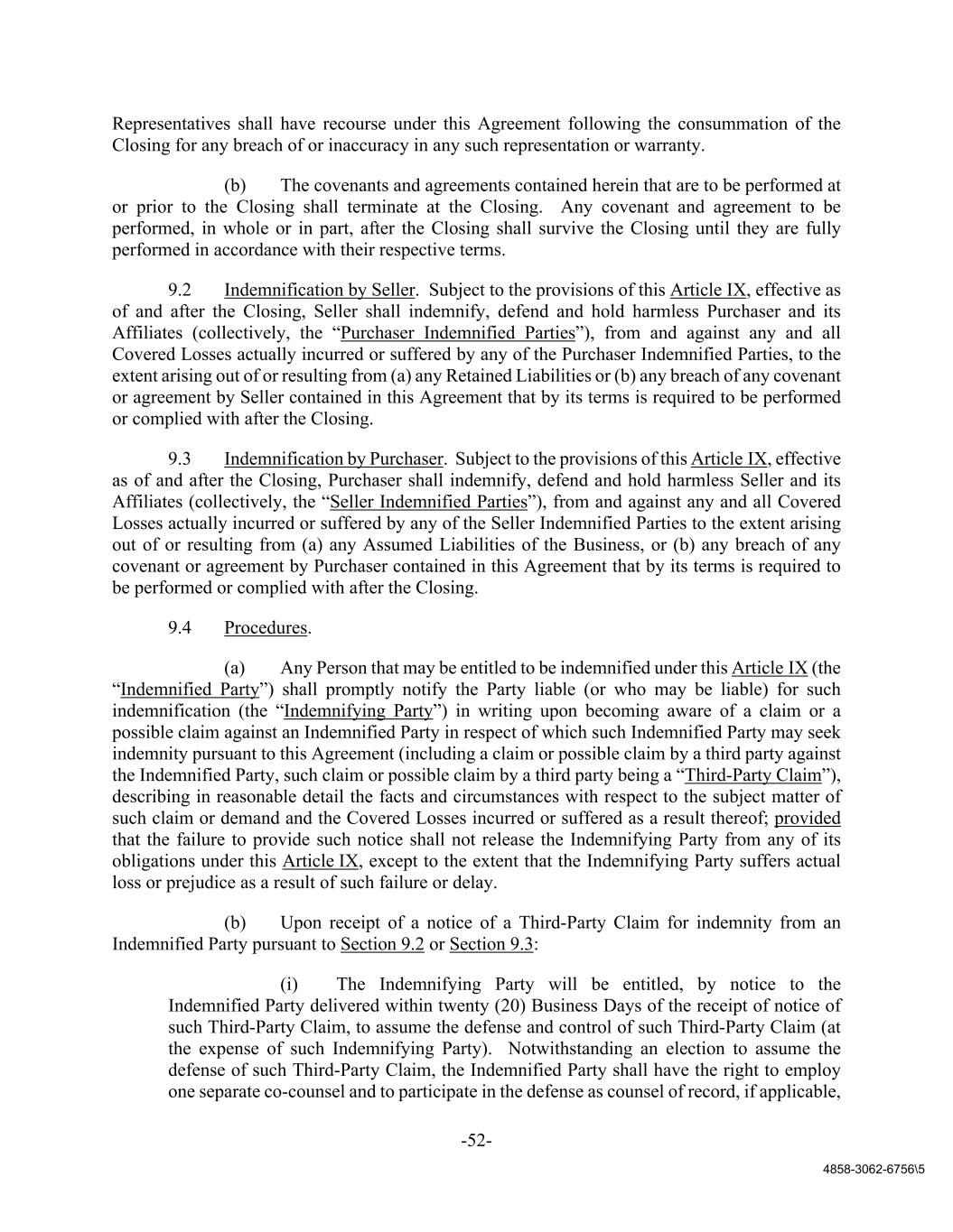 -52- 4858-3062-6756\5 Representatives shall have recourse under this Agreement following the consummation of the Closing for any breach of or inaccuracy in any such representation or warranty. (b) The covenants and agreements contained herein that are to be performed at or prior to the Closing shall terminate at the Closing. Any covenant and agreement to be performed, in whole or in part, after the Closing shall survive the Closing until they are fully performed in accordance with their respective terms. 9.2 Indemnification by Seller. Subject to the provisions of this Article IX, effective as of and after the Closing, Seller shall indemnify, defend and hold harmless Purchaser and its Affiliates (collectively, the “Purchaser Indemnified Parties”), from and against any and all Covered Losses actually incurred or suffered by any of the Purchaser Indemnified Parties, to the extent arising out of or resulting from (a) any Retained Liabilities or (b) any breach of any covenant or agreement by Seller contained in this Agreement that by its terms is required to be performed or complied with after the Closing. 9.3 Indemnification by Purchaser. Subject to the provisions of this Article IX, effective as of and after the Closing, Purchaser shall indemnify, defend and hold harmless Seller and its Affiliates (collectively, the “Seller Indemnified Parties”), from and against any and all Covered Losses actually incurred or suffered by any of the Seller Indemnified Parties to the extent arising out of or resulting from (a) any Assumed Liabilities of the Business, or (b) any breach of any covenant or agreement by Purchaser contained in this Agreement that by its terms is required to be performed or complied with after the Closing. 9.4 Procedures. (a) Any Person that may be entitled to be indemnified under this Article IX (the “Indemnified Party”) shall promptly notify the Party liable (or who may be liable) for such indemnification (the “Indemnifying Party”) in writing upon becoming aware of a claim or a possible claim against an Indemnified Party in respect of which such Indemnified Party may seek indemnity pursuant to this Agreement (including a claim or possible claim by a third party against the Indemnified Party, such claim or possible claim by a third party being a “Third-Party Claim”), describing in reasonable detail the facts and circumstances with respect to the subject matter of such claim or demand and the Covered Losses incurred or suffered as a result thereof; provided that the failure to provide such notice shall not release the Indemnifying Party from any of its obligations under this Article IX, except to the extent that the Indemnifying Party suffers actual loss or prejudice as a result of such failure or delay. (b) Upon receipt of a notice of a Third-Party Claim for indemnity from an Indemnified Party pursuant to Section 9.2 or Section 9.3: (i) The Indemnifying Party will be entitled, by notice to the Indemnified Party delivered within twenty (20) Business Days of the receipt of notice of such Third-Party Claim, to assume the defense and control of such Third-Party Claim (at the expense of such Indemnifying Party). Notwithstanding an election to assume the defense of such Third-Party Claim, the Indemnified Party shall have the right to employ one separate co-counsel and to participate in the defense as counsel of record, if applicable,