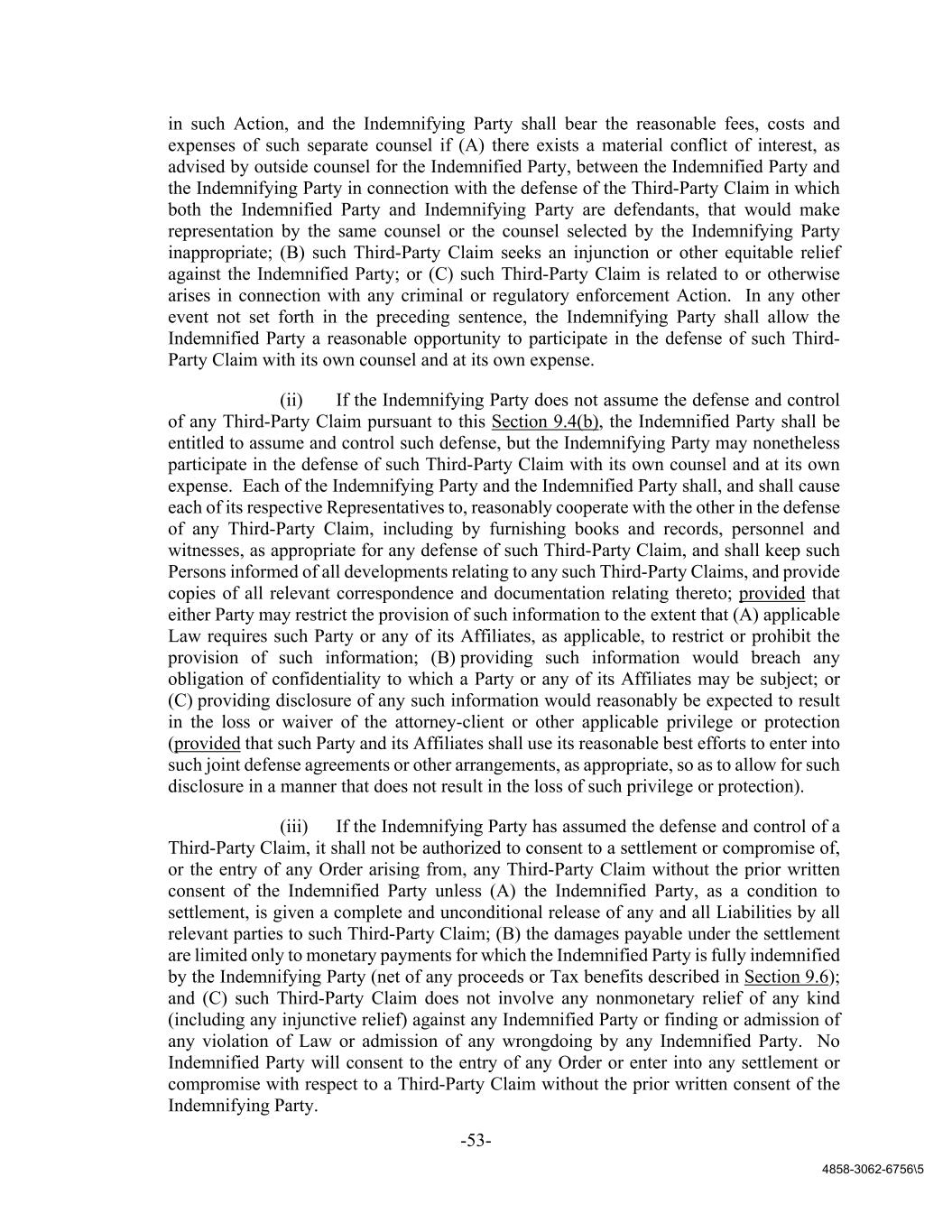 -53- 4858-3062-6756\5 in such Action, and the Indemnifying Party shall bear the reasonable fees, costs and expenses of such separate counsel if (A) there exists a material conflict of interest, as advised by outside counsel for the Indemnified Party, between the Indemnified Party and the Indemnifying Party in connection with the defense of the Third-Party Claim in which both the Indemnified Party and Indemnifying Party are defendants, that would make representation by the same counsel or the counsel selected by the Indemnifying Party inappropriate; (B) such Third-Party Claim seeks an injunction or other equitable relief against the Indemnified Party; or (C) such Third-Party Claim is related to or otherwise arises in connection with any criminal or regulatory enforcement Action. In any other event not set forth in the preceding sentence, the Indemnifying Party shall allow the Indemnified Party a reasonable opportunity to participate in the defense of such Third- Party Claim with its own counsel and at its own expense. (ii) If the Indemnifying Party does not assume the defense and control of any Third-Party Claim pursuant to this Section 9.4(b), the Indemnified Party shall be entitled to assume and control such defense, but the Indemnifying Party may nonetheless participate in the defense of such Third-Party Claim with its own counsel and at its own expense. Each of the Indemnifying Party and the Indemnified Party shall, and shall cause each of its respective Representatives to, reasonably cooperate with the other in the defense of any Third-Party Claim, including by furnishing books and records, personnel and witnesses, as appropriate for any defense of such Third-Party Claim, and shall keep such Persons informed of all developments relating to any such Third-Party Claims, and provide copies of all relevant correspondence and documentation relating thereto; provided that either Party may restrict the provision of such information to the extent that (A) applicable Law requires such Party or any of its Affiliates, as applicable, to restrict or prohibit the provision of such information; (B) providing such information would breach any obligation of confidentiality to which a Party or any of its Affiliates may be subject; or (C) providing disclosure of any such information would reasonably be expected to result in the loss or waiver of the attorney-client or other applicable privilege or protection (provided that such Party and its Affiliates shall use its reasonable best efforts to enter into such joint defense agreements or other arrangements, as appropriate, so as to allow for such disclosure in a manner that does not result in the loss of such privilege or protection). (iii) If the Indemnifying Party has assumed the defense and control of a Third-Party Claim, it shall not be authorized to consent to a settlement or compromise of, or the entry of any Order arising from, any Third-Party Claim without the prior written consent of the Indemnified Party unless (A) the Indemnified Party, as a condition to settlement, is given a complete and unconditional release of any and all Liabilities by all relevant parties to such Third-Party Claim; (B) the damages payable under the settlement are limited only to monetary payments for which the Indemnified Party is fully indemnified by the Indemnifying Party (net of any proceeds or Tax benefits described in Section 9.6); and (C) such Third-Party Claim does not involve any nonmonetary relief of any kind (including any injunctive relief) against any Indemnified Party or finding or admission of any violation of Law or admission of any wrongdoing by any Indemnified Party. No Indemnified Party will consent to the entry of any Order or enter into any settlement or compromise with respect to a Third-Party Claim without the prior written consent of the Indemnifying Party.