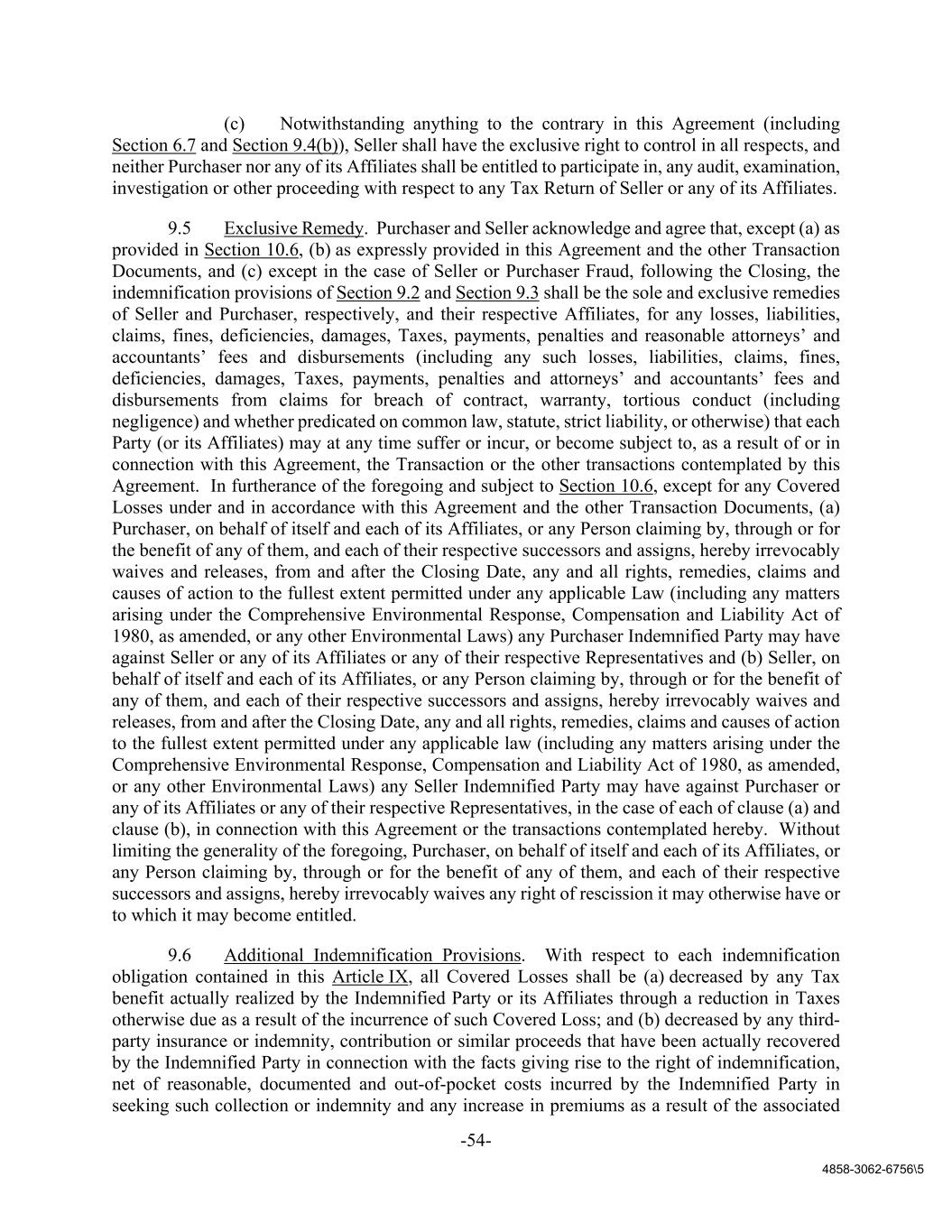 -54- 4858-3062-6756\5 (c) Notwithstanding anything to the contrary in this Agreement (including Section 6.7 and Section 9.4(b)), Seller shall have the exclusive right to control in all respects, and neither Purchaser nor any of its Affiliates shall be entitled to participate in, any audit, examination, investigation or other proceeding with respect to any Tax Return of Seller or any of its Affiliates. 9.5 Exclusive Remedy. Purchaser and Seller acknowledge and agree that, except (a) as provided in Section 10.6, (b) as expressly provided in this Agreement and the other Transaction Documents, and (c) except in the case of Seller or Purchaser Fraud, following the Closing, the indemnification provisions of Section 9.2 and Section 9.3 shall be the sole and exclusive remedies of Seller and Purchaser, respectively, and their respective Affiliates, for any losses, liabilities, claims, fines, deficiencies, damages, Taxes, payments, penalties and reasonable attorneys’ and accountants’ fees and disbursements (including any such losses, liabilities, claims, fines, deficiencies, damages, Taxes, payments, penalties and attorneys’ and accountants’ fees and disbursements from claims for breach of contract, warranty, tortious conduct (including negligence) and whether predicated on common law, statute, strict liability, or otherwise) that each Party (or its Affiliates) may at any time suffer or incur, or become subject to, as a result of or in connection with this Agreement, the Transaction or the other transactions contemplated by this Agreement. In furtherance of the foregoing and subject to Section 10.6, except for any Covered Losses under and in accordance with this Agreement and the other Transaction Documents, (a) Purchaser, on behalf of itself and each of its Affiliates, or any Person claiming by, through or for the benefit of any of them, and each of their respective successors and assigns, hereby irrevocably waives and releases, from and after the Closing Date, any and all rights, remedies, claims and causes of action to the fullest extent permitted under any applicable Law (including any matters arising under the Comprehensive Environmental Response, Compensation and Liability Act of 1980, as amended, or any other Environmental Laws) any Purchaser Indemnified Party may have against Seller or any of its Affiliates or any of their respective Representatives and (b) Seller, on behalf of itself and each of its Affiliates, or any Person claiming by, through or for the benefit of any of them, and each of their respective successors and assigns, hereby irrevocably waives and releases, from and after the Closing Date, any and all rights, remedies, claims and causes of action to the fullest extent permitted under any applicable law (including any matters arising under the Comprehensive Environmental Response, Compensation and Liability Act of 1980, as amended, or any other Environmental Laws) any Seller Indemnified Party may have against Purchaser or any of its Affiliates or any of their respective Representatives, in the case of each of clause (a) and clause (b), in connection with this Agreement or the transactions contemplated hereby. Without limiting the generality of the foregoing, Purchaser, on behalf of itself and each of its Affiliates, or any Person claiming by, through or for the benefit of any of them, and each of their respective successors and assigns, hereby irrevocably waives any right of rescission it may otherwise have or to which it may become entitled. 9.6 Additional Indemnification Provisions. With respect to each indemnification obligation contained in this Article IX, all Covered Losses shall be (a) decreased by any Tax benefit actually realized by the Indemnified Party or its Affiliates through a reduction in Taxes otherwise due as a result of the incurrence of such Covered Loss; and (b) decreased by any third- party insurance or indemnity, contribution or similar proceeds that have been actually recovered by the Indemnified Party in connection with the facts giving rise to the right of indemnification, net of reasonable, documented and out-of-pocket costs incurred by the Indemnified Party in seeking such collection or indemnity and any increase in premiums as a result of the associated