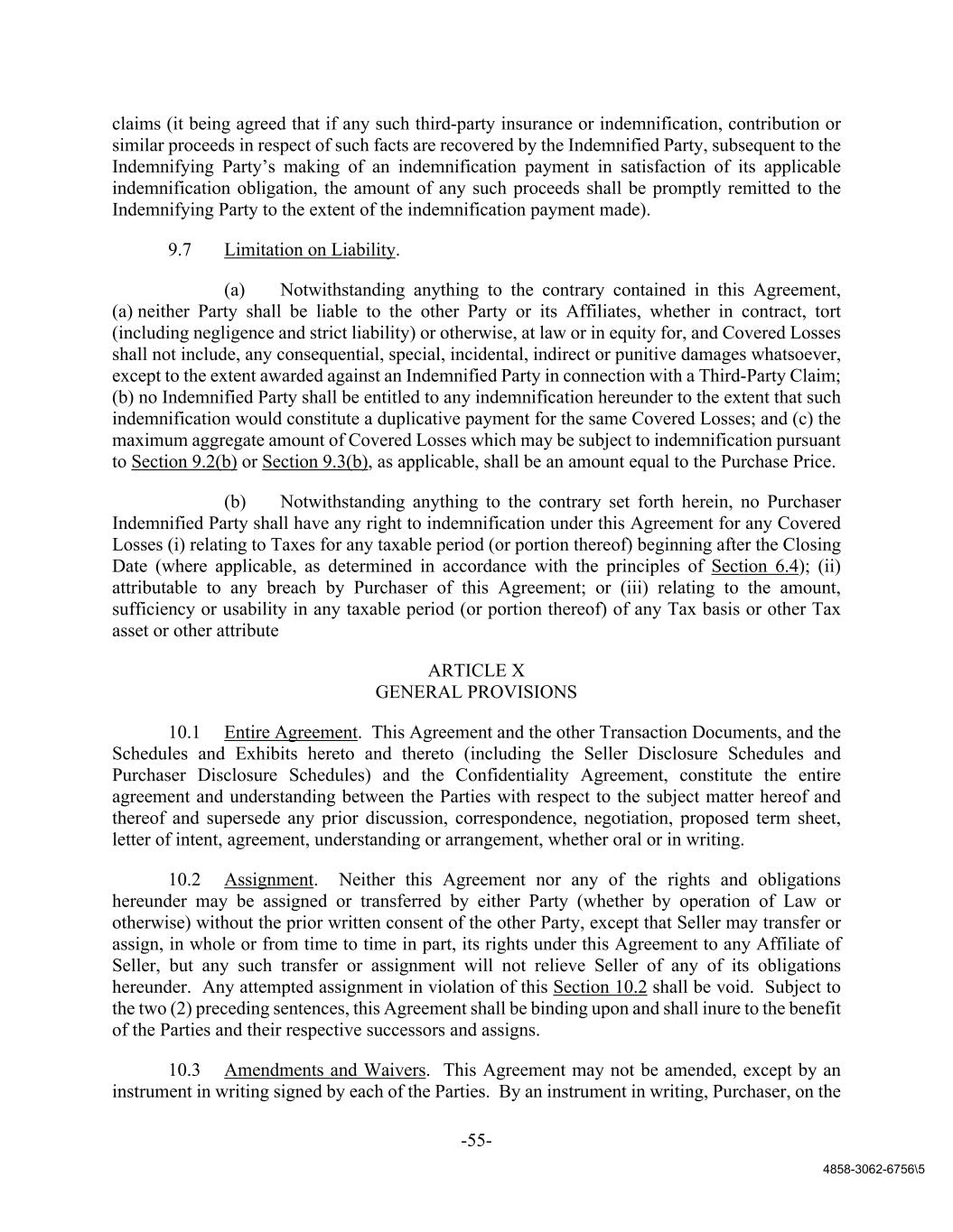 -55- 4858-3062-6756\5 claims (it being agreed that if any such third-party insurance or indemnification, contribution or similar proceeds in respect of such facts are recovered by the Indemnified Party, subsequent to the Indemnifying Party’s making of an indemnification payment in satisfaction of its applicable indemnification obligation, the amount of any such proceeds shall be promptly remitted to the Indemnifying Party to the extent of the indemnification payment made). 9.7 Limitation on Liability. (a) Notwithstanding anything to the contrary contained in this Agreement, (a) neither Party shall be liable to the other Party or its Affiliates, whether in contract, tort (including negligence and strict liability) or otherwise, at law or in equity for, and Covered Losses shall not include, any consequential, special, incidental, indirect or punitive damages whatsoever, except to the extent awarded against an Indemnified Party in connection with a Third-Party Claim; (b) no Indemnified Party shall be entitled to any indemnification hereunder to the extent that such indemnification would constitute a duplicative payment for the same Covered Losses; and (c) the maximum aggregate amount of Covered Losses which may be subject to indemnification pursuant to Section 9.2(b) or Section 9.3(b), as applicable, shall be an amount equal to the Purchase Price. (b) Notwithstanding anything to the contrary set forth herein, no Purchaser Indemnified Party shall have any right to indemnification under this Agreement for any Covered Losses (i) relating to Taxes for any taxable period (or portion thereof) beginning after the Closing Date (where applicable, as determined in accordance with the principles of Section 6.4); (ii) attributable to any breach by Purchaser of this Agreement; or (iii) relating to the amount, sufficiency or usability in any taxable period (or portion thereof) of any Tax basis or other Tax asset or other attribute ARTICLE X GENERAL PROVISIONS 10.1 Entire Agreement. This Agreement and the other Transaction Documents, and the Schedules and Exhibits hereto and thereto (including the Seller Disclosure Schedules and Purchaser Disclosure Schedules) and the Confidentiality Agreement, constitute the entire agreement and understanding between the Parties with respect to the subject matter hereof and thereof and supersede any prior discussion, correspondence, negotiation, proposed term sheet, letter of intent, agreement, understanding or arrangement, whether oral or in writing. 10.2 Assignment. Neither this Agreement nor any of the rights and obligations hereunder may be assigned or transferred by either Party (whether by operation of Law or otherwise) without the prior written consent of the other Party, except that Seller may transfer or assign, in whole or from time to time in part, its rights under this Agreement to any Affiliate of Seller, but any such transfer or assignment will not relieve Seller of any of its obligations hereunder. Any attempted assignment in violation of this Section 10.2 shall be void. Subject to the two (2) preceding sentences, this Agreement shall be binding upon and shall inure to the benefit of the Parties and their respective successors and assigns. 10.3 Amendments and Waivers. This Agreement may not be amended, except by an instrument in writing signed by each of the Parties. By an instrument in writing, Purchaser, on the