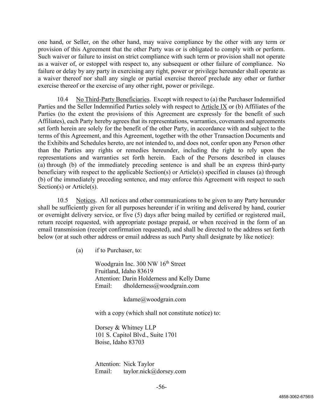 -56- 4858-3062-6756\5 one hand, or Seller, on the other hand, may waive compliance by the other with any term or provision of this Agreement that the other Party was or is obligated to comply with or perform. Such waiver or failure to insist on strict compliance with such term or provision shall not operate as a waiver of, or estoppel with respect to, any subsequent or other failure of compliance. No failure or delay by any party in exercising any right, power or privilege hereunder shall operate as a waiver thereof nor shall any single or partial exercise thereof preclude any other or further exercise thereof or the exercise of any other right, power or privilege. 10.4 No Third-Party Beneficiaries. Except with respect to (a) the Purchaser Indemnified Parties and the Seller Indemnified Parties solely with respect to Article IX or (b) Affiliates of the Parties (to the extent the provisions of this Agreement are expressly for the benefit of such Affiliates), each Party hereby agrees that its representations, warranties, covenants and agreements set forth herein are solely for the benefit of the other Party, in accordance with and subject to the terms of this Agreement, and this Agreement, together with the other Transaction Documents and the Exhibits and Schedules hereto, are not intended to, and does not, confer upon any Person other than the Parties any rights or remedies hereunder, including the right to rely upon the representations and warranties set forth herein. Each of the Persons described in clauses (a) through (b) of the immediately preceding sentence is and shall be an express third-party beneficiary with respect to the applicable Section(s) or Article(s) specified in clauses (a) through (b) of the immediately preceding sentence, and may enforce this Agreement with respect to such Section(s) or Article(s). 10.5 Notices. All notices and other communications to be given to any Party hereunder shall be sufficiently given for all purposes hereunder if in writing and delivered by hand, courier or overnight delivery service, or five (5) days after being mailed by certified or registered mail, return receipt requested, with appropriate postage prepaid, or when received in the form of an email transmission (receipt confirmation requested), and shall be directed to the address set forth below (or at such other address or email address as such Party shall designate by like notice): (a) if to Purchaser, to: Woodgrain Inc. 300 NW 16th Street Fruitland, Idaho 83619 Attention: Darin Holderness and Kelly Dame Email: dholderness@woodgrain.com kdame@woodgrain.com with a copy (which shall not constitute notice) to: Dorsey & Whitney LLP 101 S. Capitol Blvd., Suite 1701 Boise, Idaho 83703 Attention: Nick Taylor Email: taylor.nick@dorsey.com