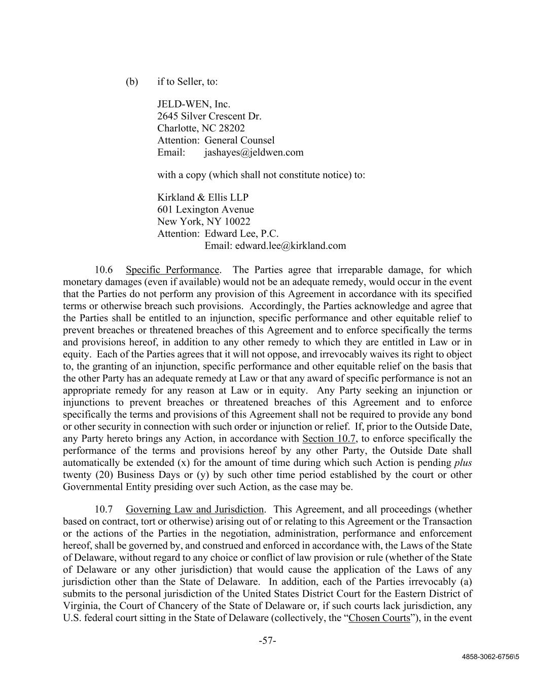 -57- 4858-3062-6756\5 (b) if to Seller, to: JELD-WEN, Inc. 2645 Silver Crescent Dr. Charlotte, NC 28202 Attention: General Counsel Email: jashayes@jeldwen.com with a copy (which shall not constitute notice) to: Kirkland & Ellis LLP 601 Lexington Avenue New York, NY 10022 Attention: Edward Lee, P.C. Email: edward.lee@kirkland.com 10.6 Specific Performance. The Parties agree that irreparable damage, for which monetary damages (even if available) would not be an adequate remedy, would occur in the event that the Parties do not perform any provision of this Agreement in accordance with its specified terms or otherwise breach such provisions. Accordingly, the Parties acknowledge and agree that the Parties shall be entitled to an injunction, specific performance and other equitable relief to prevent breaches or threatened breaches of this Agreement and to enforce specifically the terms and provisions hereof, in addition to any other remedy to which they are entitled in Law or in equity. Each of the Parties agrees that it will not oppose, and irrevocably waives its right to object to, the granting of an injunction, specific performance and other equitable relief on the basis that the other Party has an adequate remedy at Law or that any award of specific performance is not an appropriate remedy for any reason at Law or in equity. Any Party seeking an injunction or injunctions to prevent breaches or threatened breaches of this Agreement and to enforce specifically the terms and provisions of this Agreement shall not be required to provide any bond or other security in connection with such order or injunction or relief. If, prior to the Outside Date, any Party hereto brings any Action, in accordance with Section 10.7, to enforce specifically the performance of the terms and provisions hereof by any other Party, the Outside Date shall automatically be extended (x) for the amount of time during which such Action is pending plus twenty (20) Business Days or (y) by such other time period established by the court or other Governmental Entity presiding over such Action, as the case may be. 10.7 Governing Law and Jurisdiction. This Agreement, and all proceedings (whether based on contract, tort or otherwise) arising out of or relating to this Agreement or the Transaction or the actions of the Parties in the negotiation, administration, performance and enforcement hereof, shall be governed by, and construed and enforced in accordance with, the Laws of the State of Delaware, without regard to any choice or conflict of law provision or rule (whether of the State of Delaware or any other jurisdiction) that would cause the application of the Laws of any jurisdiction other than the State of Delaware. In addition, each of the Parties irrevocably (a) submits to the personal jurisdiction of the United States District Court for the Eastern District of Virginia, the Court of Chancery of the State of Delaware or, if such courts lack jurisdiction, any U.S. federal court sitting in the State of Delaware (collectively, the “Chosen Courts”), in the event