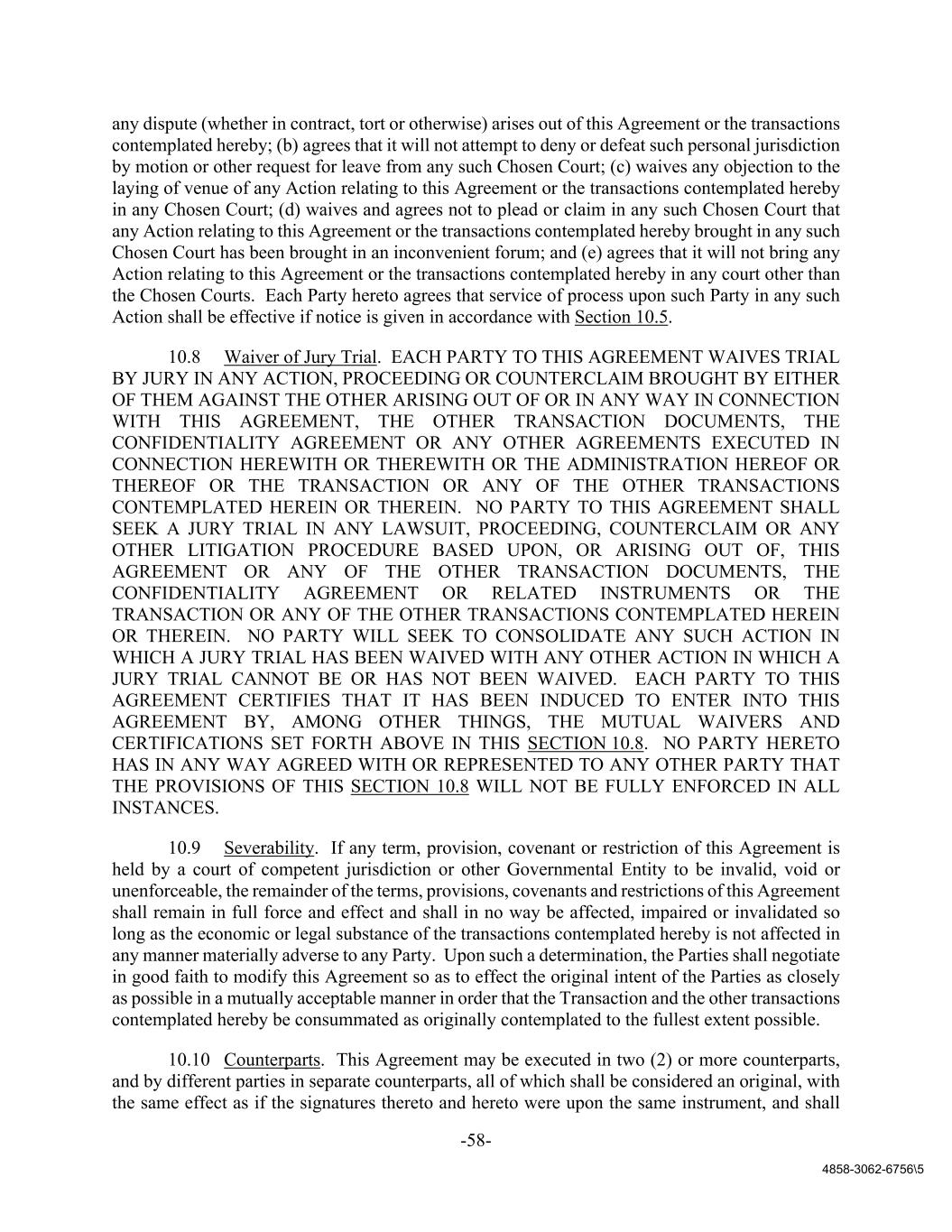 -58- 4858-3062-6756\5 any dispute (whether in contract, tort or otherwise) arises out of this Agreement or the transactions contemplated hereby; (b) agrees that it will not attempt to deny or defeat such personal jurisdiction by motion or other request for leave from any such Chosen Court; (c) waives any objection to the laying of venue of any Action relating to this Agreement or the transactions contemplated hereby in any Chosen Court; (d) waives and agrees not to plead or claim in any such Chosen Court that any Action relating to this Agreement or the transactions contemplated hereby brought in any such Chosen Court has been brought in an inconvenient forum; and (e) agrees that it will not bring any Action relating to this Agreement or the transactions contemplated hereby in any court other than the Chosen Courts. Each Party hereto agrees that service of process upon such Party in any such Action shall be effective if notice is given in accordance with Section 10.5. 10.8 Waiver of Jury Trial. EACH PARTY TO THIS AGREEMENT WAIVES TRIAL BY JURY IN ANY ACTION, PROCEEDING OR COUNTERCLAIM BROUGHT BY EITHER OF THEM AGAINST THE OTHER ARISING OUT OF OR IN ANY WAY IN CONNECTION WITH THIS AGREEMENT, THE OTHER TRANSACTION DOCUMENTS, THE CONFIDENTIALITY AGREEMENT OR ANY OTHER AGREEMENTS EXECUTED IN CONNECTION HEREWITH OR THEREWITH OR THE ADMINISTRATION HEREOF OR THEREOF OR THE TRANSACTION OR ANY OF THE OTHER TRANSACTIONS CONTEMPLATED HEREIN OR THEREIN. NO PARTY TO THIS AGREEMENT SHALL SEEK A JURY TRIAL IN ANY LAWSUIT, PROCEEDING, COUNTERCLAIM OR ANY OTHER LITIGATION PROCEDURE BASED UPON, OR ARISING OUT OF, THIS AGREEMENT OR ANY OF THE OTHER TRANSACTION DOCUMENTS, THE CONFIDENTIALITY AGREEMENT OR RELATED INSTRUMENTS OR THE TRANSACTION OR ANY OF THE OTHER TRANSACTIONS CONTEMPLATED HEREIN OR THEREIN. NO PARTY WILL SEEK TO CONSOLIDATE ANY SUCH ACTION IN WHICH A JURY TRIAL HAS BEEN WAIVED WITH ANY OTHER ACTION IN WHICH A JURY TRIAL CANNOT BE OR HAS NOT BEEN WAIVED. EACH PARTY TO THIS AGREEMENT CERTIFIES THAT IT HAS BEEN INDUCED TO ENTER INTO THIS AGREEMENT BY, AMONG OTHER THINGS, THE MUTUAL WAIVERS AND CERTIFICATIONS SET FORTH ABOVE IN THIS SECTION 10.8. NO PARTY HERETO HAS IN ANY WAY AGREED WITH OR REPRESENTED TO ANY OTHER PARTY THAT THE PROVISIONS OF THIS SECTION 10.8 WILL NOT BE FULLY ENFORCED IN ALL INSTANCES. 10.9 Severability. If any term, provision, covenant or restriction of this Agreement is held by a court of competent jurisdiction or other Governmental Entity to be invalid, void or unenforceable, the remainder of the terms, provisions, covenants and restrictions of this Agreement shall remain in full force and effect and shall in no way be affected, impaired or invalidated so long as the economic or legal substance of the transactions contemplated hereby is not affected in any manner materially adverse to any Party. Upon such a determination, the Parties shall negotiate in good faith to modify this Agreement so as to effect the original intent of the Parties as closely as possible in a mutually acceptable manner in order that the Transaction and the other transactions contemplated hereby be consummated as originally contemplated to the fullest extent possible. 10.10 Counterparts. This Agreement may be executed in two (2) or more counterparts, and by different parties in separate counterparts, all of which shall be considered an original, with the same effect as if the signatures thereto and hereto were upon the same instrument, and shall