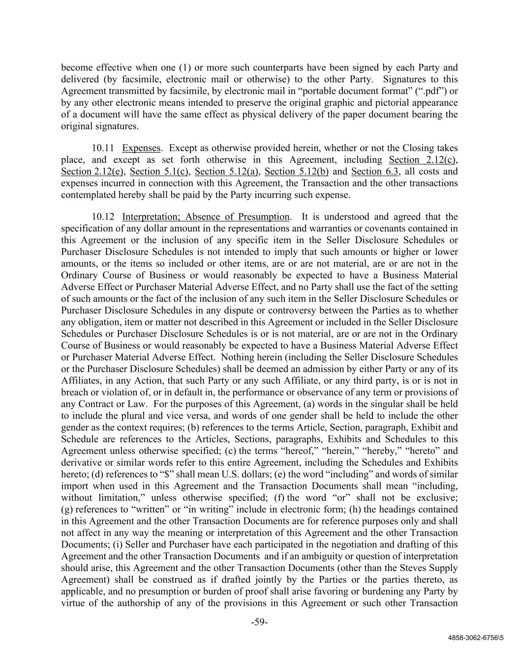 -59- 4858-3062-6756\5 become effective when one (1) or more such counterparts have been signed by each Party and delivered (by facsimile, electronic mail or otherwise) to the other Party. Signatures to this Agreement transmitted by facsimile, by electronic mail in “portable document format” (“.pdf”) or by any other electronic means intended to preserve the original graphic and pictorial appearance of a document will have the same effect as physical delivery of the paper document bearing the original signatures. 10.11 Expenses. Except as otherwise provided herein, whether or not the Closing takes place, and except as set forth otherwise in this Agreement, including Section 2.12(c), Section 2.12(e), Section 5.1(c), Section 5.12(a), Section 5.12(b) and Section 6.3, all costs and expenses incurred in connection with this Agreement, the Transaction and the other transactions contemplated hereby shall be paid by the Party incurring such expense. 10.12 Interpretation; Absence of Presumption. It is understood and agreed that the specification of any dollar amount in the representations and warranties or covenants contained in this Agreement or the inclusion of any specific item in the Seller Disclosure Schedules or Purchaser Disclosure Schedules is not intended to imply that such amounts or higher or lower amounts, or the items so included or other items, are or are not material, are or are not in the Ordinary Course of Business or would reasonably be expected to have a Business Material Adverse Effect or Purchaser Material Adverse Effect, and no Party shall use the fact of the setting of such amounts or the fact of the inclusion of any such item in the Seller Disclosure Schedules or Purchaser Disclosure Schedules in any dispute or controversy between the Parties as to whether any obligation, item or matter not described in this Agreement or included in the Seller Disclosure Schedules or Purchaser Disclosure Schedules is or is not material, are or are not in the Ordinary Course of Business or would reasonably be expected to have a Business Material Adverse Effect or Purchaser Material Adverse Effect. Nothing herein (including the Seller Disclosure Schedules or the Purchaser Disclosure Schedules) shall be deemed an admission by either Party or any of its Affiliates, in any Action, that such Party or any such Affiliate, or any third party, is or is not in breach or violation of, or in default in, the performance or observance of any term or provisions of any Contract or Law. For the purposes of this Agreement, (a) words in the singular shall be held to include the plural and vice versa, and words of one gender shall be held to include the other gender as the context requires; (b) references to the terms Article, Section, paragraph, Exhibit and Schedule are references to the Articles, Sections, paragraphs, Exhibits and Schedules to this Agreement unless otherwise specified; (c) the terms “hereof,” “herein,” “hereby,” “hereto” and derivative or similar words refer to this entire Agreement, including the Schedules and Exhibits hereto; (d) references to “$” shall mean U.S. dollars; (e) the word “including” and words of similar import when used in this Agreement and the Transaction Documents shall mean “including, without limitation,” unless otherwise specified; (f) the word “or” shall not be exclusive; (g) references to “written” or “in writing” include in electronic form; (h) the headings contained in this Agreement and the other Transaction Documents are for reference purposes only and shall not affect in any way the meaning or interpretation of this Agreement and the other Transaction Documents; (i) Seller and Purchaser have each participated in the negotiation and drafting of this Agreement and the other Transaction Documents and if an ambiguity or question of interpretation should arise, this Agreement and the other Transaction Documents (other than the Steves Supply Agreement) shall be construed as if drafted jointly by the Parties or the parties thereto, as applicable, and no presumption or burden of proof shall arise favoring or burdening any Party by virtue of the authorship of any of the provisions in this Agreement or such other Transaction