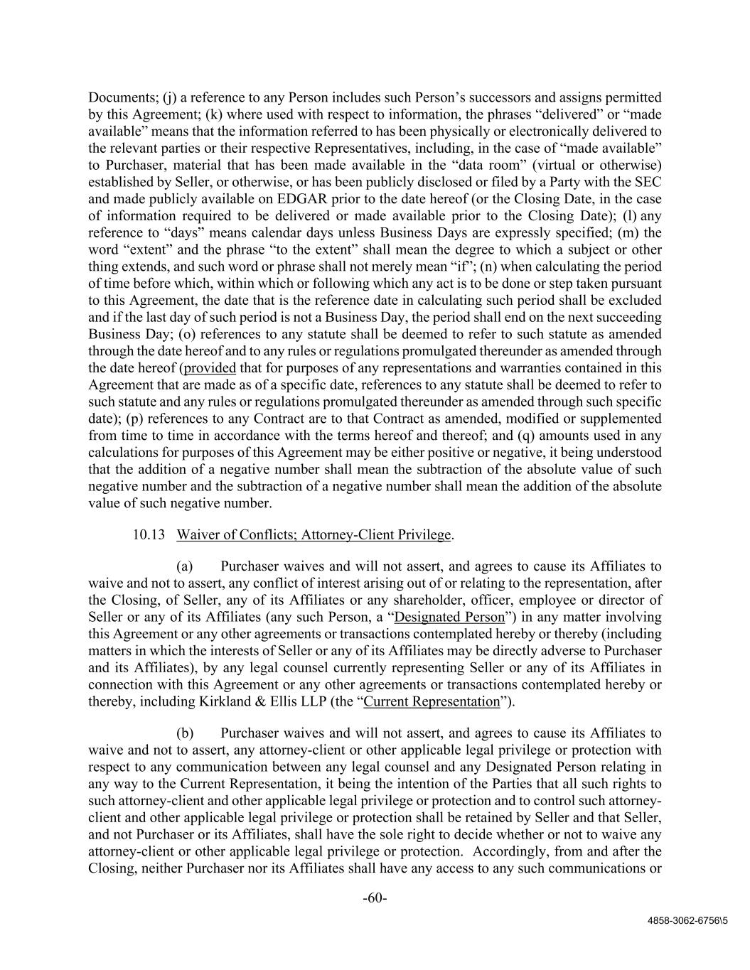 -60- 4858-3062-6756\5 Documents; (j) a reference to any Person includes such Person’s successors and assigns permitted by this Agreement; (k) where used with respect to information, the phrases “delivered” or “made available” means that the information referred to has been physically or electronically delivered to the relevant parties or their respective Representatives, including, in the case of “made available” to Purchaser, material that has been made available in the “data room” (virtual or otherwise) established by Seller, or otherwise, or has been publicly disclosed or filed by a Party with the SEC and made publicly available on EDGAR prior to the date hereof (or the Closing Date, in the case of information required to be delivered or made available prior to the Closing Date); (l) any reference to “days” means calendar days unless Business Days are expressly specified; (m) the word “extent” and the phrase “to the extent” shall mean the degree to which a subject or other thing extends, and such word or phrase shall not merely mean “if”; (n) when calculating the period of time before which, within which or following which any act is to be done or step taken pursuant to this Agreement, the date that is the reference date in calculating such period shall be excluded and if the last day of such period is not a Business Day, the period shall end on the next succeeding Business Day; (o) references to any statute shall be deemed to refer to such statute as amended through the date hereof and to any rules or regulations promulgated thereunder as amended through the date hereof (provided that for purposes of any representations and warranties contained in this Agreement that are made as of a specific date, references to any statute shall be deemed to refer to such statute and any rules or regulations promulgated thereunder as amended through such specific date); (p) references to any Contract are to that Contract as amended, modified or supplemented from time to time in accordance with the terms hereof and thereof; and (q) amounts used in any calculations for purposes of this Agreement may be either positive or negative, it being understood that the addition of a negative number shall mean the subtraction of the absolute value of such negative number and the subtraction of a negative number shall mean the addition of the absolute value of such negative number. 10.13 Waiver of Conflicts; Attorney-Client Privilege. (a) Purchaser waives and will not assert, and agrees to cause its Affiliates to waive and not to assert, any conflict of interest arising out of or relating to the representation, after the Closing, of Seller, any of its Affiliates or any shareholder, officer, employee or director of Seller or any of its Affiliates (any such Person, a “Designated Person”) in any matter involving this Agreement or any other agreements or transactions contemplated hereby or thereby (including matters in which the interests of Seller or any of its Affiliates may be directly adverse to Purchaser and its Affiliates), by any legal counsel currently representing Seller or any of its Affiliates in connection with this Agreement or any other agreements or transactions contemplated hereby or thereby, including Kirkland & Ellis LLP (the “Current Representation”). (b) Purchaser waives and will not assert, and agrees to cause its Affiliates to waive and not to assert, any attorney-client or other applicable legal privilege or protection with respect to any communication between any legal counsel and any Designated Person relating in any way to the Current Representation, it being the intention of the Parties that all such rights to such attorney-client and other applicable legal privilege or protection and to control such attorney- client and other applicable legal privilege or protection shall be retained by Seller and that Seller, and not Purchaser or its Affiliates, shall have the sole right to decide whether or not to waive any attorney-client or other applicable legal privilege or protection. Accordingly, from and after the Closing, neither Purchaser nor its Affiliates shall have any access to any such communications or