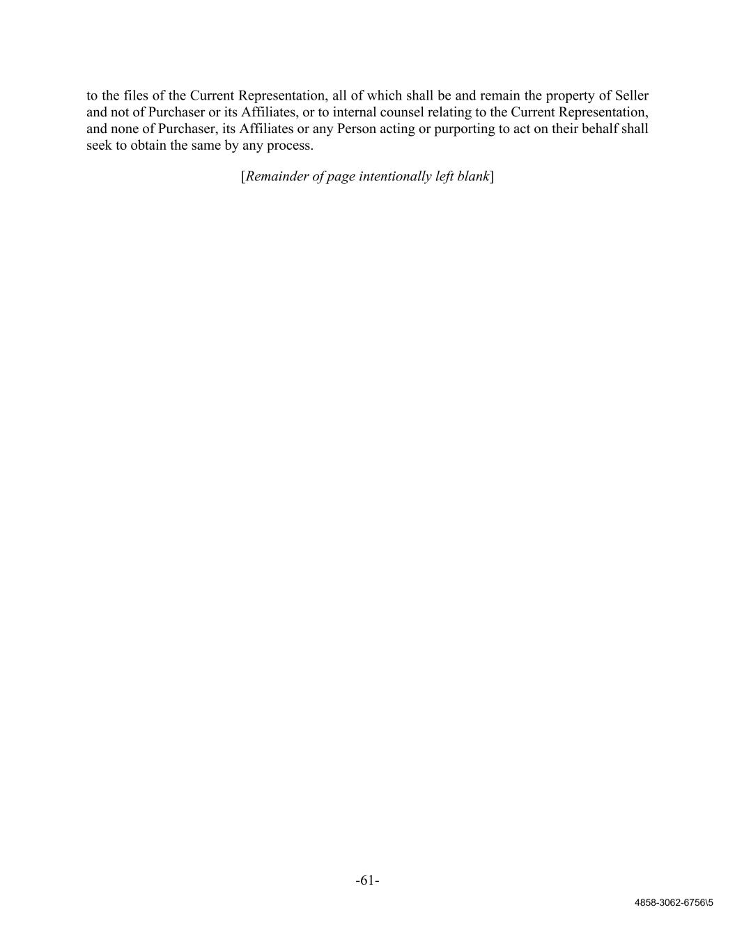 -61- 4858-3062-6756\5 to the files of the Current Representation, all of which shall be and remain the property of Seller and not of Purchaser or its Affiliates, or to internal counsel relating to the Current Representation, and none of Purchaser, its Affiliates or any Person acting or purporting to act on their behalf shall seek to obtain the same by any process. [Remainder of page intentionally left blank]