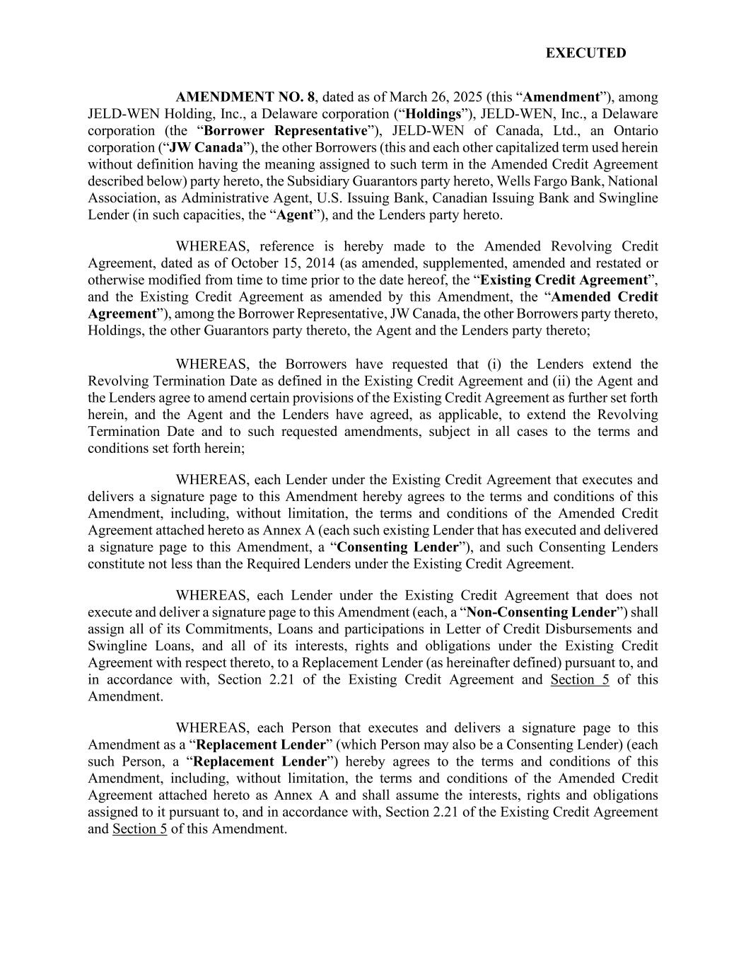 EXECUTED AMENDMENT NO. 8, dated as of March 26, 2025 (this “Amendment”), among JELD-WEN Holding, Inc., a Delaware corporation (“Holdings”), JELD-WEN, Inc., a Delaware corporation (the “Borrower Representative”), JELD-WEN of Canada, Ltd., an Ontario corporation (“JW Canada”), the other Borrowers (this and each other capitalized term used herein without definition having the meaning assigned to such term in the Amended Credit Agreement described below) party hereto, the Subsidiary Guarantors party hereto, Wells Fargo Bank, National Association, as Administrative Agent, U.S. Issuing Bank, Canadian Issuing Bank and Swingline Lender (in such capacities, the “Agent”), and the Lenders party hereto. WHEREAS, reference is hereby made to the Amended Revolving Credit Agreement, dated as of October 15, 2014 (as amended, supplemented, amended and restated or otherwise modified from time to time prior to the date hereof, the “Existing Credit Agreement”, and the Existing Credit Agreement as amended by this Amendment, the “Amended Credit Agreement”), among the Borrower Representative, JW Canada, the other Borrowers party thereto, Holdings, the other Guarantors party thereto, the Agent and the Lenders party thereto; WHEREAS, the Borrowers have requested that (i) the Lenders extend the Revolving Termination Date as defined in the Existing Credit Agreement and (ii) the Agent and the Lenders agree to amend certain provisions of the Existing Credit Agreement as further set forth herein, and the Agent and the Lenders have agreed, as applicable, to extend the Revolving Termination Date and to such requested amendments, subject in all cases to the terms and conditions set forth herein; WHEREAS, each Lender under the Existing Credit Agreement that executes and delivers a signature page to this Amendment hereby agrees to the terms and conditions of this Amendment, including, without limitation, the terms and conditions of the Amended Credit Agreement attached hereto as Annex A (each such existing Lender that has executed and delivered a signature page to this Amendment, a “Consenting Lender”), and such Consenting Lenders constitute not less than the Required Lenders under the Existing Credit Agreement. WHEREAS, each Lender under the Existing Credit Agreement that does not execute and deliver a signature page to this Amendment (each, a “Non-Consenting Lender”) shall assign all of its Commitments, Loans and participations in Letter of Credit Disbursements and Swingline Loans, and all of its interests, rights and obligations under the Existing Credit Agreement with respect thereto, to a Replacement Lender (as hereinafter defined) pursuant to, and in accordance with, Section 2.21 of the Existing Credit Agreement and Section 5 of this Amendment. WHEREAS, each Person that executes and delivers a signature page to this Amendment as a “Replacement Lender” (which Person may also be a Consenting Lender) (each such Person, a “Replacement Lender”) hereby agrees to the terms and conditions of this Amendment, including, without limitation, the terms and conditions of the Amended Credit Agreement attached hereto as Annex A and shall assume the interests, rights and obligations assigned to it pursuant to, and in accordance with, Section 2.21 of the Existing Credit Agreement and Section 5 of this Amendment.