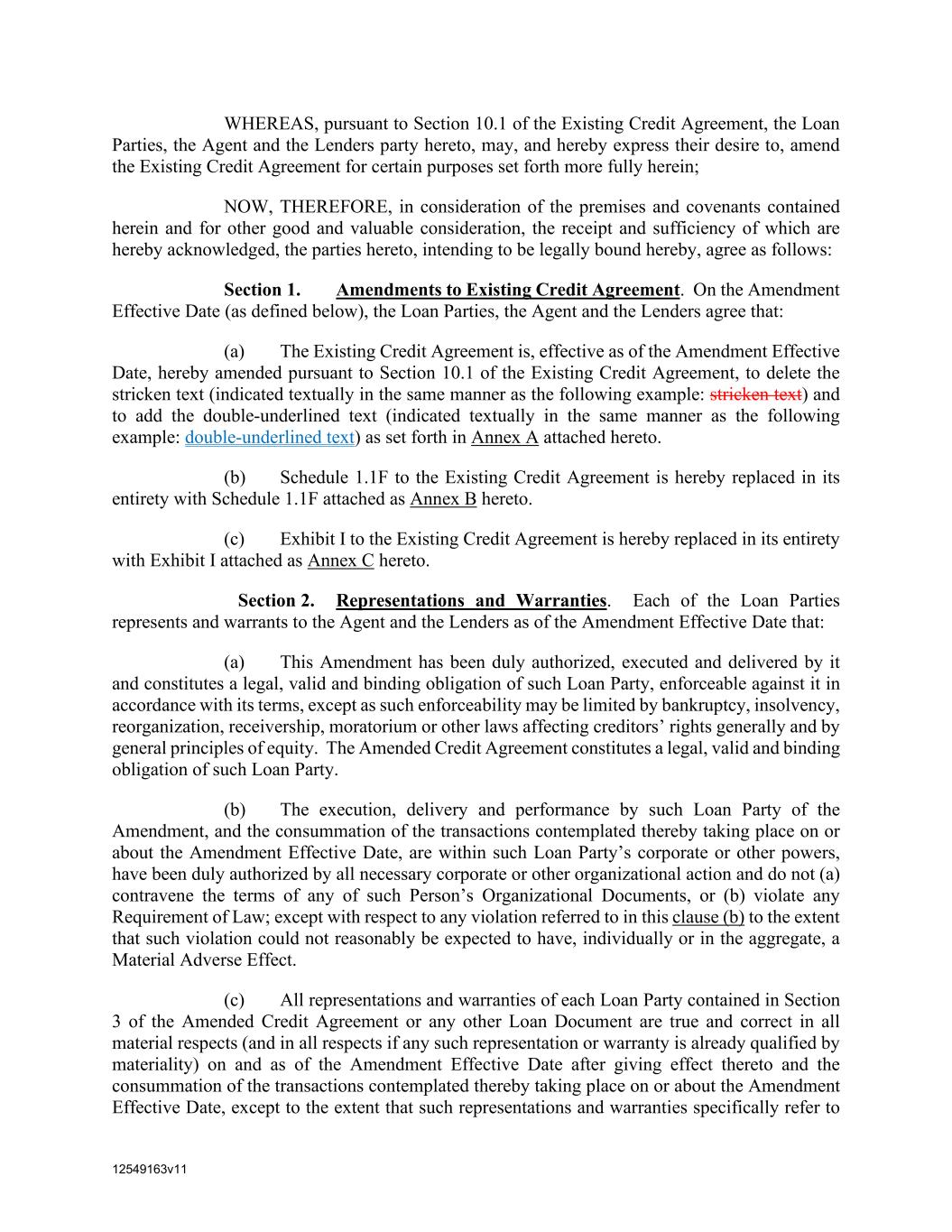 12549163v11 WHEREAS, pursuant to Section 10.1 of the Existing Credit Agreement, the Loan Parties, the Agent and the Lenders party hereto, may, and hereby express their desire to, amend the Existing Credit Agreement for certain purposes set forth more fully herein; NOW, THEREFORE, in consideration of the premises and covenants contained herein and for other good and valuable consideration, the receipt and sufficiency of which are hereby acknowledged, the parties hereto, intending to be legally bound hereby, agree as follows: Section 1. Amendments to Existing Credit Agreement. On the Amendment Effective Date (as defined below), the Loan Parties, the Agent and the Lenders agree that: (a) The Existing Credit Agreement is, effective as of the Amendment Effective Date, hereby amended pursuant to Section 10.1 of the Existing Credit Agreement, to delete the stricken text (indicated textually in the same manner as the following example: stricken text) and to add the double-underlined text (indicated textually in the same manner as the following example: double-underlined text) as set forth in Annex A attached hereto. (b) Schedule 1.1F to the Existing Credit Agreement is hereby replaced in its entirety with Schedule 1.1F attached as Annex B hereto. (c) Exhibit I to the Existing Credit Agreement is hereby replaced in its entirety with Exhibit I attached as Annex C hereto. Section 2. Representations and Warranties. Each of the Loan Parties represents and warrants to the Agent and the Lenders as of the Amendment Effective Date that: (a) This Amendment has been duly authorized, executed and delivered by it and constitutes a legal, valid and binding obligation of such Loan Party, enforceable against it in accordance with its terms, except as such enforceability may be limited by bankruptcy, insolvency, reorganization, receivership, moratorium or other laws affecting creditors’ rights generally and by general principles of equity. The Amended Credit Agreement constitutes a legal, valid and binding obligation of such Loan Party. (b) The execution, delivery and performance by such Loan Party of the Amendment, and the consummation of the transactions contemplated thereby taking place on or about the Amendment Effective Date, are within such Loan Party’s corporate or other powers, have been duly authorized by all necessary corporate or other organizational action and do not (a) contravene the terms of any of such Person’s Organizational Documents, or (b) violate any Requirement of Law; except with respect to any violation referred to in this clause (b) to the extent that such violation could not reasonably be expected to have, individually or in the aggregate, a Material Adverse Effect. (c) All representations and warranties of each Loan Party contained in Section 3 of the Amended Credit Agreement or any other Loan Document are true and correct in all material respects (and in all respects if any such representation or warranty is already qualified by materiality) on and as of the Amendment Effective Date after giving effect thereto and the consummation of the transactions contemplated thereby taking place on or about the Amendment Effective Date, except to the extent that such representations and warranties specifically refer to