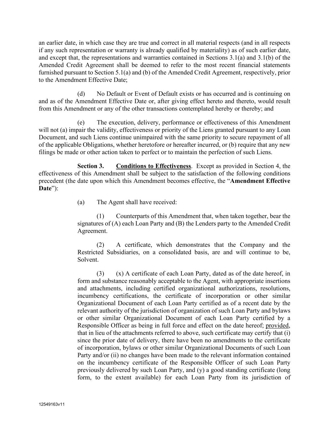 12549163v11 an earlier date, in which case they are true and correct in all material respects (and in all respects if any such representation or warranty is already qualified by materiality) as of such earlier date, and except that, the representations and warranties contained in Sections 3.1(a) and 3.1(b) of the Amended Credit Agreement shall be deemed to refer to the most recent financial statements furnished pursuant to Section 5.1(a) and (b) of the Amended Credit Agreement, respectively, prior to the Amendment Effective Date; (d) No Default or Event of Default exists or has occurred and is continuing on and as of the Amendment Effective Date or, after giving effect hereto and thereto, would result from this Amendment or any of the other transactions contemplated hereby or thereby; and (e) The execution, delivery, performance or effectiveness of this Amendment will not (a) impair the validity, effectiveness or priority of the Liens granted pursuant to any Loan Document, and such Liens continue unimpaired with the same priority to secure repayment of all of the applicable Obligations, whether heretofore or hereafter incurred, or (b) require that any new filings be made or other action taken to perfect or to maintain the perfection of such Liens. Section 3. Conditions to Effectiveness. Except as provided in Section 4, the effectiveness of this Amendment shall be subject to the satisfaction of the following conditions precedent (the date upon which this Amendment becomes effective, the “Amendment Effective Date”): (a) The Agent shall have received: (1) Counterparts of this Amendment that, when taken together, bear the signatures of (A) each Loan Party and (B) the Lenders party to the Amended Credit Agreement. (2) A certificate, which demonstrates that the Company and the Restricted Subsidiaries, on a consolidated basis, are and will continue to be, Solvent. (3) (x) A certificate of each Loan Party, dated as of the date hereof, in form and substance reasonably acceptable to the Agent, with appropriate insertions and attachments, including certified organizational authorizations, resolutions, incumbency certifications, the certificate of incorporation or other similar Organizational Document of each Loan Party certified as of a recent date by the relevant authority of the jurisdiction of organization of such Loan Party and bylaws or other similar Organizational Document of each Loan Party certified by a Responsible Officer as being in full force and effect on the date hereof; provided, that in lieu of the attachments referred to above, such certificate may certify that (i) since the prior date of delivery, there have been no amendments to the certificate of incorporation, bylaws or other similar Organizational Documents of such Loan Party and/or (ii) no changes have been made to the relevant information contained on the incumbency certificate of the Responsible Officer of such Loan Party previously delivered by such Loan Party, and (y) a good standing certificate (long form, to the extent available) for each Loan Party from its jurisdiction of