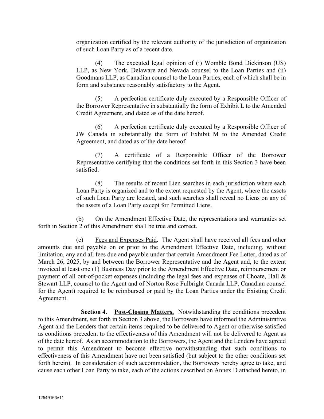 12549163v11 organization certified by the relevant authority of the jurisdiction of organization of such Loan Party as of a recent date. (4) The executed legal opinion of (i) Womble Bond Dickinson (US) LLP, as New York, Delaware and Nevada counsel to the Loan Parties and (ii) Goodmans LLP, as Canadian counsel to the Loan Parties, each of which shall be in form and substance reasonably satisfactory to the Agent. (5) A perfection certificate duly executed by a Responsible Officer of the Borrower Representative in substantially the form of Exhibit L to the Amended Credit Agreement, and dated as of the date hereof. (6) A perfection certificate duly executed by a Responsible Officer of JW Canada in substantially the form of Exhibit M to the Amended Credit Agreement, and dated as of the date hereof. (7) A certificate of a Responsible Officer of the Borrower Representative certifying that the conditions set forth in this Section 3 have been satisfied. (8) The results of recent Lien searches in each jurisdiction where each Loan Party is organized and to the extent requested by the Agent, where the assets of such Loan Party are located, and such searches shall reveal no Liens on any of the assets of a Loan Party except for Permitted Liens. (b) On the Amendment Effective Date, the representations and warranties set forth in Section 2 of this Amendment shall be true and correct. (c) Fees and Expenses Paid. The Agent shall have received all fees and other amounts due and payable on or prior to the Amendment Effective Date, including, without limitation, any and all fees due and payable under that certain Amendment Fee Letter, dated as of March 26, 2025, by and between the Borrower Representative and the Agent and, to the extent invoiced at least one (1) Business Day prior to the Amendment Effective Date, reimbursement or payment of all out-of-pocket expenses (including the legal fees and expenses of Choate, Hall & Stewart LLP, counsel to the Agent and of Norton Rose Fulbright Canada LLP, Canadian counsel for the Agent) required to be reimbursed or paid by the Loan Parties under the Existing Credit Agreement. Section 4. Post-Closing Matters. Notwithstanding the conditions precedent to this Amendment, set forth in Section 3 above, the Borrowers have informed the Administrative Agent and the Lenders that certain items required to be delivered to Agent or otherwise satisfied as conditions precedent to the effectiveness of this Amendment will not be delivered to Agent as of the date hereof. As an accommodation to the Borrowers, the Agent and the Lenders have agreed to permit this Amendment to become effective notwithstanding that such conditions to effectiveness of this Amendment have not been satisfied (but subject to the other conditions set forth herein). In consideration of such accommodation, the Borrowers hereby agree to take, and cause each other Loan Party to take, each of the actions described on Annex D attached hereto, in