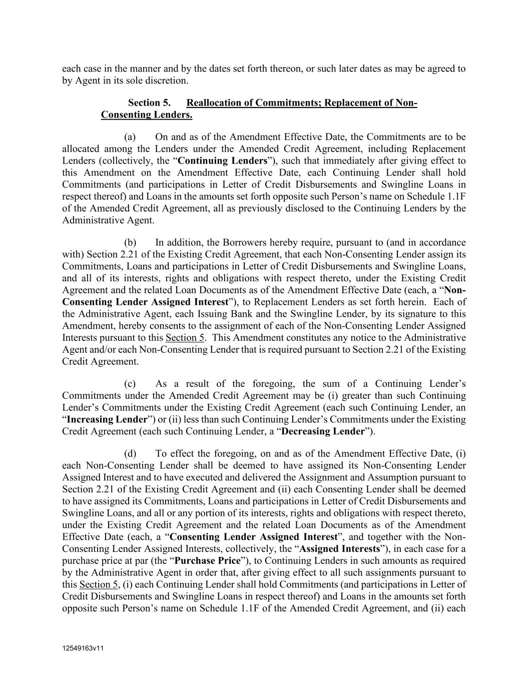 12549163v11 each case in the manner and by the dates set forth thereon, or such later dates as may be agreed to by Agent in its sole discretion. Section 5. Reallocation of Commitments; Replacement of Non- Consenting Lenders. (a) On and as of the Amendment Effective Date, the Commitments are to be allocated among the Lenders under the Amended Credit Agreement, including Replacement Lenders (collectively, the “Continuing Lenders”), such that immediately after giving effect to this Amendment on the Amendment Effective Date, each Continuing Lender shall hold Commitments (and participations in Letter of Credit Disbursements and Swingline Loans in respect thereof) and Loans in the amounts set forth opposite such Person’s name on Schedule 1.1F of the Amended Credit Agreement, all as previously disclosed to the Continuing Lenders by the Administrative Agent. (b) In addition, the Borrowers hereby require, pursuant to (and in accordance with) Section 2.21 of the Existing Credit Agreement, that each Non-Consenting Lender assign its Commitments, Loans and participations in Letter of Credit Disbursements and Swingline Loans, and all of its interests, rights and obligations with respect thereto, under the Existing Credit Agreement and the related Loan Documents as of the Amendment Effective Date (each, a “Non- Consenting Lender Assigned Interest”), to Replacement Lenders as set forth herein. Each of the Administrative Agent, each Issuing Bank and the Swingline Lender, by its signature to this Amendment, hereby consents to the assignment of each of the Non-Consenting Lender Assigned Interests pursuant to this Section 5. This Amendment constitutes any notice to the Administrative Agent and/or each Non-Consenting Lender that is required pursuant to Section 2.21 of the Existing Credit Agreement. (c) As a result of the foregoing, the sum of a Continuing Lender’s Commitments under the Amended Credit Agreement may be (i) greater than such Continuing Lender’s Commitments under the Existing Credit Agreement (each such Continuing Lender, an “Increasing Lender”) or (ii) less than such Continuing Lender’s Commitments under the Existing Credit Agreement (each such Continuing Lender, a “Decreasing Lender”). (d) To effect the foregoing, on and as of the Amendment Effective Date, (i) each Non-Consenting Lender shall be deemed to have assigned its Non-Consenting Lender Assigned Interest and to have executed and delivered the Assignment and Assumption pursuant to Section 2.21 of the Existing Credit Agreement and (ii) each Consenting Lender shall be deemed to have assigned its Commitments, Loans and participations in Letter of Credit Disbursements and Swingline Loans, and all or any portion of its interests, rights and obligations with respect thereto, under the Existing Credit Agreement and the related Loan Documents as of the Amendment Effective Date (each, a “Consenting Lender Assigned Interest”, and together with the Non- Consenting Lender Assigned Interests, collectively, the “Assigned Interests”), in each case for a purchase price at par (the “Purchase Price”), to Continuing Lenders in such amounts as required by the Administrative Agent in order that, after giving effect to all such assignments pursuant to this Section 5, (i) each Continuing Lender shall hold Commitments (and participations in Letter of Credit Disbursements and Swingline Loans in respect thereof) and Loans in the amounts set forth opposite such Person’s name on Schedule 1.1F of the Amended Credit Agreement, and (ii) each