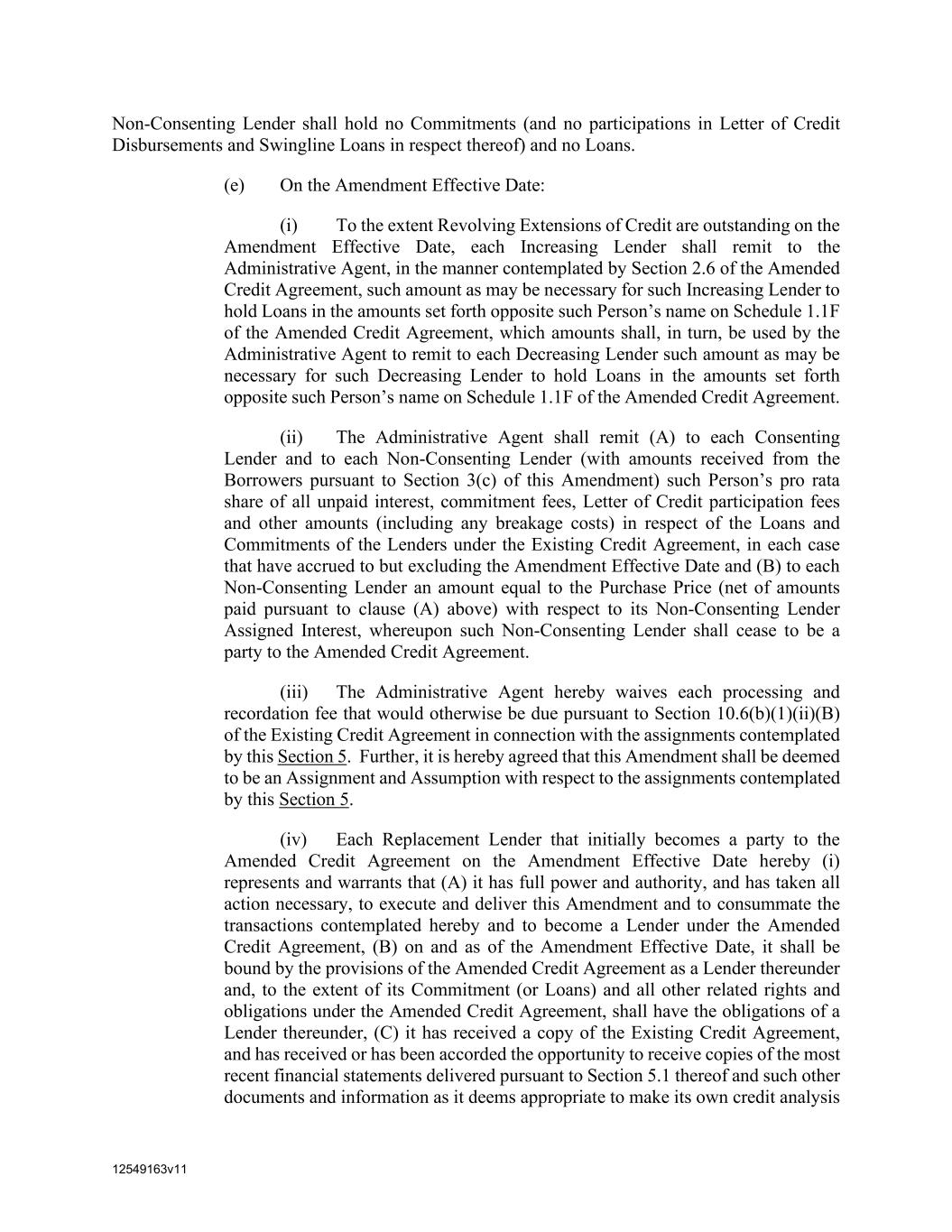 12549163v11 Non-Consenting Lender shall hold no Commitments (and no participations in Letter of Credit Disbursements and Swingline Loans in respect thereof) and no Loans. (e) On the Amendment Effective Date: (i) To the extent Revolving Extensions of Credit are outstanding on the Amendment Effective Date, each Increasing Lender shall remit to the Administrative Agent, in the manner contemplated by Section 2.6 of the Amended Credit Agreement, such amount as may be necessary for such Increasing Lender to hold Loans in the amounts set forth opposite such Person’s name on Schedule 1.1F of the Amended Credit Agreement, which amounts shall, in turn, be used by the Administrative Agent to remit to each Decreasing Lender such amount as may be necessary for such Decreasing Lender to hold Loans in the amounts set forth opposite such Person’s name on Schedule 1.1F of the Amended Credit Agreement. (ii) The Administrative Agent shall remit (A) to each Consenting Lender and to each Non-Consenting Lender (with amounts received from the Borrowers pursuant to Section 3(c) of this Amendment) such Person’s pro rata share of all unpaid interest, commitment fees, Letter of Credit participation fees and other amounts (including any breakage costs) in respect of the Loans and Commitments of the Lenders under the Existing Credit Agreement, in each case that have accrued to but excluding the Amendment Effective Date and (B) to each Non-Consenting Lender an amount equal to the Purchase Price (net of amounts paid pursuant to clause (A) above) with respect to its Non-Consenting Lender Assigned Interest, whereupon such Non-Consenting Lender shall cease to be a party to the Amended Credit Agreement. (iii) The Administrative Agent hereby waives each processing and recordation fee that would otherwise be due pursuant to Section 10.6(b)(1)(ii)(B) of the Existing Credit Agreement in connection with the assignments contemplated by this Section 5. Further, it is hereby agreed that this Amendment shall be deemed to be an Assignment and Assumption with respect to the assignments contemplated by this Section 5. (iv) Each Replacement Lender that initially becomes a party to the Amended Credit Agreement on the Amendment Effective Date hereby (i) represents and warrants that (A) it has full power and authority, and has taken all action necessary, to execute and deliver this Amendment and to consummate the transactions contemplated hereby and to become a Lender under the Amended Credit Agreement, (B) on and as of the Amendment Effective Date, it shall be bound by the provisions of the Amended Credit Agreement as a Lender thereunder and, to the extent of its Commitment (or Loans) and all other related rights and obligations under the Amended Credit Agreement, shall have the obligations of a Lender thereunder, (C) it has received a copy of the Existing Credit Agreement, and has received or has been accorded the opportunity to receive copies of the most recent financial statements delivered pursuant to Section 5.1 thereof and such other documents and information as it deems appropriate to make its own credit analysis