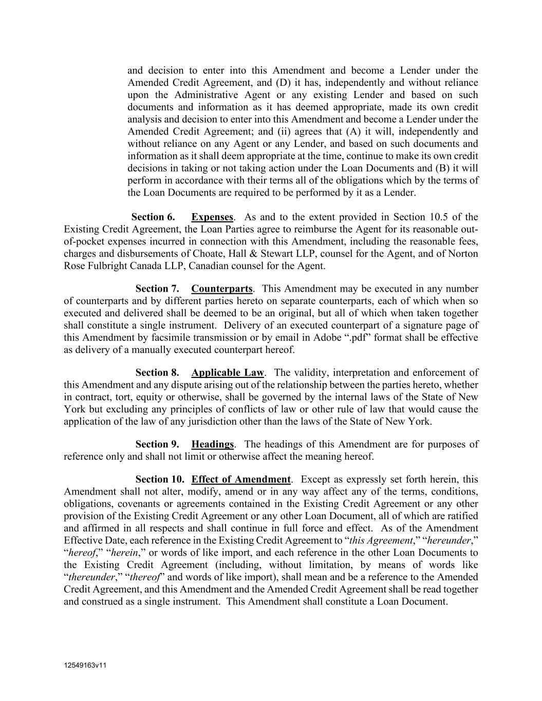 12549163v11 and decision to enter into this Amendment and become a Lender under the Amended Credit Agreement, and (D) it has, independently and without reliance upon the Administrative Agent or any existing Lender and based on such documents and information as it has deemed appropriate, made its own credit analysis and decision to enter into this Amendment and become a Lender under the Amended Credit Agreement; and (ii) agrees that (A) it will, independently and without reliance on any Agent or any Lender, and based on such documents and information as it shall deem appropriate at the time, continue to make its own credit decisions in taking or not taking action under the Loan Documents and (B) it will perform in accordance with their terms all of the obligations which by the terms of the Loan Documents are required to be performed by it as a Lender. Section 6. Expenses. As and to the extent provided in Section 10.5 of the Existing Credit Agreement, the Loan Parties agree to reimburse the Agent for its reasonable out- of-pocket expenses incurred in connection with this Amendment, including the reasonable fees, charges and disbursements of Choate, Hall & Stewart LLP, counsel for the Agent, and of Norton Rose Fulbright Canada LLP, Canadian counsel for the Agent. Section 7. Counterparts. This Amendment may be executed in any number of counterparts and by different parties hereto on separate counterparts, each of which when so executed and delivered shall be deemed to be an original, but all of which when taken together shall constitute a single instrument. Delivery of an executed counterpart of a signature page of this Amendment by facsimile transmission or by email in Adobe “.pdf” format shall be effective as delivery of a manually executed counterpart hereof. Section 8. Applicable Law. The validity, interpretation and enforcement of this Amendment and any dispute arising out of the relationship between the parties hereto, whether in contract, tort, equity or otherwise, shall be governed by the internal laws of the State of New York but excluding any principles of conflicts of law or other rule of law that would cause the application of the law of any jurisdiction other than the laws of the State of New York. Section 9. Headings. The headings of this Amendment are for purposes of reference only and shall not limit or otherwise affect the meaning hereof. Section 10. Effect of Amendment. Except as expressly set forth herein, this Amendment shall not alter, modify, amend or in any way affect any of the terms, conditions, obligations, covenants or agreements contained in the Existing Credit Agreement or any other provision of the Existing Credit Agreement or any other Loan Document, all of which are ratified and affirmed in all respects and shall continue in full force and effect. As of the Amendment Effective Date, each reference in the Existing Credit Agreement to “this Agreement,” “hereunder,” “hereof,” “herein,” or words of like import, and each reference in the other Loan Documents to the Existing Credit Agreement (including, without limitation, by means of words like “thereunder,” “thereof” and words of like import), shall mean and be a reference to the Amended Credit Agreement, and this Amendment and the Amended Credit Agreement shall be read together and construed as a single instrument. This Amendment shall constitute a Loan Document.