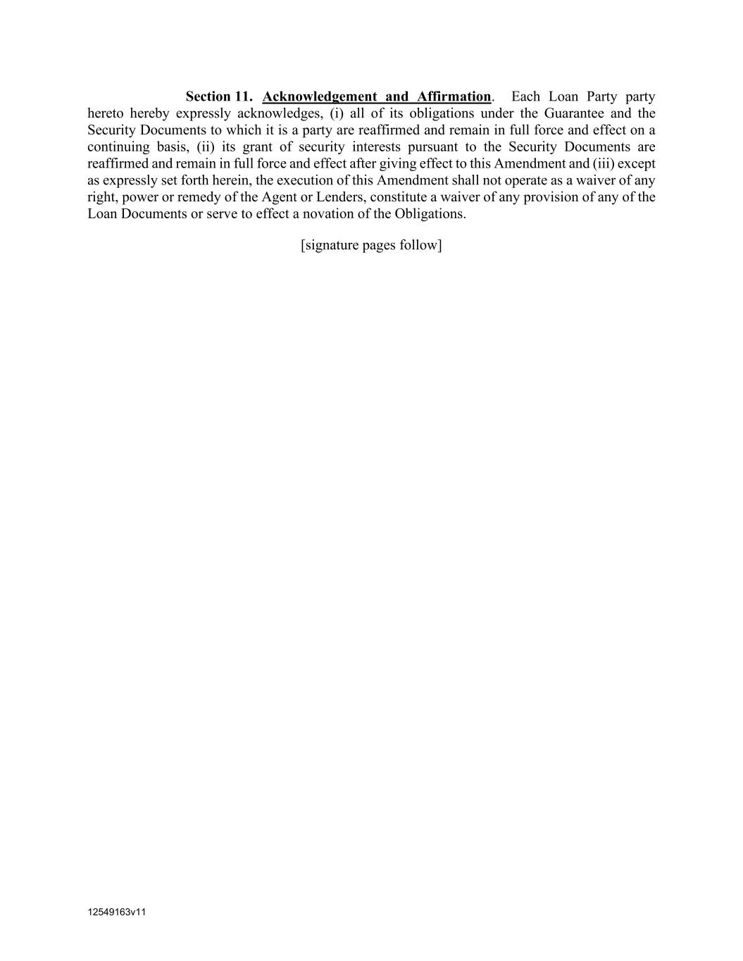 12549163v11 Section 11. Acknowledgement and Affirmation. Each Loan Party party hereto hereby expressly acknowledges, (i) all of its obligations under the Guarantee and the Security Documents to which it is a party are reaffirmed and remain in full force and effect on a continuing basis, (ii) its grant of security interests pursuant to the Security Documents are reaffirmed and remain in full force and effect after giving effect to this Amendment and (iii) except as expressly set forth herein, the execution of this Amendment shall not operate as a waiver of any right, power or remedy of the Agent or Lenders, constitute a waiver of any provision of any of the Loan Documents or serve to effect a novation of the Obligations. [signature pages follow]