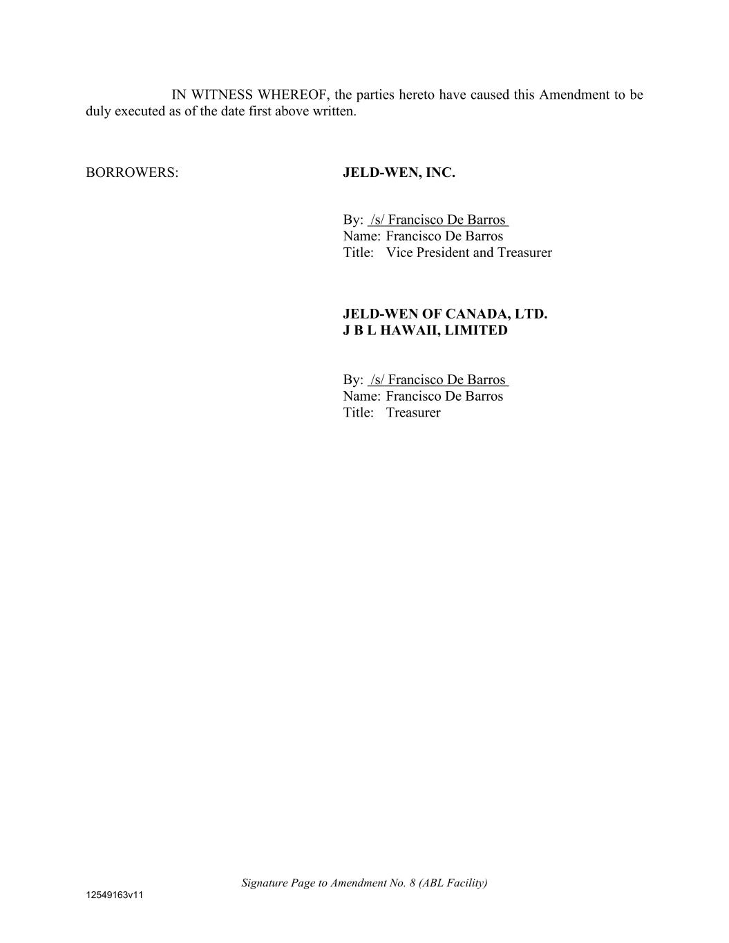 Signature Page to Amendment No. 8 (ABL Facility) 12549163v11 IN WITNESS WHEREOF, the parties hereto have caused this Amendment to be duly executed as of the date first above written. BORROWERS: JELD-WEN, INC. By: /s/ Francisco De Barros Name: Francisco De Barros Title: Vice President and Treasurer JELD-WEN OF CANADA, LTD. J B L HAWAII, LIMITED By: /s/ Francisco De Barros Name: Francisco De Barros Title: Treasurer