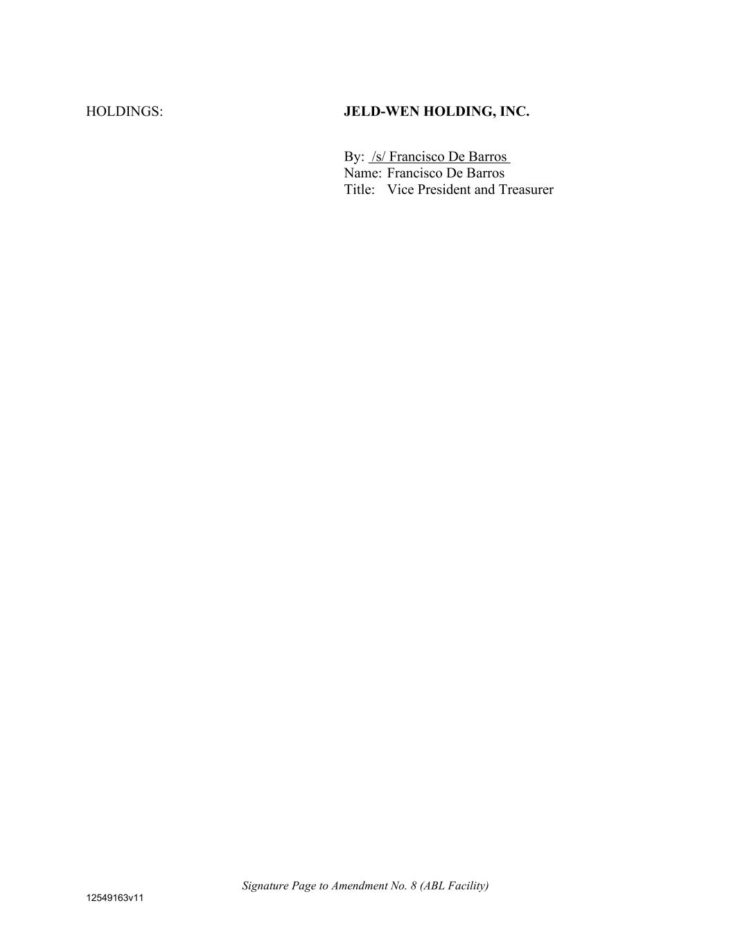 Signature Page to Amendment No. 8 (ABL Facility) 12549163v11 HOLDINGS: JELD-WEN HOLDING, INC. By: /s/ Francisco De Barros Name: Francisco De Barros Title: Vice President and Treasurer