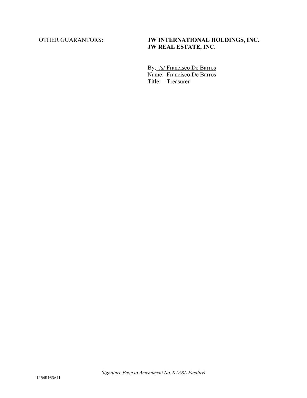 Signature Page to Amendment No. 8 (ABL Facility) 12549163v11 OTHER GUARANTORS: JW INTERNATIONAL HOLDINGS, INC. JW REAL ESTATE, INC. By: /s/ Francisco De Barros Name: Francisco De Barros Title: Treasurer