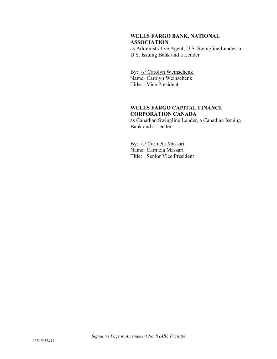 Signature Page to Amendment No. 8 (ABL Facility) 12549163v11 WELLS FARGO BANK, NATIONAL ASSOCIATION, as Administrative Agent, U.S. Swingline Lender, a U.S. Issuing Bank and a Lender By: /s/ Carolyn Weinschenk Name: Carolyn Weinschenk Title: Vice President WELLS FARGO CAPITAL FINANCE CORPORATION CANADA as Canadian Swingline Lender, a Canadian Issuing Bank and a Lender By: /s/ Carmela Massari Name: Carmela Massari Title: Senior Vice President