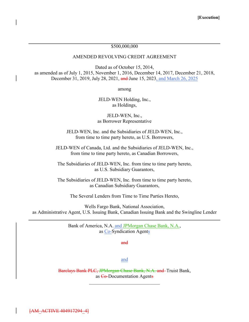 [Execution] $500,000,000 AMENDED REVOLVING CREDIT AGREEMENT Dated as of October 15, 2014, as amended as of July 1, 2015, November 1, 2016, December 14, 2017, December 21, 2018, December 31, 2019, July 28, 2021, and June 15, 2023, and March 26, 2025 among JELD-WEN Holding, Inc., as Holdings, JELD-WEN, Inc., as Borrower Representative JELD-WEN, Inc. and the Subsidiaries of JELD-WEN, Inc., from time to time party hereto, as U.S. Borrowers, JELD-WEN of Canada, Ltd. and the Subsidiaries of JELD-WEN, Inc., from time to time party hereto, as Canadian Borrowers, The Subsidiaries of JELD-WEN, Inc. from time to time party hereto, as U.S. Subsidiary Guarantors, The Subsidiaries of JELD-WEN, Inc. from time to time party hereto, as Canadian Subsidiary Guarantors, The Several Lenders from Time to Time Parties Hereto, Wells Fargo Bank, National Association, as Administrative Agent, U.S. Issuing Bank, Canadian Issuing Bank and the Swingline Lender Bank of America, N.A. and JPMorgan Chase Bank, N.A., as Co-Syndication Agents and and Barclays Bank PLC, JPMorgan Chase Bank, N.A. and Truist Bank, as Co-Documentation Agents _____________________________ [AM_ACTIVE 404917294_4]
