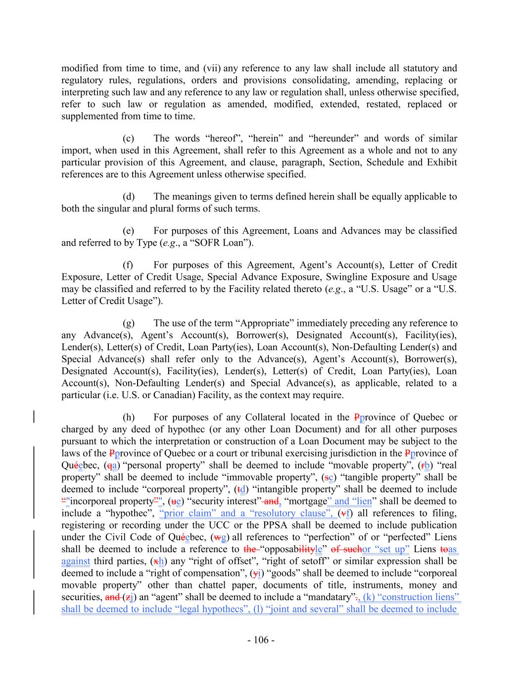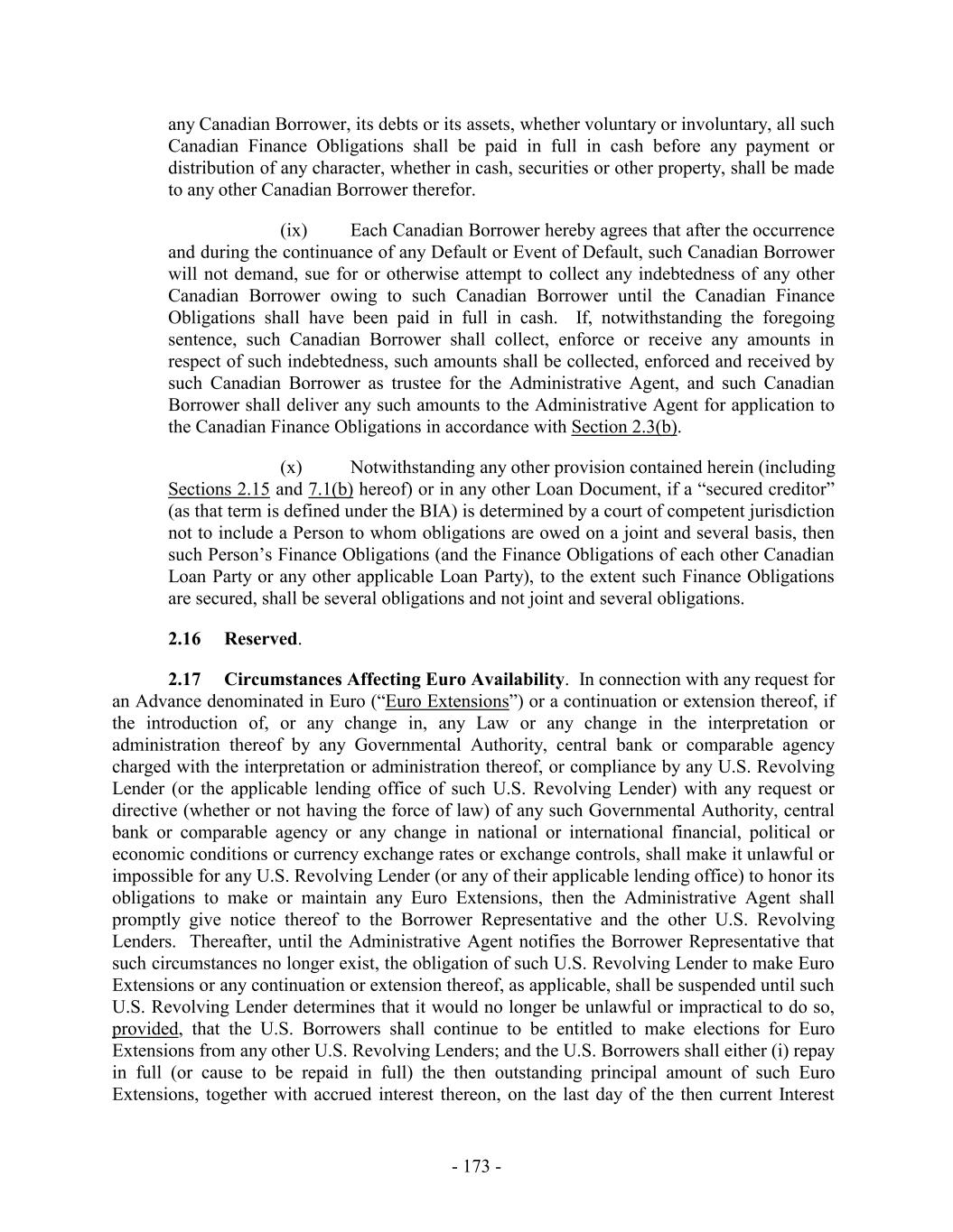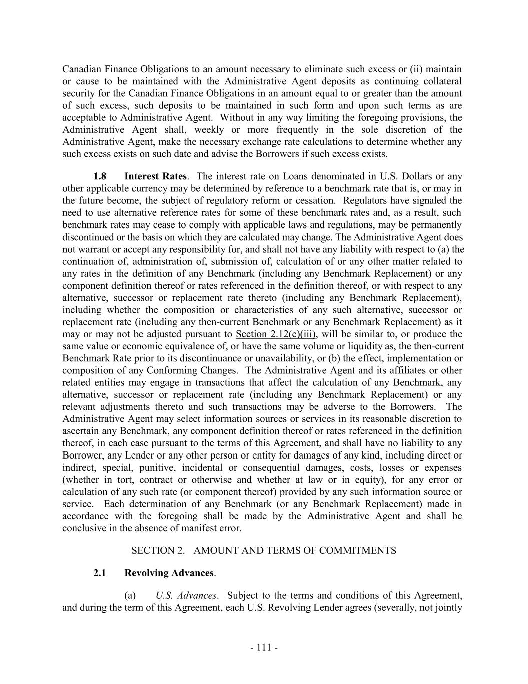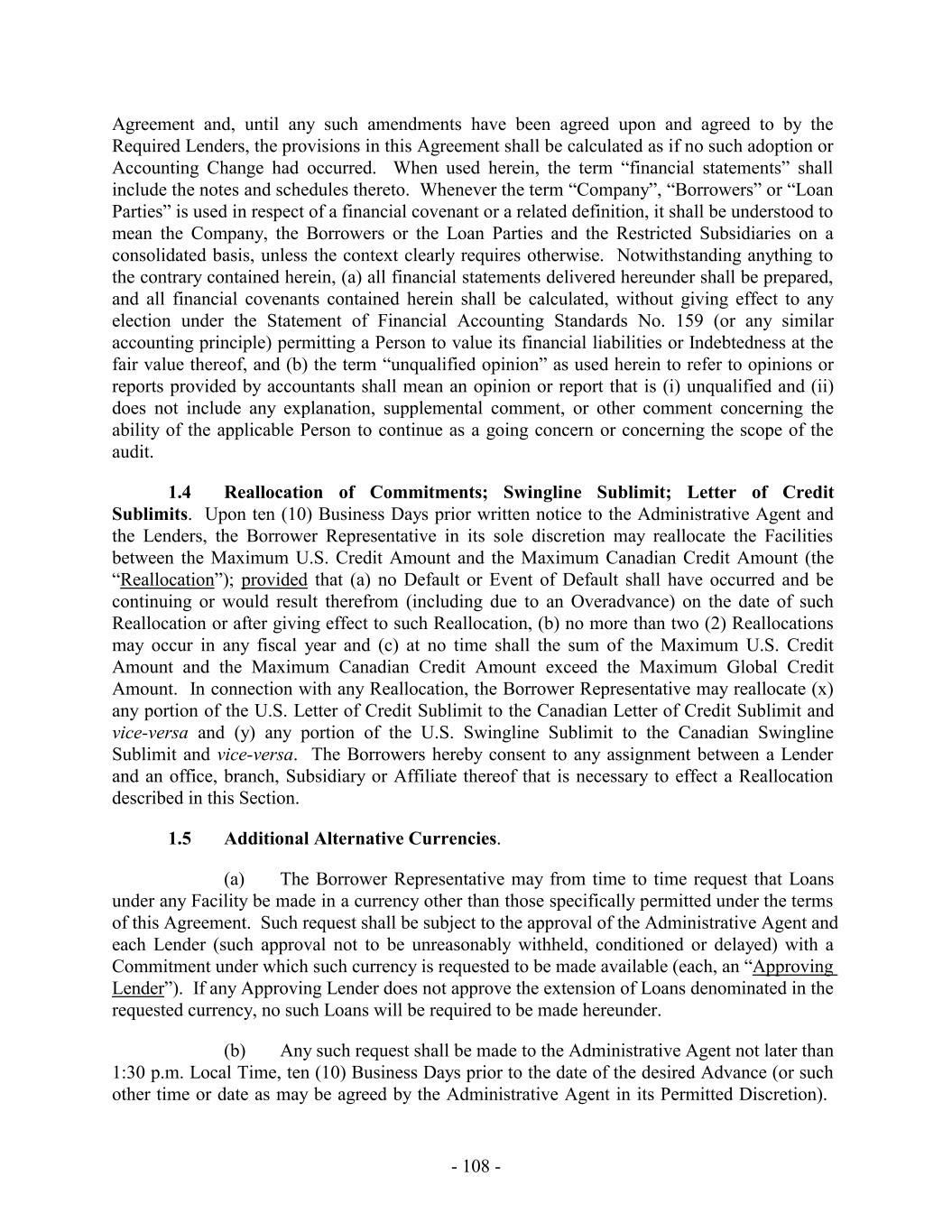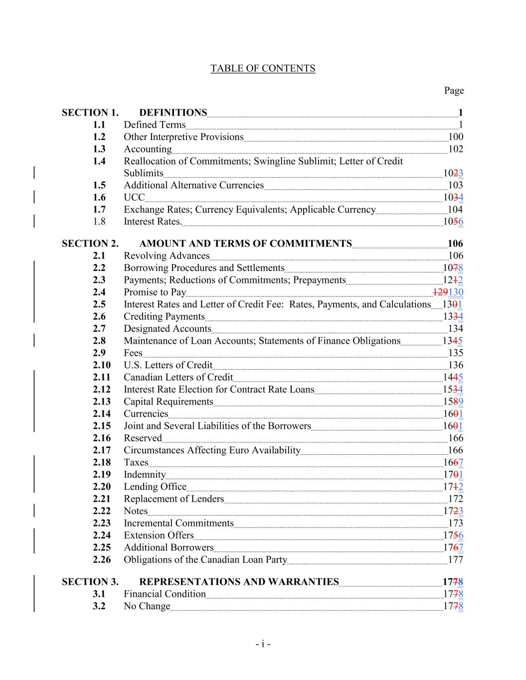 TABLE OF CONTENTS Page SECTION 1. DEFINITIONS 1 1.1 Defined Terms 1 1.2 Other Interpretive Provisions 100 1.3 Accounting 102 1.4 Reallocation of Commitments; Swingline Sublimit; Letter of Credit Sublimits 1023 1.5 Additional Alternative Currencies 103 1.6 UCC 1034 1.7 Exchange Rates; Currency Equivalents; Applicable Currency 104 1.8 Interest Rates. 1056 SECTION 2. AMOUNT AND TERMS OF COMMITMENTS 106 2.1 Revolving Advances 106 2.2 Borrowing Procedures and Settlements 1078 2.3 Payments; Reductions of Commitments; Prepayments 1212 2.4 Promise to Pay 129130 2.5 Interest Rates and Letter of Credit Fee: Rates, Payments, and Calculations 1301 2.6 Crediting Payments 1334 2.7 Designated Accounts 134 2.8 Maintenance of Loan Accounts; Statements of Finance Obligations 1345 2.9 Fees 135 2.10 U.S. Letters of Credit 136 2.11 Canadian Letters of Credit 1445 2.12 Interest Rate Election for Contract Rate Loans 1534 2.13 Capital Requirements 1589 2.14 Currencies 1601 2.15 Joint and Several Liabilities of the Borrowers 1601 2.16 Reserved 166 2.17 Circumstances Affecting Euro Availability 166 2.18 Taxes 1667 2.19 Indemnity 1701 2.20 Lending Office 1712 2.21 Replacement of Lenders 172 2.22 Notes 1723 2.23 Incremental Commitments 173 2.24 Extension Offers 1756 2.25 Additional Borrowers 1767 2.26 Obligations of the Canadian Loan Party 177 SECTION 3. REPRESENTATIONS AND WARRANTIES 1778 3.1 Financial Condition 1778 3.2 No Change 1778 - i -