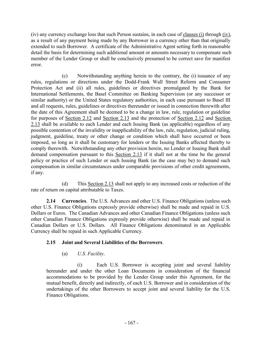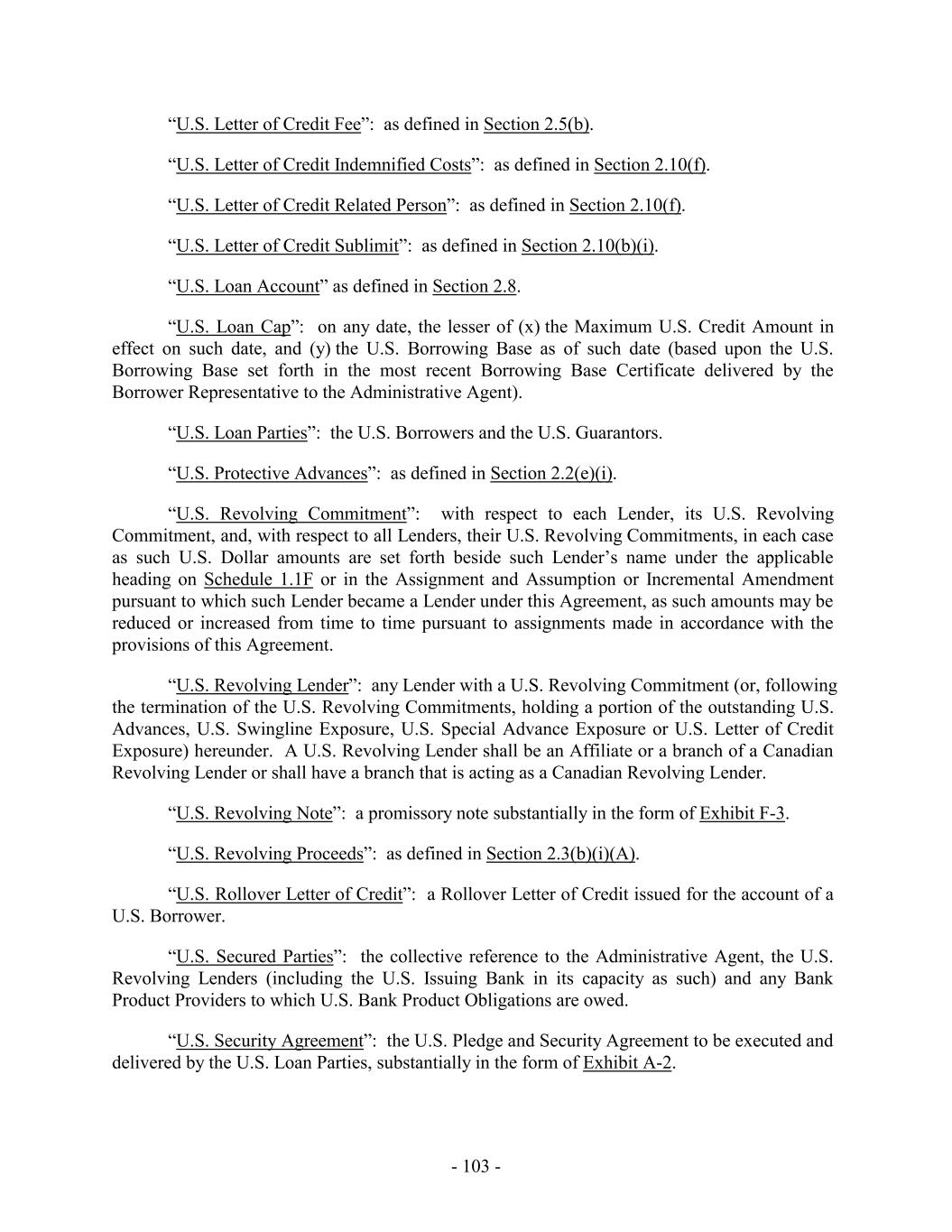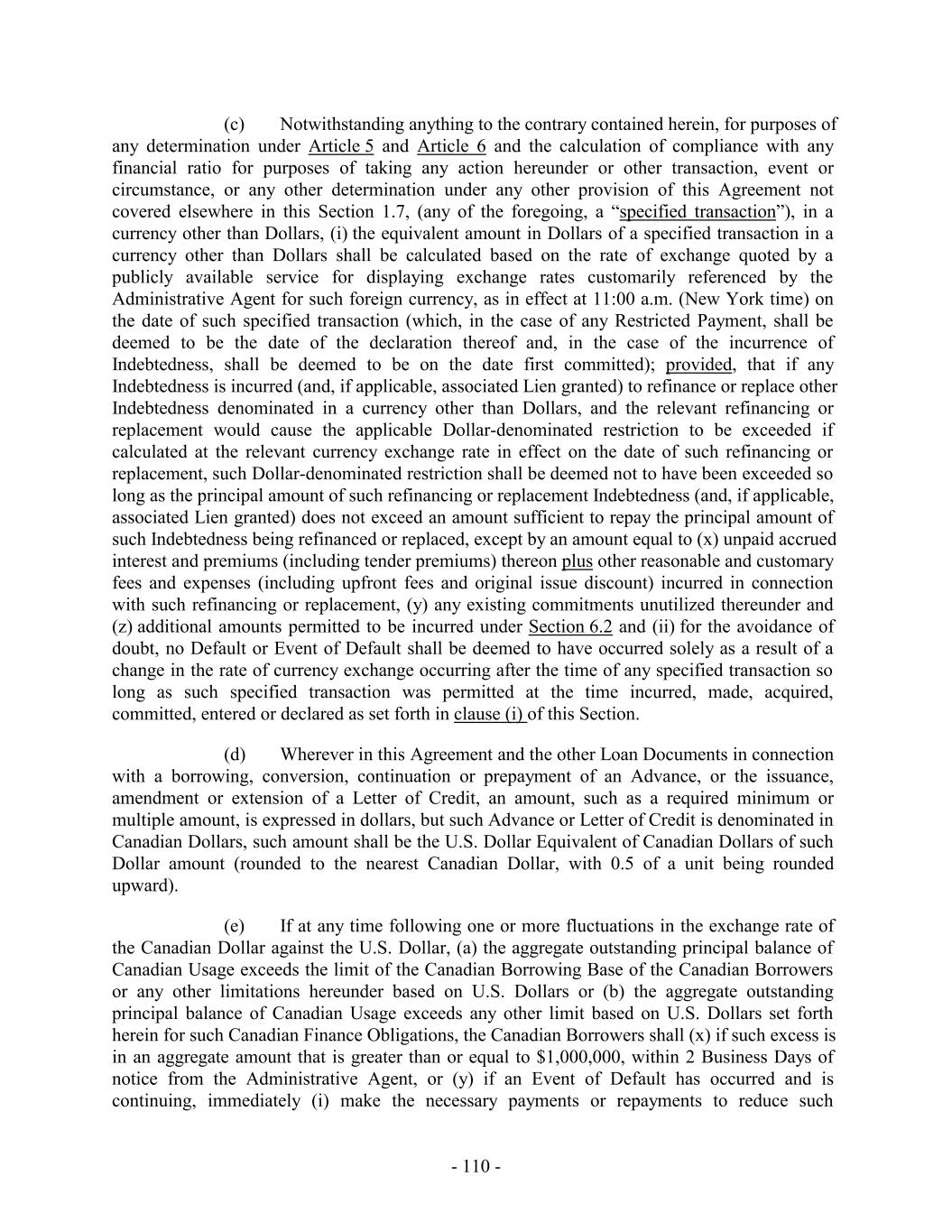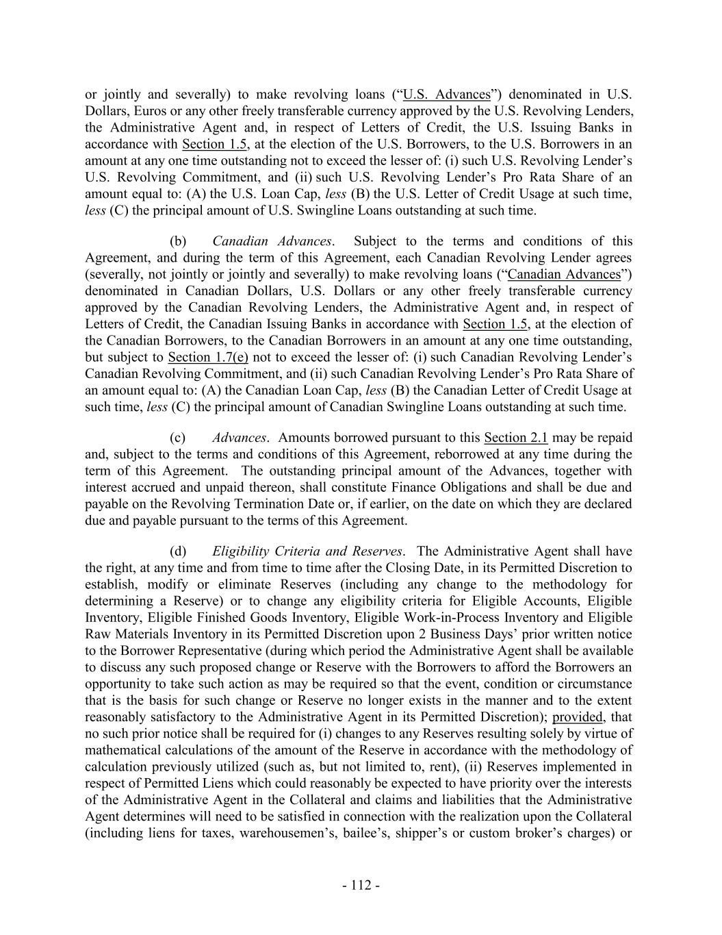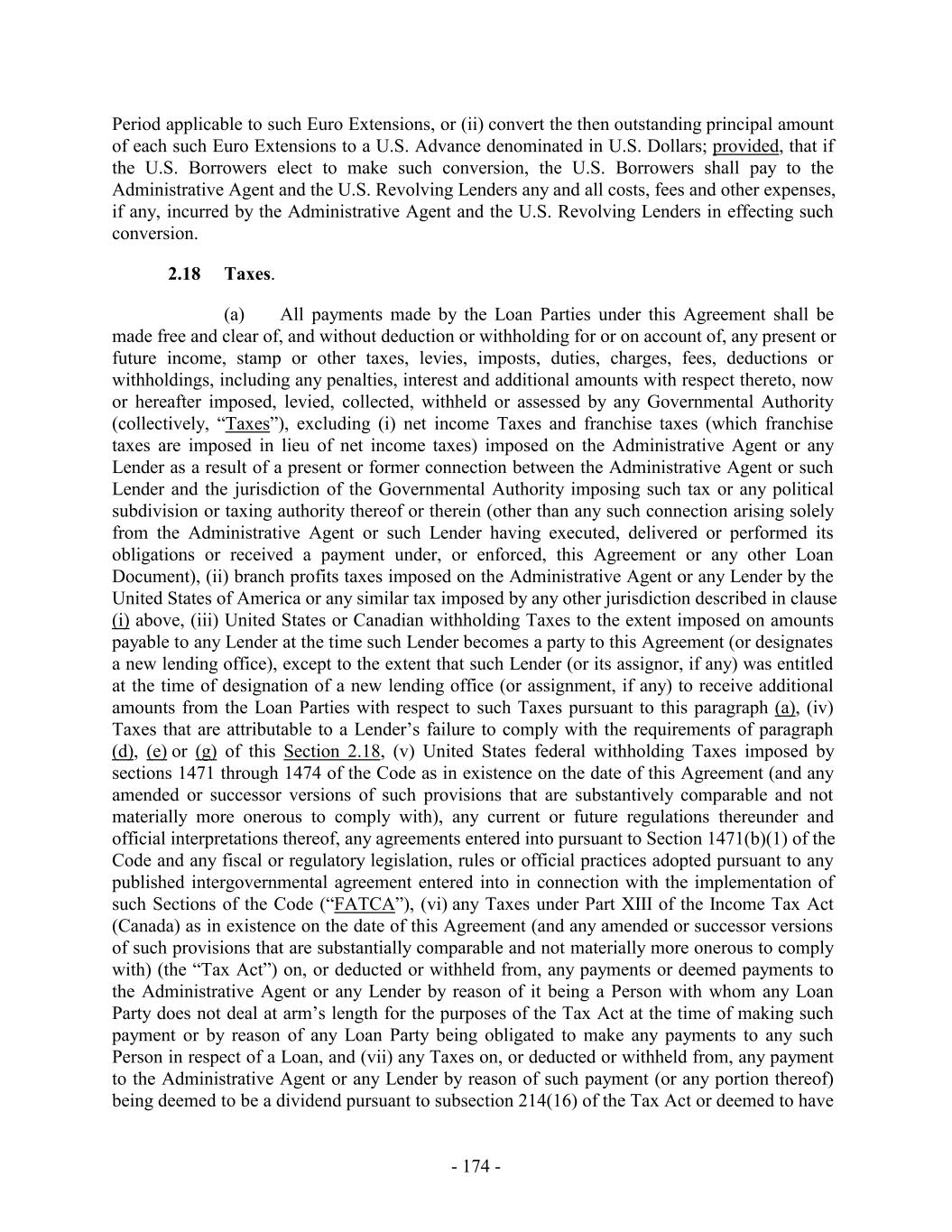 TABLE OF CONTENTS Page SECTION 1. DEFINITIONS 1 1.1 Defined Terms 1 1.2 Other Interpretive Provisions 100 1.3 Accounting 102 1.4 Reallocation of Commitments; Swingline Sublimit; Letter of Credit Sublimits 1023 1.5 Additional Alternative Currencies 103 1.6 UCC 1034 1.7 Exchange Rates; Currency Equivalents; Applicable Currency 104 1.8 Interest Rates. 1056 SECTION 2. AMOUNT AND TERMS OF COMMITMENTS 106 2.1 Revolving Advances 106 2.2 Borrowing Procedures and Settlements 1078 2.3 Payments; Reductions of Commitments; Prepayments 1212 2.4 Promise to Pay 129130 2.5 Interest Rates and Letter of Credit Fee: Rates, Payments, and Calculations 1301 2.6 Crediting Payments 1334 2.7 Designated Accounts 134 2.8 Maintenance of Loan Accounts; Statements of Finance Obligations 1345 2.9 Fees 135 2.10 U.S. Letters of Credit 136 2.11 Canadian Letters of Credit 1445 2.12 Interest Rate Election for Contract Rate Loans 1534 2.13 Capital Requirements 1589 2.14 Currencies 1601 2.15 Joint and Several Liabilities of the Borrowers 1601 2.16 Reserved 166 2.17 Circumstances Affecting Euro Availability 166 2.18 Taxes 1667 2.19 Indemnity 1701 2.20 Lending Office 1712 2.21 Replacement of Lenders 172 2.22 Notes 1723 2.23 Incremental Commitments 173 2.24 Extension Offers 1756 2.25 Additional Borrowers 1767 2.26 Obligations of the Canadian Loan Party 177 SECTION 3. REPRESENTATIONS AND WARRANTIES 1778 3.1 Financial Condition 1778 3.2 No Change 1778 - i -