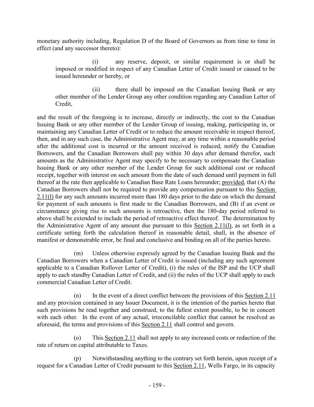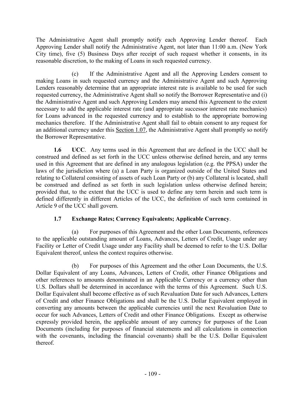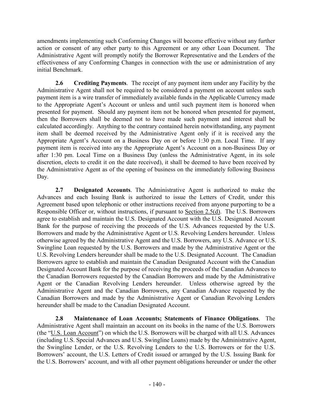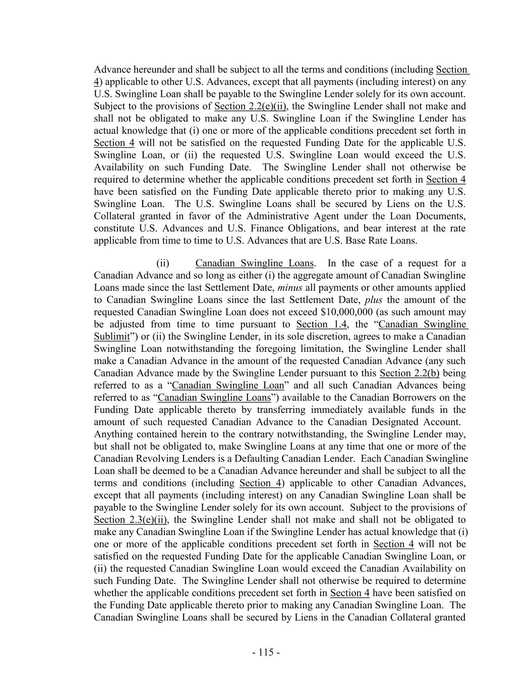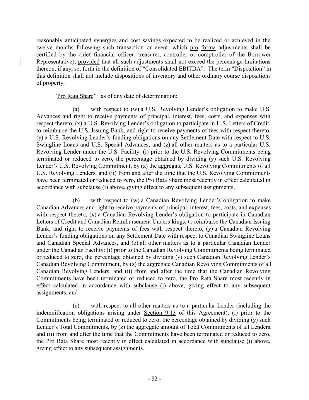 TABLE OF CONTENTS Page SECTION 1. DEFINITIONS 1 1.1 Defined Terms 1 1.2 Other Interpretive Provisions 100 1.3 Accounting 102 1.4 Reallocation of Commitments; Swingline Sublimit; Letter of Credit Sublimits 1023 1.5 Additional Alternative Currencies 103 1.6 UCC 1034 1.7 Exchange Rates; Currency Equivalents; Applicable Currency 104 1.8 Interest Rates. 1056 SECTION 2. AMOUNT AND TERMS OF COMMITMENTS 106 2.1 Revolving Advances 106 2.2 Borrowing Procedures and Settlements 1078 2.3 Payments; Reductions of Commitments; Prepayments 1212 2.4 Promise to Pay 129130 2.5 Interest Rates and Letter of Credit Fee: Rates, Payments, and Calculations 1301 2.6 Crediting Payments 1334 2.7 Designated Accounts 134 2.8 Maintenance of Loan Accounts; Statements of Finance Obligations 1345 2.9 Fees 135 2.10 U.S. Letters of Credit 136 2.11 Canadian Letters of Credit 1445 2.12 Interest Rate Election for Contract Rate Loans 1534 2.13 Capital Requirements 1589 2.14 Currencies 1601 2.15 Joint and Several Liabilities of the Borrowers 1601 2.16 Reserved 166 2.17 Circumstances Affecting Euro Availability 166 2.18 Taxes 1667 2.19 Indemnity 1701 2.20 Lending Office 1712 2.21 Replacement of Lenders 172 2.22 Notes 1723 2.23 Incremental Commitments 173 2.24 Extension Offers 1756 2.25 Additional Borrowers 1767 2.26 Obligations of the Canadian Loan Party 177 SECTION 3. REPRESENTATIONS AND WARRANTIES 1778 3.1 Financial Condition 1778 3.2 No Change 1778 - i -