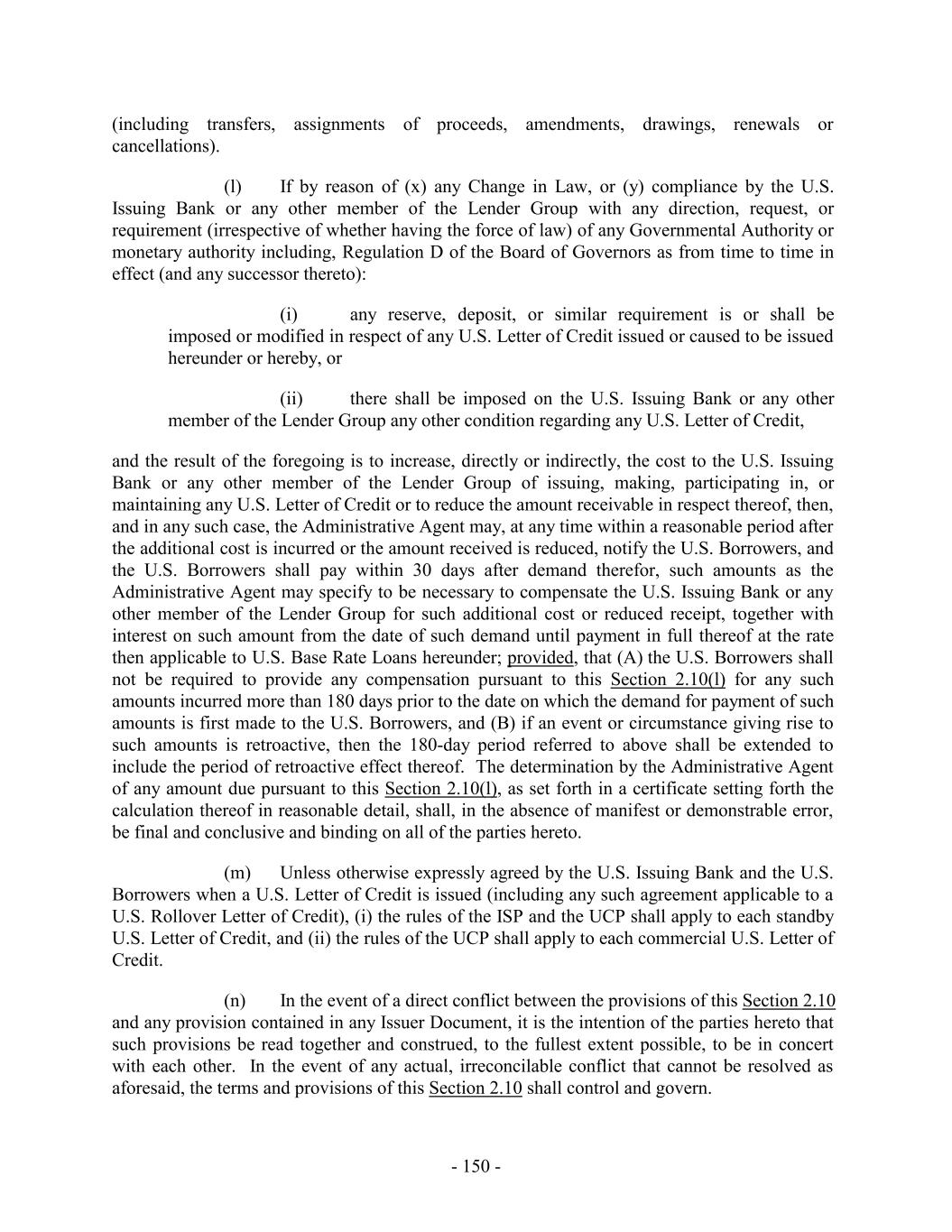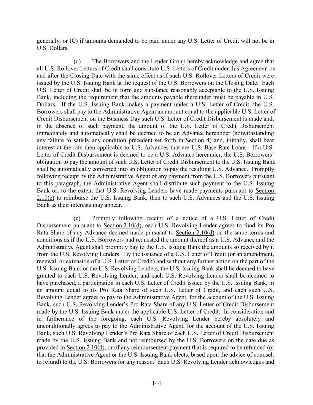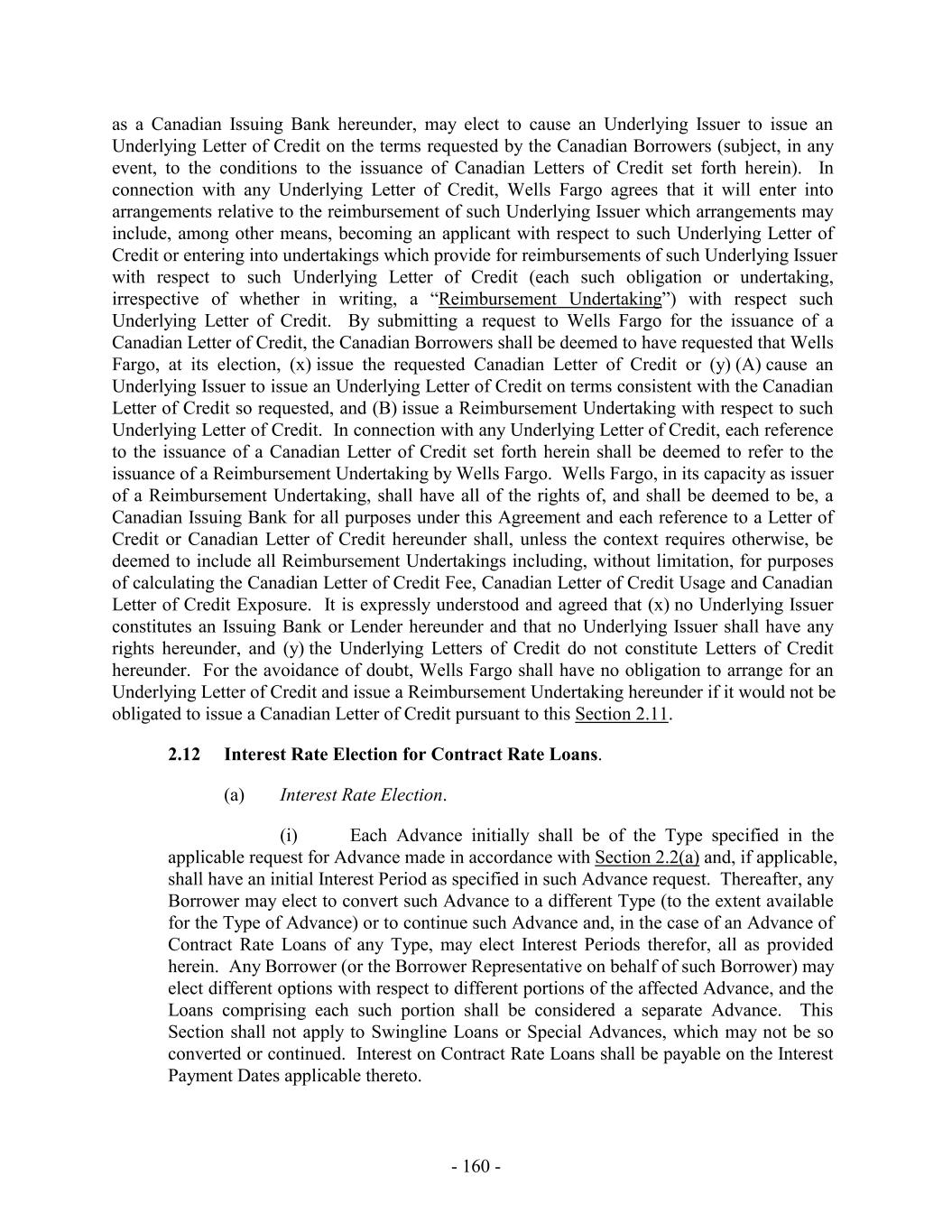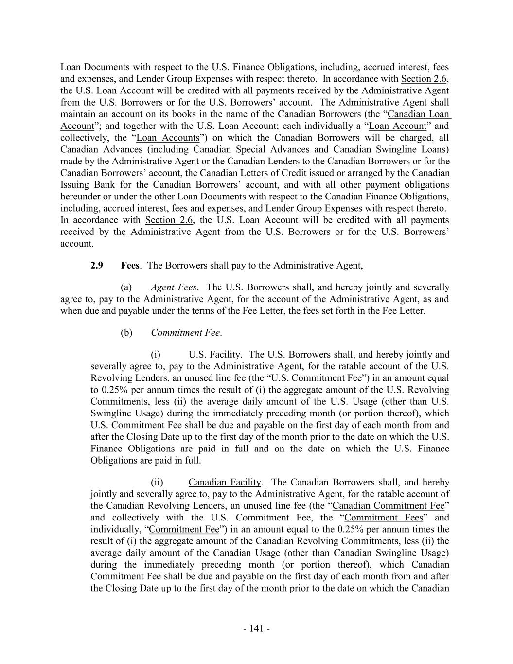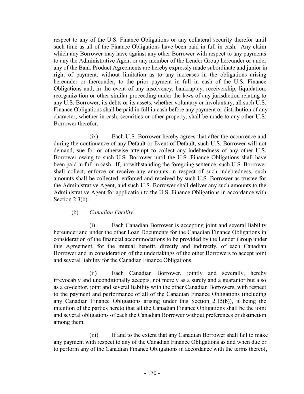 TABLE OF CONTENTS Page SECTION 1. DEFINITIONS 1 1.1 Defined Terms 1 1.2 Other Interpretive Provisions 100 1.3 Accounting 102 1.4 Reallocation of Commitments; Swingline Sublimit; Letter of Credit Sublimits 1023 1.5 Additional Alternative Currencies 103 1.6 UCC 1034 1.7 Exchange Rates; Currency Equivalents; Applicable Currency 104 1.8 Interest Rates. 1056 SECTION 2. AMOUNT AND TERMS OF COMMITMENTS 106 2.1 Revolving Advances 106 2.2 Borrowing Procedures and Settlements 1078 2.3 Payments; Reductions of Commitments; Prepayments 1212 2.4 Promise to Pay 129130 2.5 Interest Rates and Letter of Credit Fee: Rates, Payments, and Calculations 1301 2.6 Crediting Payments 1334 2.7 Designated Accounts 134 2.8 Maintenance of Loan Accounts; Statements of Finance Obligations 1345 2.9 Fees 135 2.10 U.S. Letters of Credit 136 2.11 Canadian Letters of Credit 1445 2.12 Interest Rate Election for Contract Rate Loans 1534 2.13 Capital Requirements 1589 2.14 Currencies 1601 2.15 Joint and Several Liabilities of the Borrowers 1601 2.16 Reserved 166 2.17 Circumstances Affecting Euro Availability 166 2.18 Taxes 1667 2.19 Indemnity 1701 2.20 Lending Office 1712 2.21 Replacement of Lenders 172 2.22 Notes 1723 2.23 Incremental Commitments 173 2.24 Extension Offers 1756 2.25 Additional Borrowers 1767 2.26 Obligations of the Canadian Loan Party 177 SECTION 3. REPRESENTATIONS AND WARRANTIES 1778 3.1 Financial Condition 1778 3.2 No Change 1778 - i -