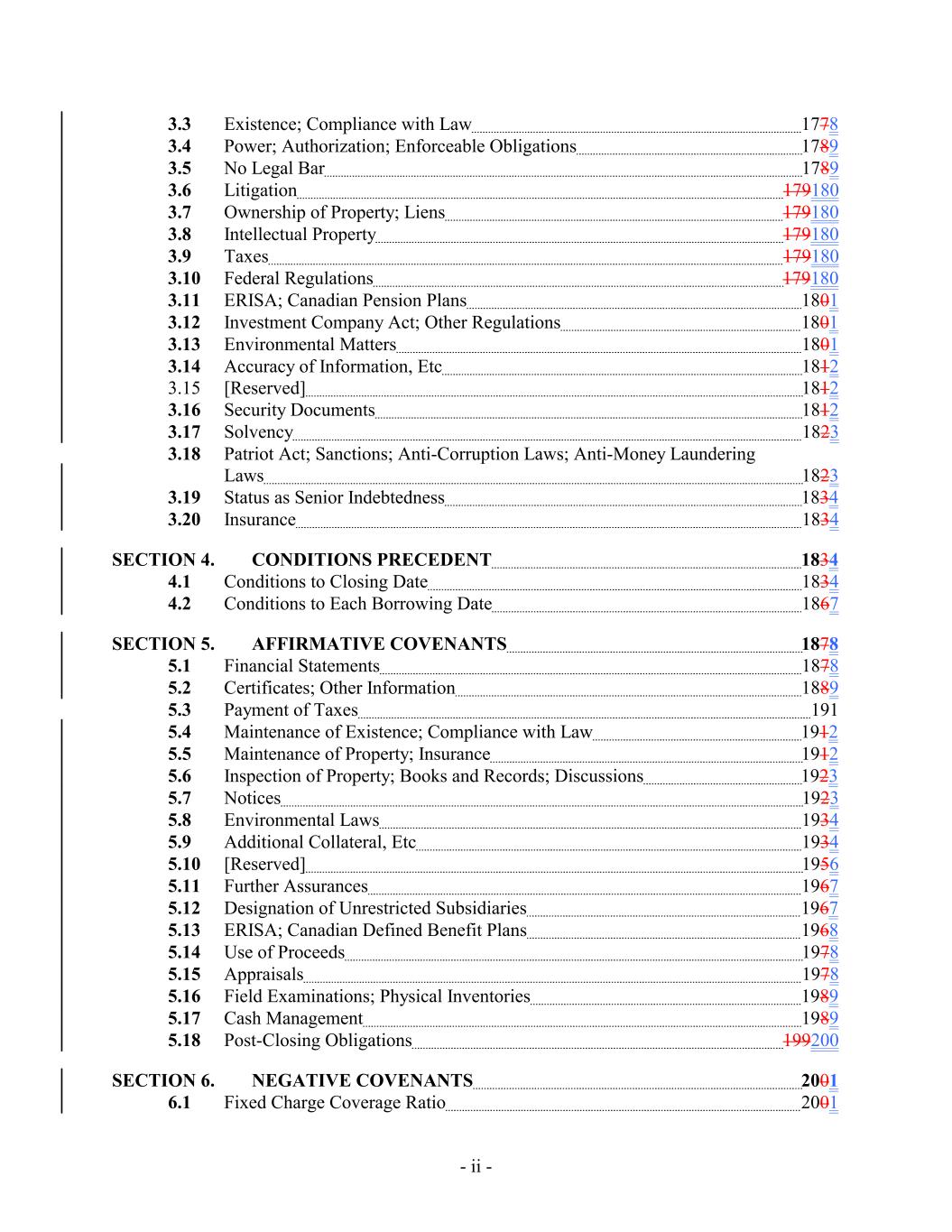 3.3 Existence; Compliance with Law 1778 3.4 Power; Authorization; Enforceable Obligations 1789 3.5 No Legal Bar 1789 3.6 Litigation 179180 3.7 Ownership of Property; Liens 179180 3.8 Intellectual Property 179180 3.9 Taxes 179180 3.10 Federal Regulations 179180 3.11 ERISA; Canadian Pension Plans 1801 3.12 Investment Company Act; Other Regulations 1801 3.13 Environmental Matters 1801 3.14 Accuracy of Information, Etc 1812 3.15 [Reserved] 1812 3.16 Security Documents 1812 3.17 Solvency 1823 3.18 Patriot Act; Sanctions; Anti-Corruption Laws; Anti-Money Laundering Laws 1823 3.19 Status as Senior Indebtedness 1834 3.20 Insurance 1834 SECTION 4. CONDITIONS PRECEDENT 1834 4.1 Conditions to Closing Date 1834 4.2 Conditions to Each Borrowing Date 1867 SECTION 5. AFFIRMATIVE COVENANTS 1878 5.1 Financial Statements 1878 5.2 Certificates; Other Information 1889 5.3 Payment of Taxes 191 5.4 Maintenance of Existence; Compliance with Law 1912 5.5 Maintenance of Property; Insurance 1912 5.6 Inspection of Property; Books and Records; Discussions 1923 5.7 Notices 1923 5.8 Environmental Laws 1934 5.9 Additional Collateral, Etc 1934 5.10 [Reserved] 1956 5.11 Further Assurances 1967 5.12 Designation of Unrestricted Subsidiaries 1967 5.13 ERISA; Canadian Defined Benefit Plans 1968 5.14 Use of Proceeds 1978 5.15 Appraisals 1978 5.16 Field Examinations; Physical Inventories 1989 5.17 Cash Management 1989 5.18 Post-Closing Obligations 199200 SECTION 6. NEGATIVE COVENANTS 2001 6.1 Fixed Charge Coverage Ratio 2001 - ii -