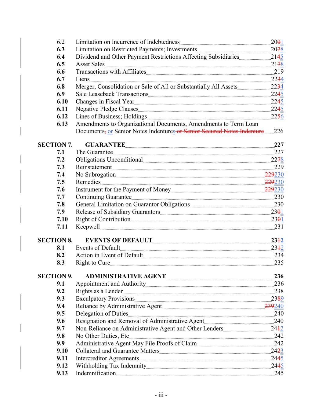 6.2 Limitation on Incurrence of Indebtedness 2001 6.3 Limitation on Restricted Payments; Investments 2078 6.4 Dividend and Other Payment Restrictions Affecting Subsidiaries 2145 6.5 Asset Sales 2178 6.6 Transactions with Affiliates 219 6.7 Liens 2234 6.8 Merger, Consolidation or Sale of All or Substantially All Assets 2234 6.9 Sale Leaseback Transactions 2245 6.10 Changes in Fiscal Year 2245 6.11 Negative Pledge Clauses 2245 6.12 Lines of Business; Holdings 2256 6.13 Amendments to Organizational Documents, Amendments to Term Loan Documents, or Senior Notes Indentures or Senior Secured Notes Indenture 226 SECTION 7. GUARANTEE 227 7.1 The Guarantee 227 7.2 Obligations Unconditional 2278 7.3 Reinstatement 229 7.4 No Subrogation 229230 7.5 Remedies 229230 7.6 Instrument for the Payment of Money 229230 7.7 Continuing Guarantee 230 7.8 General Limitation on Guarantor Obligations 230 7.9 Release of Subsidiary Guarantors 2301 7.10 Right of Contribution 2301 7.11 Keepwell 231 SECTION 8. EVENTS OF DEFAULT 2312 8.1 Events of Default 2312 8.2 Action in Event of Default 234 8.3 Right to Cure 235 SECTION 9. ADMINISTRATIVE AGENT 236 9.1 Appointment and Authority 236 9.2 Rights as a Lender 238 9.3 Exculpatory Provisions 2389 9.4 Reliance by Administrative Agent 239240 9.5 Delegation of Duties 240 9.6 Resignation and Removal of Administrative Agent 240 9.7 Non-Reliance on Administrative Agent and Other Lenders 2412 9.8 No Other Duties, Etc 242 9.9 Administrative Agent May File Proofs of Claim 242 9.10 Collateral and Guarantee Matters 2423 9.11 Intercreditor Agreements 2445 9.12 Withholding Tax Indemnity 2445 9.13 Indemnification 245 - iii -