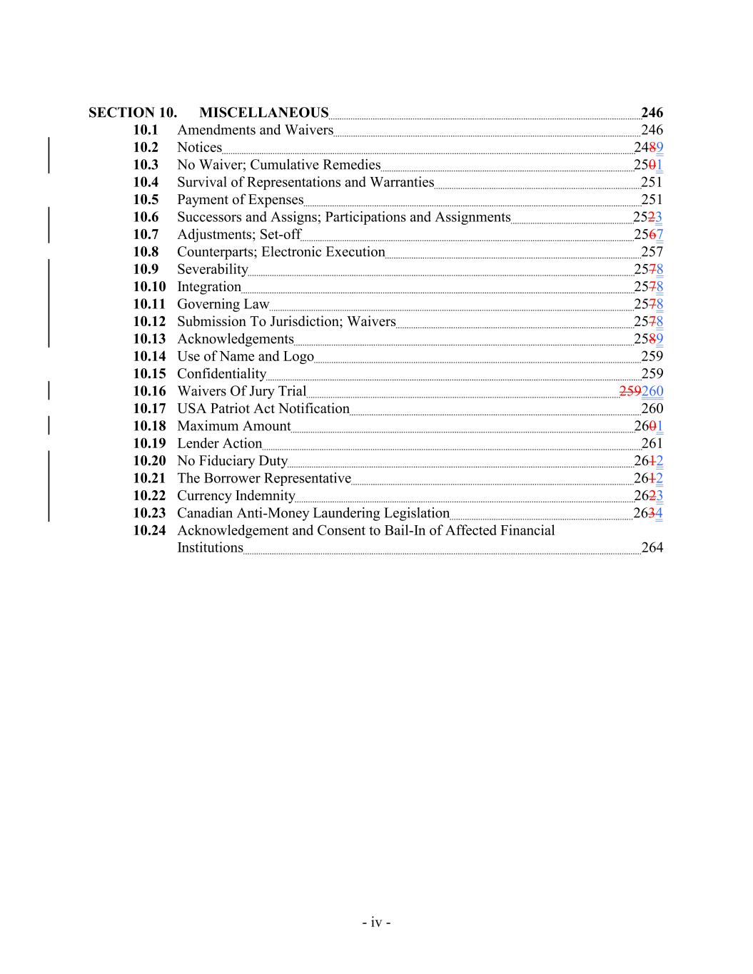 SECTION 10. MISCELLANEOUS 246 10.1 Amendments and Waivers 246 10.2 Notices 2489 10.3 No Waiver; Cumulative Remedies 2501 10.4 Survival of Representations and Warranties 251 10.5 Payment of Expenses 251 10.6 Successors and Assigns; Participations and Assignments 2523 10.7 Adjustments; Set-off 2567 10.8 Counterparts; Electronic Execution 257 10.9 Severability 2578 10.10 Integration 2578 10.11 Governing Law 2578 10.12 Submission To Jurisdiction; Waivers 2578 10.13 Acknowledgements 2589 10.14 Use of Name and Logo 259 10.15 Confidentiality 259 10.16 Waivers Of Jury Trial 259260 10.17 USA Patriot Act Notification 260 10.18 Maximum Amount 2601 10.19 Lender Action 261 10.20 No Fiduciary Duty 2612 10.21 The Borrower Representative 2612 10.22 Currency Indemnity 2623 10.23 Canadian Anti-Money Laundering Legislation 2634 10.24 Acknowledgement and Consent to Bail-In of Affected Financial Institutions 264 - iv -