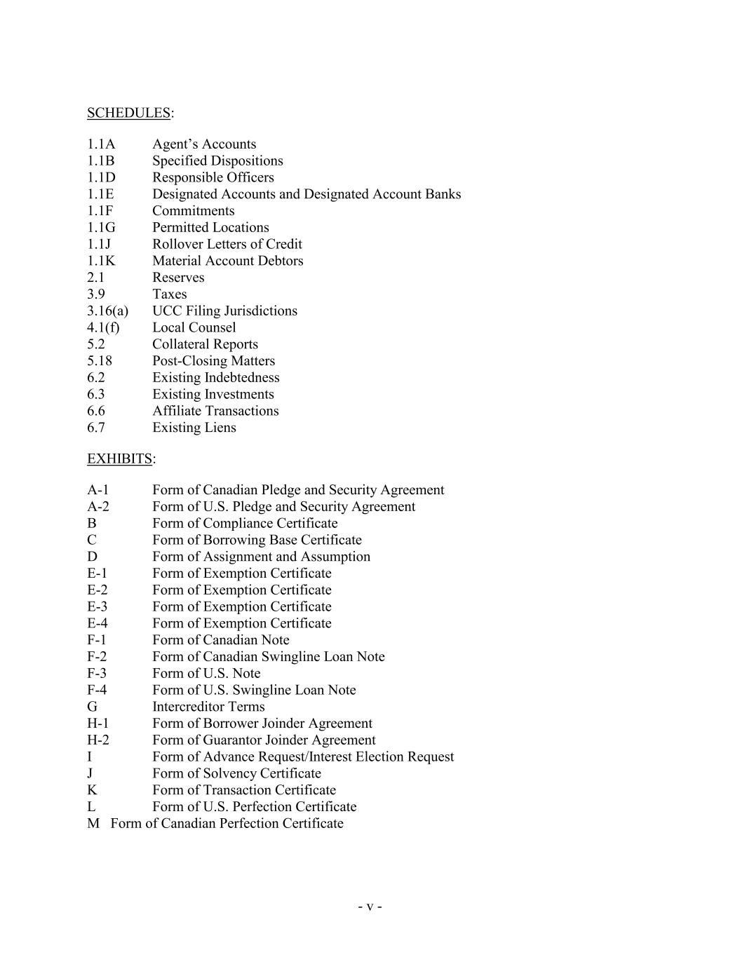 SCHEDULES: 1.1A Agent’s Accounts 1.1B Specified Dispositions 1.1D Responsible Officers 1.1E Designated Accounts and Designated Account Banks 1.1F Commitments 1.1G Permitted Locations 1.1J Rollover Letters of Credit 1.1K Material Account Debtors 2.1 Reserves 3.9 Taxes 3.16(a) UCC Filing Jurisdictions 4.1(f) Local Counsel 5.2 Collateral Reports 5.18 Post-Closing Matters 6.2 Existing Indebtedness 6.3 Existing Investments 6.6 Affiliate Transactions 6.7 Existing Liens EXHIBITS: A-1 Form of Canadian Pledge and Security Agreement A-2 Form of U.S. Pledge and Security Agreement B Form of Compliance Certificate C Form of Borrowing Base Certificate D Form of Assignment and Assumption E-1 Form of Exemption Certificate E-2 Form of Exemption Certificate E-3 Form of Exemption Certificate E-4 Form of Exemption Certificate F-1 Form of Canadian Note F-2 Form of Canadian Swingline Loan Note F-3 Form of U.S. Note F-4 Form of U.S. Swingline Loan Note G Intercreditor Terms H-1 Form of Borrower Joinder Agreement H-2 Form of Guarantor Joinder Agreement I Form of Advance Request/Interest Election Request J Form of Solvency Certificate K Form of Transaction Certificate L Form of U.S. Perfection Certificate M Form of Canadian Perfection Certificate - v -