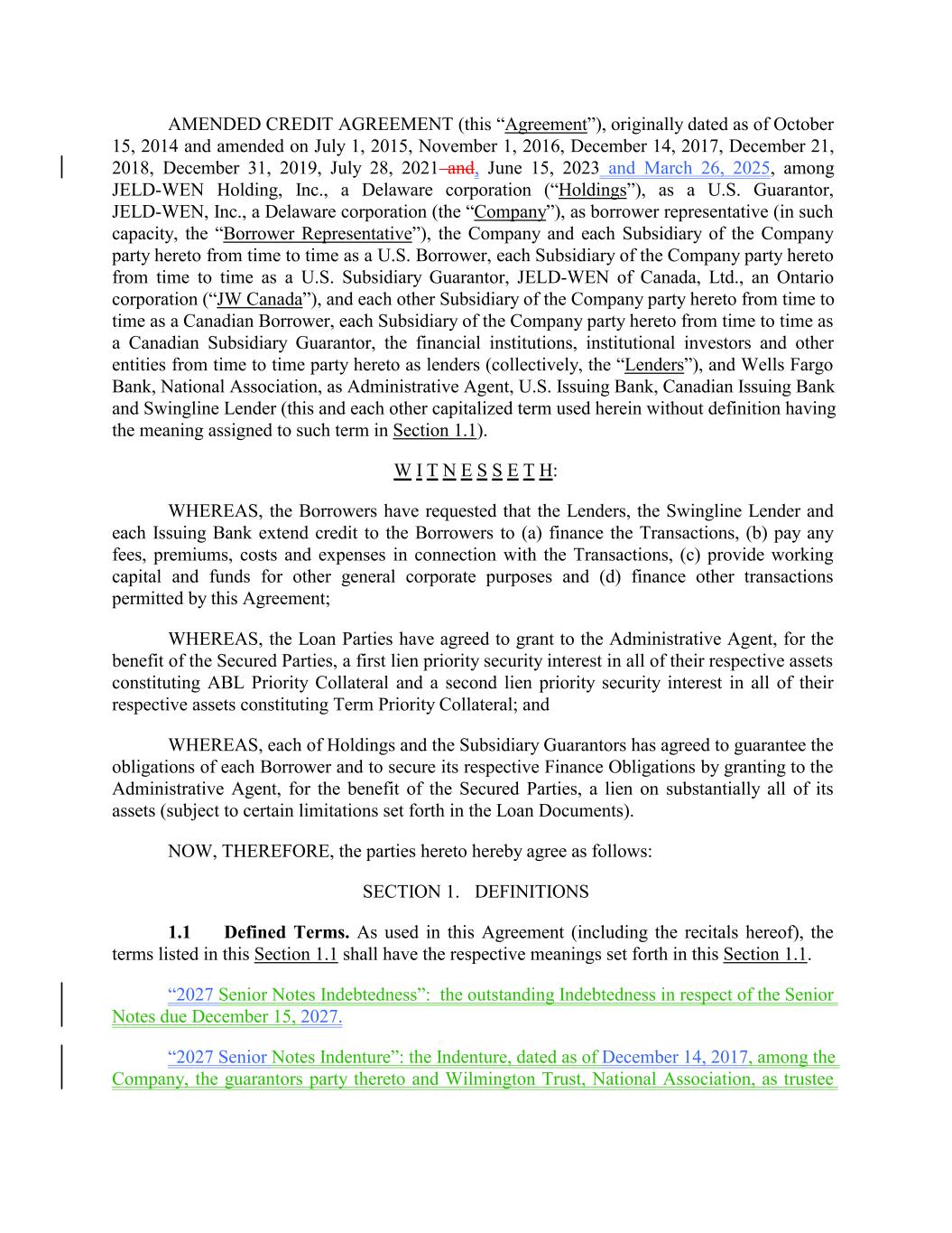 AMENDED CREDIT AGREEMENT (this “Agreement”), originally dated as of October 15, 2014 and amended on July 1, 2015, November 1, 2016, December 14, 2017, December 21, 2018, December 31, 2019, July 28, 2021 and, June 15, 2023 and March 26, 2025, among JELD-WEN Holding, Inc., a Delaware corporation (“Holdings”), as a U.S. Guarantor, JELD-WEN, Inc., a Delaware corporation (the “Company”), as borrower representative (in such capacity, the “Borrower Representative”), the Company and each Subsidiary of the Company party hereto from time to time as a U.S. Borrower, each Subsidiary of the Company party hereto from time to time as a U.S. Subsidiary Guarantor, JELD-WEN of Canada, Ltd., an Ontario corporation (“JW Canada”), and each other Subsidiary of the Company party hereto from time to time as a Canadian Borrower, each Subsidiary of the Company party hereto from time to time as a Canadian Subsidiary Guarantor, the financial institutions, institutional investors and other entities from time to time party hereto as lenders (collectively, the “Lenders”), and Wells Fargo Bank, National Association, as Administrative Agent, U.S. Issuing Bank, Canadian Issuing Bank and Swingline Lender (this and each other capitalized term used herein without definition having the meaning assigned to such term in Section 1.1). W I T N E S S E T H: WHEREAS, the Borrowers have requested that the Lenders, the Swingline Lender and each Issuing Bank extend credit to the Borrowers to (a) finance the Transactions, (b) pay any fees, premiums, costs and expenses in connection with the Transactions, (c) provide working capital and funds for other general corporate purposes and (d) finance other transactions permitted by this Agreement; WHEREAS, the Loan Parties have agreed to grant to the Administrative Agent, for the benefit of the Secured Parties, a first lien priority security interest in all of their respective assets constituting ABL Priority Collateral and a second lien priority security interest in all of their respective assets constituting Term Priority Collateral; and WHEREAS, each of Holdings and the Subsidiary Guarantors has agreed to guarantee the obligations of each Borrower and to secure its respective Finance Obligations by granting to the Administrative Agent, for the benefit of the Secured Parties, a lien on substantially all of its assets (subject to certain limitations set forth in the Loan Documents). NOW, THEREFORE, the parties hereto hereby agree as follows: SECTION 1. DEFINITIONS 1.1 Defined Terms. As used in this Agreement (including the recitals hereof), the terms listed in this Section 1.1 shall have the respective meanings set forth in this Section 1.1. “2027 Senior Notes Indebtedness”: the outstanding Indebtedness in respect of the Senior Notes due December 15, 2027. “2027 Senior Notes Indenture”: the Indenture, dated as of December 14, 2017, among the Company, the guarantors party thereto and Wilmington Trust, National Association, as trustee