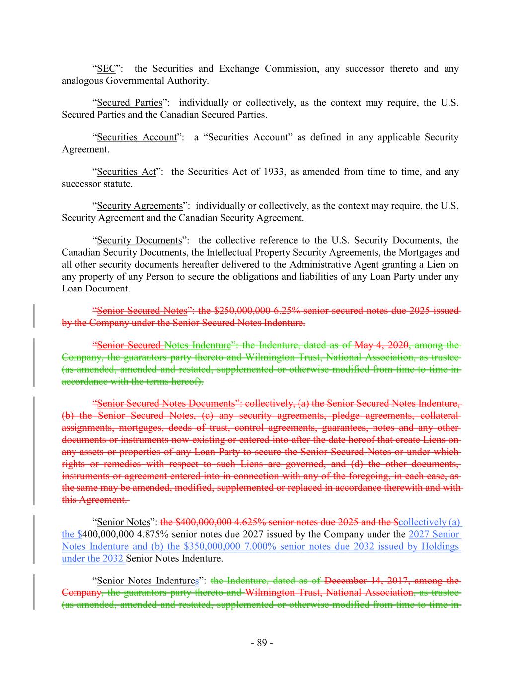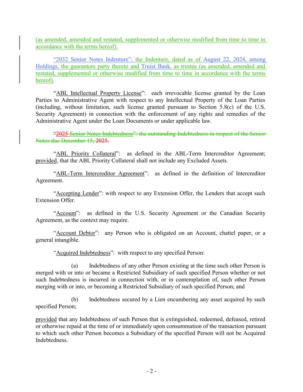 (as amended, amended and restated, supplemented or otherwise modified from time to time in accordance with the terms hereof). “2032 Senior Notes Indenture”: the Indenture, dated as of August 22, 2024, among Holdings, the guarantors party thereto and Truist Bank, as trustee (as amended, amended and restated, supplemented or otherwise modified from time to time in accordance with the terms hereof). “ABL Intellectual Property License”: each irrevocable license granted by the Loan Parties to Administrative Agent with respect to any Intellectual Property of the Loan Parties (including, without limitation, such license granted pursuant to Section 5.8(c) of the U.S. Security Agreement) in connection with the enforcement of any rights and remedies of the Administrative Agent under the Loan Documents or under applicable law. “2025 Senior Notes Indebtedness”: the outstanding Indebtedness in respect of the Senior Notes due December 15, 2025. “ABL Priority Collateral”: as defined in the ABL-Term Intercreditor Agreement; provided, that the ABL Priority Collateral shall not include any Excluded Assets. “ABL-Term Intercreditor Agreement”: as defined in the definition of Intercreditor Agreement. “Accepting Lender”: with respect to any Extension Offer, the Lenders that accept such Extension Offer. “Account”: as defined in the U.S. Security Agreement or the Canadian Security Agreement, as the context may require. “Account Debtor”: any Person who is obligated on an Account, chattel paper, or a general intangible. “Acquired Indebtedness”: with respect to any specified Person: (a) Indebtedness of any other Person existing at the time such other Person is merged with or into or became a Restricted Subsidiary of such specified Person whether or not such Indebtedness is incurred in connection with, or in contemplation of, such other Person merging with or into, or becoming a Restricted Subsidiary of such specified Person; and (b) Indebtedness secured by a Lien encumbering any asset acquired by such specified Person; provided that any Indebtedness of such Person that is extinguished, redeemed, defeased, retired or otherwise repaid at the time of or immediately upon consummation of the transaction pursuant to which such other Person becomes a Subsidiary of the specified Person will not be Acquired Indebtedness. - 2 -