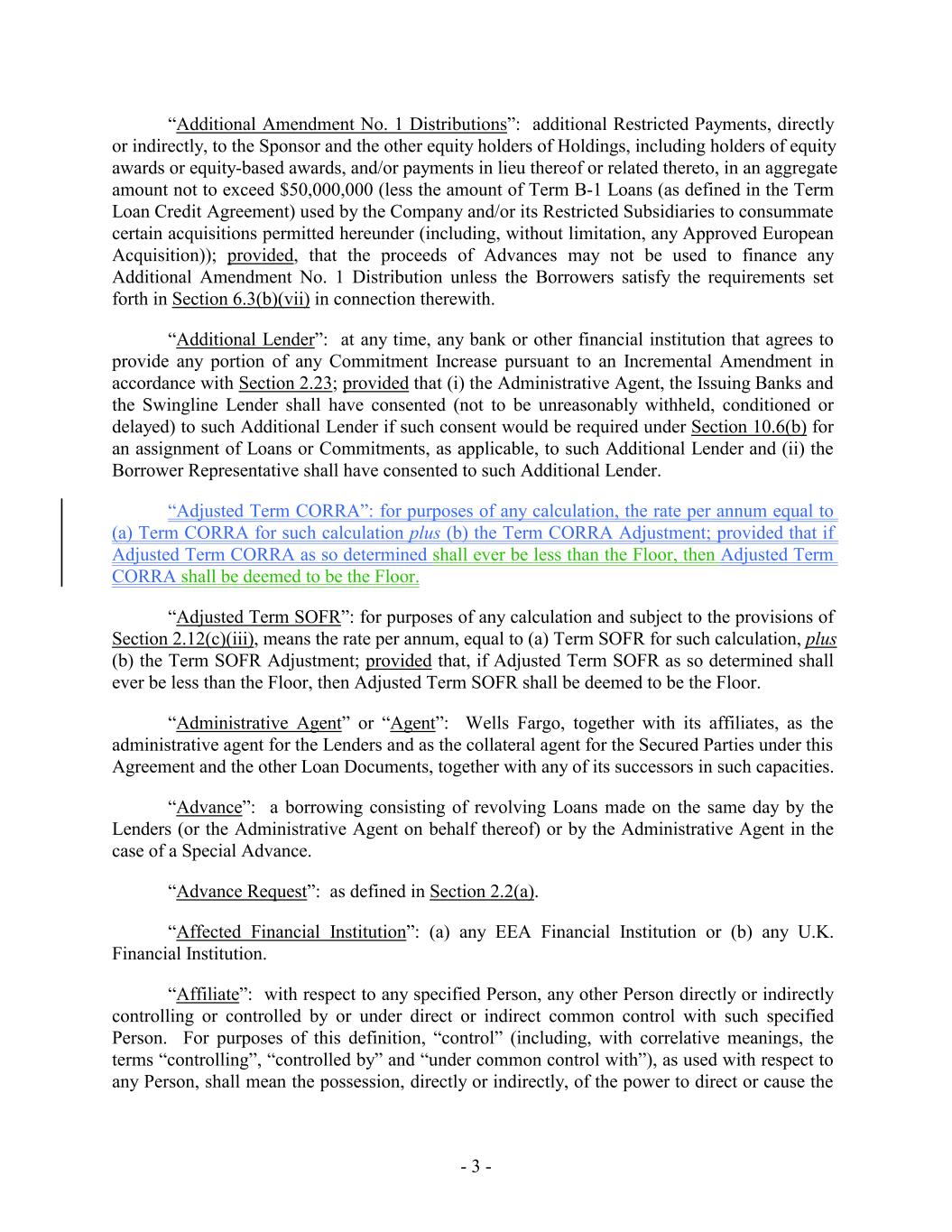 “Additional Amendment No. 1 Distributions”: additional Restricted Payments, directly or indirectly, to the Sponsor and the other equity holders of Holdings, including holders of equity awards or equity-based awards, and/or payments in lieu thereof or related thereto, in an aggregate amount not to exceed $50,000,000 (less the amount of Term B-1 Loans (as defined in the Term Loan Credit Agreement) used by the Company and/or its Restricted Subsidiaries to consummate certain acquisitions permitted hereunder (including, without limitation, any Approved European Acquisition)); provided, that the proceeds of Advances may not be used to finance any Additional Amendment No. 1 Distribution unless the Borrowers satisfy the requirements set forth in Section 6.3(b)(vii) in connection therewith. “Additional Lender”: at any time, any bank or other financial institution that agrees to provide any portion of any Commitment Increase pursuant to an Incremental Amendment in accordance with Section 2.23; provided that (i) the Administrative Agent, the Issuing Banks and the Swingline Lender shall have consented (not to be unreasonably withheld, conditioned or delayed) to such Additional Lender if such consent would be required under Section 10.6(b) for an assignment of Loans or Commitments, as applicable, to such Additional Lender and (ii) the Borrower Representative shall have consented to such Additional Lender. “Adjusted Term CORRA”: for purposes of any calculation, the rate per annum equal to (a) Term CORRA for such calculation plus (b) the Term CORRA Adjustment; provided that if Adjusted Term CORRA as so determined shall ever be less than the Floor, then Adjusted Term CORRA shall be deemed to be the Floor. “Adjusted Term SOFR”: for purposes of any calculation and subject to the provisions of Section 2.12(c)(iii), means the rate per annum, equal to (a) Term SOFR for such calculation, plus (b) the Term SOFR Adjustment; provided that, if Adjusted Term SOFR as so determined shall ever be less than the Floor, then Adjusted Term SOFR shall be deemed to be the Floor. “Administrative Agent” or “Agent”: Wells Fargo, together with its affiliates, as the administrative agent for the Lenders and as the collateral agent for the Secured Parties under this Agreement and the other Loan Documents, together with any of its successors in such capacities. “Advance”: a borrowing consisting of revolving Loans made on the same day by the Lenders (or the Administrative Agent on behalf thereof) or by the Administrative Agent in the case of a Special Advance. “Advance Request”: as defined in Section 2.2(a). “Affected Financial Institution”: (a) any EEA Financial Institution or (b) any U.K. Financial Institution. “Affiliate”: with respect to any specified Person, any other Person directly or indirectly controlling or controlled by or under direct or indirect common control with such specified Person. For purposes of this definition, “control” (including, with correlative meanings, the terms “controlling”, “controlled by” and “under common control with”), as used with respect to any Person, shall mean the possession, directly or indirectly, of the power to direct or cause the - 3 -