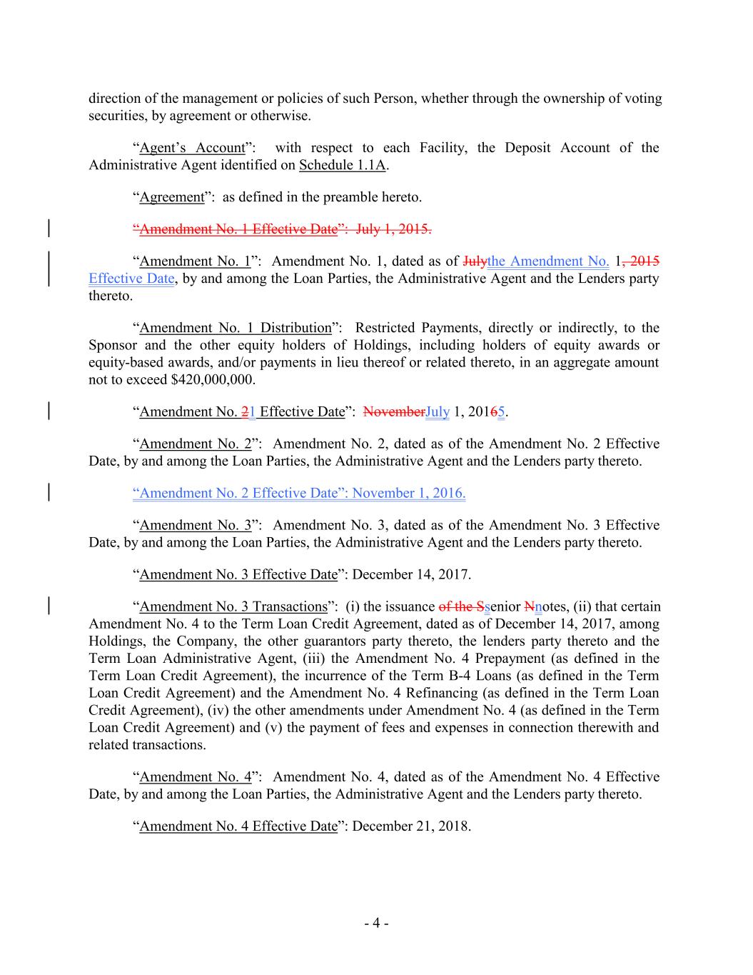 direction of the management or policies of such Person, whether through the ownership of voting securities, by agreement or otherwise. “Agent’s Account”: with respect to each Facility, the Deposit Account of the Administrative Agent identified on Schedule 1.1A. “Agreement”: as defined in the preamble hereto. “Amendment No. 1 Effective Date”: July 1, 2015. “Amendment No. 1”: Amendment No. 1, dated as of Julythe Amendment No. 1, 2015 Effective Date, by and among the Loan Parties, the Administrative Agent and the Lenders party thereto. “Amendment No. 1 Distribution”: Restricted Payments, directly or indirectly, to the Sponsor and the other equity holders of Holdings, including holders of equity awards or equity-based awards, and/or payments in lieu thereof or related thereto, in an aggregate amount not to exceed $420,000,000. “Amendment No. 21 Effective Date”: NovemberJuly 1, 20165. “Amendment No. 2”: Amendment No. 2, dated as of the Amendment No. 2 Effective Date, by and among the Loan Parties, the Administrative Agent and the Lenders party thereto. “Amendment No. 2 Effective Date”: November 1, 2016. “Amendment No. 3”: Amendment No. 3, dated as of the Amendment No. 3 Effective Date, by and among the Loan Parties, the Administrative Agent and the Lenders party thereto. “Amendment No. 3 Effective Date”: December 14, 2017. “Amendment No. 3 Transactions”: (i) the issuance of the Ssenior Nnotes, (ii) that certain Amendment No. 4 to the Term Loan Credit Agreement, dated as of December 14, 2017, among Holdings, the Company, the other guarantors party thereto, the lenders party thereto and the Term Loan Administrative Agent, (iii) the Amendment No. 4 Prepayment (as defined in the Term Loan Credit Agreement), the incurrence of the Term B-4 Loans (as defined in the Term Loan Credit Agreement) and the Amendment No. 4 Refinancing (as defined in the Term Loan Credit Agreement), (iv) the other amendments under Amendment No. 4 (as defined in the Term Loan Credit Agreement) and (v) the payment of fees and expenses in connection therewith and related transactions. “Amendment No. 4”: Amendment No. 4, dated as of the Amendment No. 4 Effective Date, by and among the Loan Parties, the Administrative Agent and the Lenders party thereto. “Amendment No. 4 Effective Date”: December 21, 2018. - 4 -