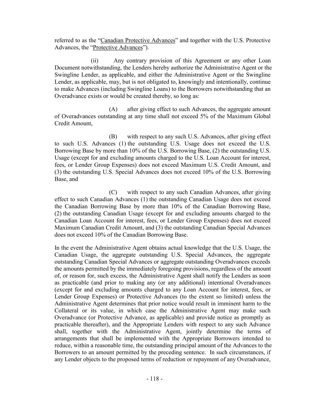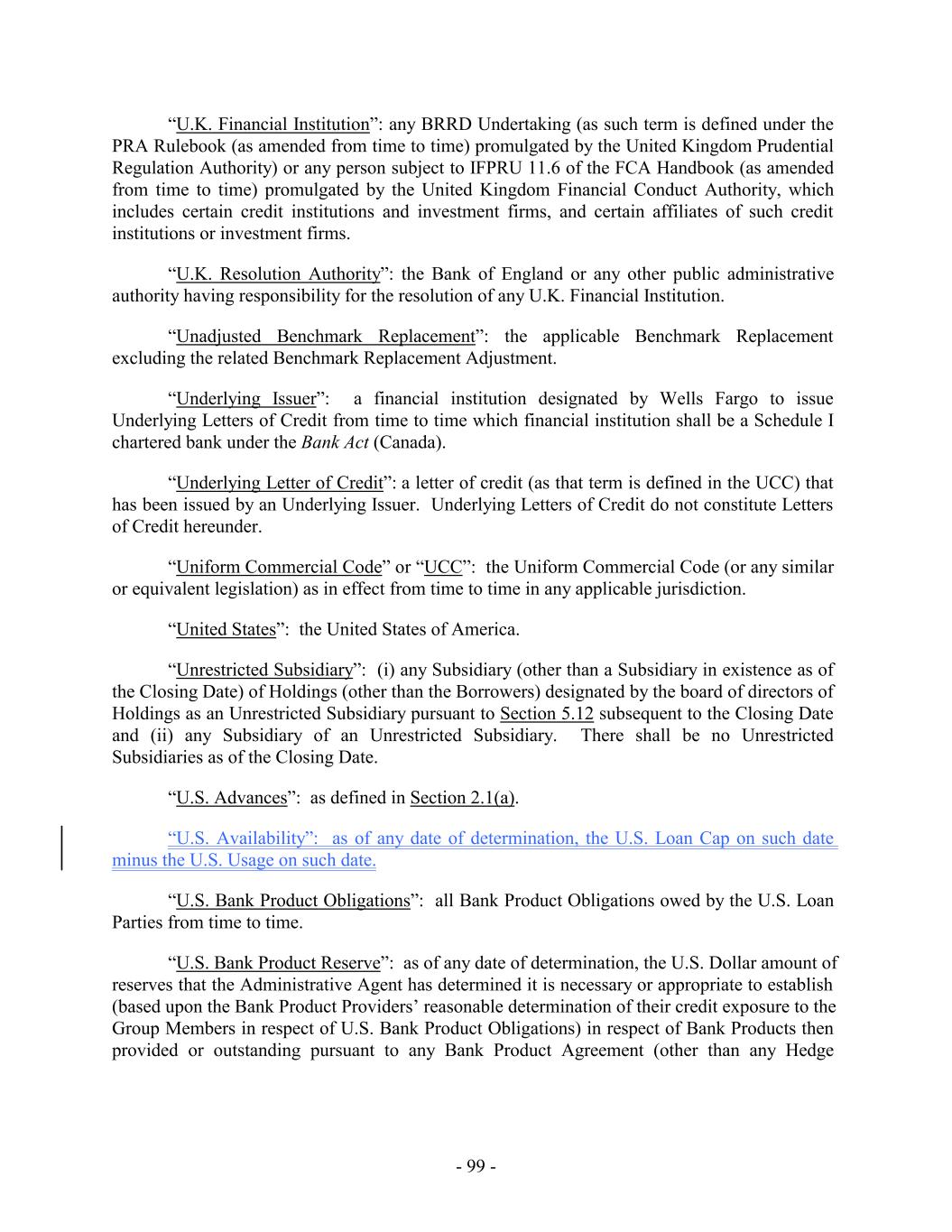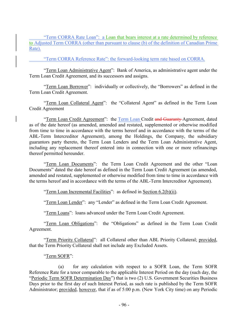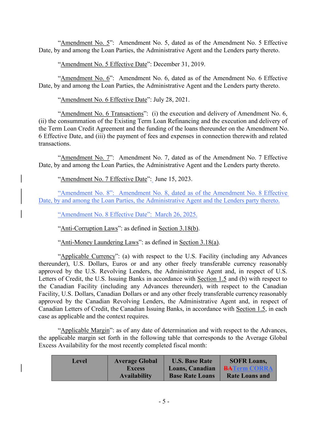 - 5 - Average Global Excess Availability “Amendment No. 5”: Amendment No. 5, dated as of the Amendment No. 5 Effective Date, by and among the Loan Parties, the Administrative Agent and the Lenders party thereto. “Amendment No. 5 Effective Date”: December 31, 2019. “Amendment No. 6”: Amendment No. 6, dated as of the Amendment No. 6 Effective Date, by and among the Loan Parties, the Administrative Agent and the Lenders party thereto. “Amendment No. 6 Effective Date”: July 28, 2021. “Amendment No. 6 Transactions”: (i) the execution and delivery of Amendment No. 6, (ii) the consummation of the Existing Term Loan Refinancing and the execution and delivery of the Term Loan Credit Agreement and the funding of the loans thereunder on the Amendment No. 6 Effective Date, and (iii) the payment of fees and expenses in connection therewith and related transactions. “Amendment No. 7”: Amendment No. 7, dated as of the Amendment No. 7 Effective Date, by and among the Loan Parties, the Administrative Agent and the Lenders party thereto. “Amendment No. 7 Effective Date”: June 15, 2023. “Amendment No. 8”: Amendment No. 8, dated as of the Amendment No. 8 Effective Date, by and among the Loan Parties, the Administrative Agent and the Lenders party thereto. “Amendment No. 8 Effective Date”: March 26, 2025. “Anti-Corruption Laws”: as defined in Section 3.18(b). “Anti-Money Laundering Laws”: as defined in Section 3.18(a). “Applicable Currency”: (a) with respect to the U.S. Facility (including any Advances thereunder), U.S. Dollars, Euros or and any other freely transferable currency reasonably approved by the U.S. Revolving Lenders, the Administrative Agent and, in respect of U.S. Letters of Credit, the U.S. Issuing Banks in accordance with Section 1.5 and (b) with respect to the Canadian Facility (including any Advances thereunder), with respect to the Canadian Facility, U.S. Dollars, Canadian Dollars or and any other freely transferable currency reasonably approved by the Canadian Revolving Lenders, the Administrative Agent and, in respect of Canadian Letters of Credit, the Canadian Issuing Banks, in accordance with Section 1.5, in each case as applicable and the context requires. “Applicable Margin”: as of any date of determination and with respect to the Advances, the applicable margin set forth in the following table that corresponds to the Average Global Excess Availability for the most recently completed fiscal month: U.S. Base Rate Loans, Canadian Base Rate Loans SOFR Loans, BATerm CORRA Rate Loans and Level