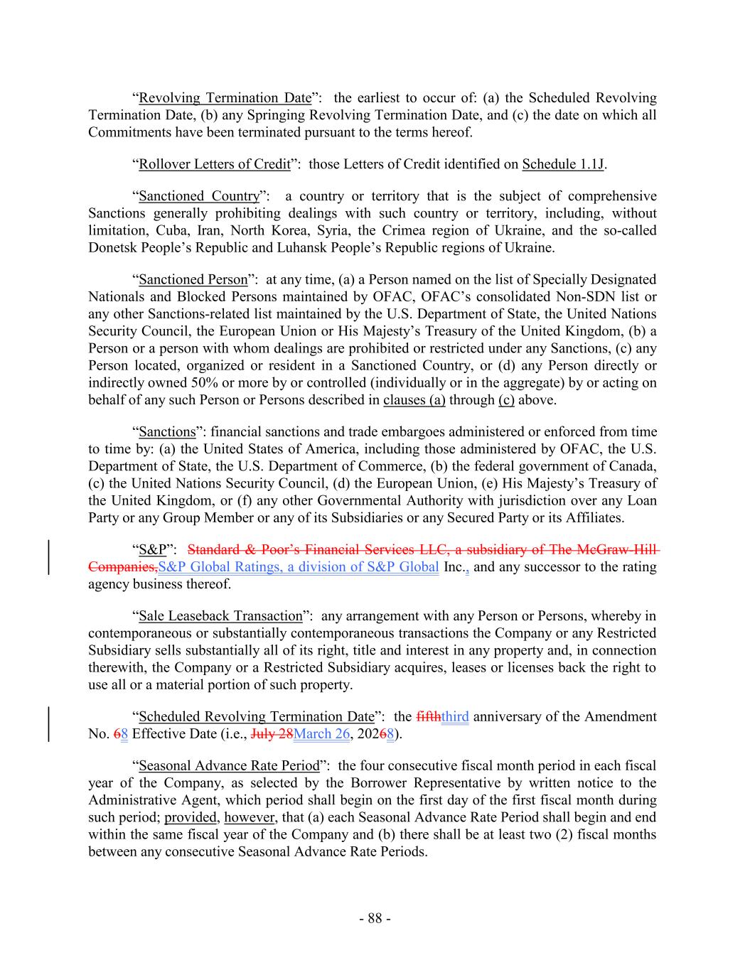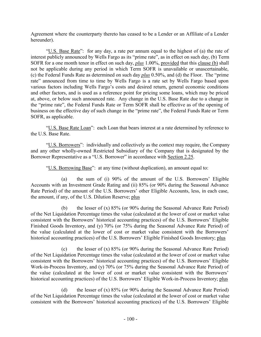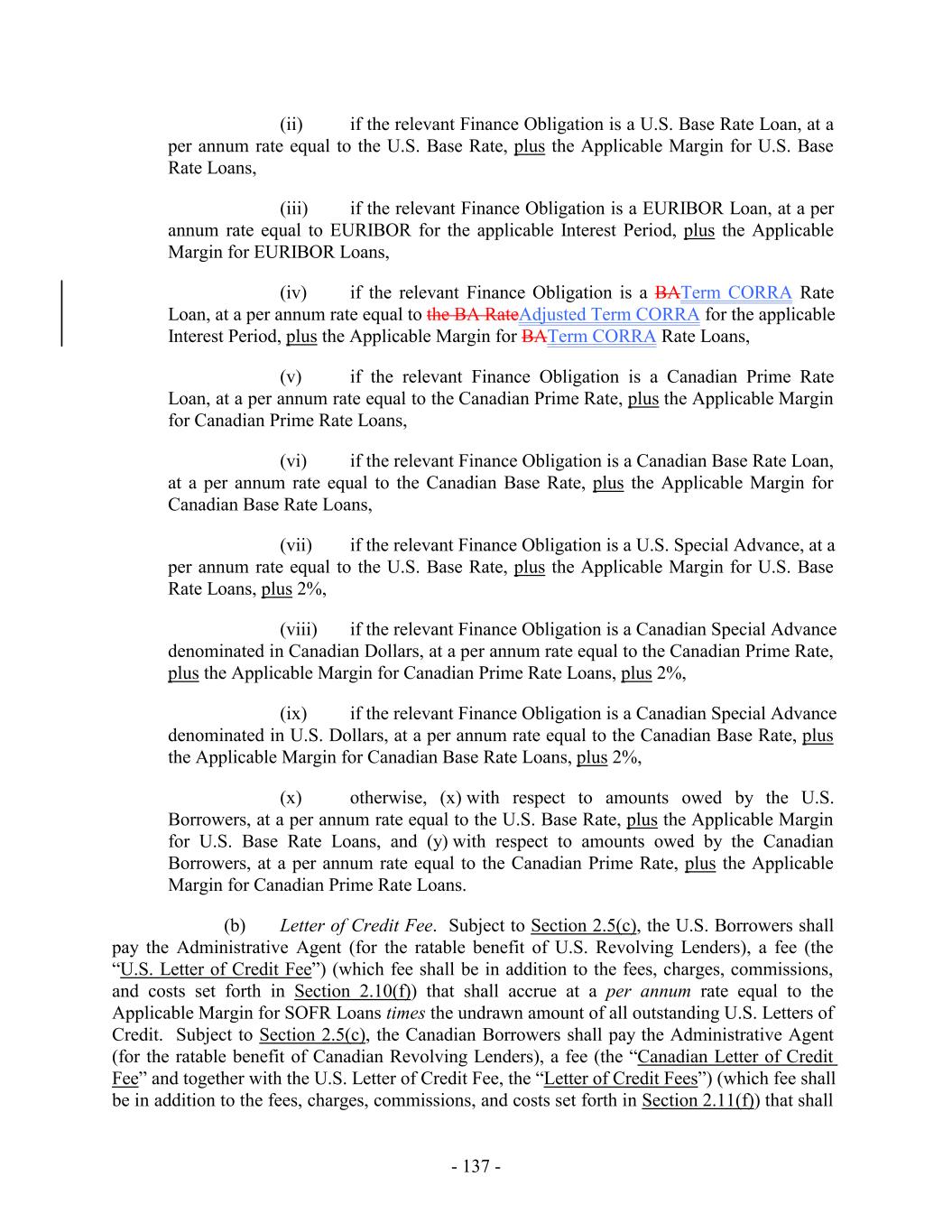 - 5 - Average Global Excess Availability “Amendment No. 5”: Amendment No. 5, dated as of the Amendment No. 5 Effective Date, by and among the Loan Parties, the Administrative Agent and the Lenders party thereto. “Amendment No. 5 Effective Date”: December 31, 2019. “Amendment No. 6”: Amendment No. 6, dated as of the Amendment No. 6 Effective Date, by and among the Loan Parties, the Administrative Agent and the Lenders party thereto. “Amendment No. 6 Effective Date”: July 28, 2021. “Amendment No. 6 Transactions”: (i) the execution and delivery of Amendment No. 6, (ii) the consummation of the Existing Term Loan Refinancing and the execution and delivery of the Term Loan Credit Agreement and the funding of the loans thereunder on the Amendment No. 6 Effective Date, and (iii) the payment of fees and expenses in connection therewith and related transactions. “Amendment No. 7”: Amendment No. 7, dated as of the Amendment No. 7 Effective Date, by and among the Loan Parties, the Administrative Agent and the Lenders party thereto. “Amendment No. 7 Effective Date”: June 15, 2023. “Amendment No. 8”: Amendment No. 8, dated as of the Amendment No. 8 Effective Date, by and among the Loan Parties, the Administrative Agent and the Lenders party thereto. “Amendment No. 8 Effective Date”: March 26, 2025. “Anti-Corruption Laws”: as defined in Section 3.18(b). “Anti-Money Laundering Laws”: as defined in Section 3.18(a). “Applicable Currency”: (a) with respect to the U.S. Facility (including any Advances thereunder), U.S. Dollars, Euros or and any other freely transferable currency reasonably approved by the U.S. Revolving Lenders, the Administrative Agent and, in respect of U.S. Letters of Credit, the U.S. Issuing Banks in accordance with Section 1.5 and (b) with respect to the Canadian Facility (including any Advances thereunder), with respect to the Canadian Facility, U.S. Dollars, Canadian Dollars or and any other freely transferable currency reasonably approved by the Canadian Revolving Lenders, the Administrative Agent and, in respect of Canadian Letters of Credit, the Canadian Issuing Banks, in accordance with Section 1.5, in each case as applicable and the context requires. “Applicable Margin”: as of any date of determination and with respect to the Advances, the applicable margin set forth in the following table that corresponds to the Average Global Excess Availability for the most recently completed fiscal month: U.S. Base Rate Loans, Canadian Base Rate Loans SOFR Loans, BATerm CORRA Rate Loans and Level