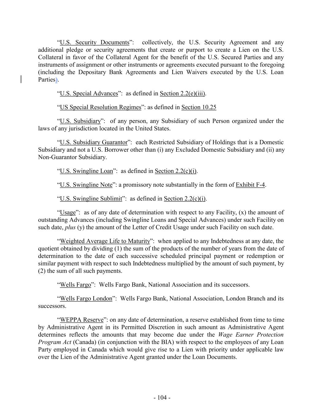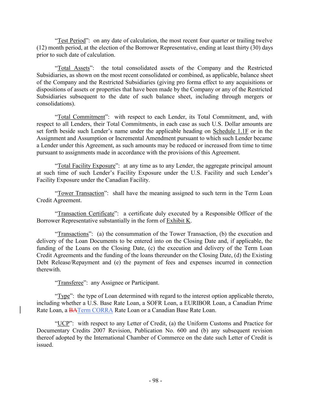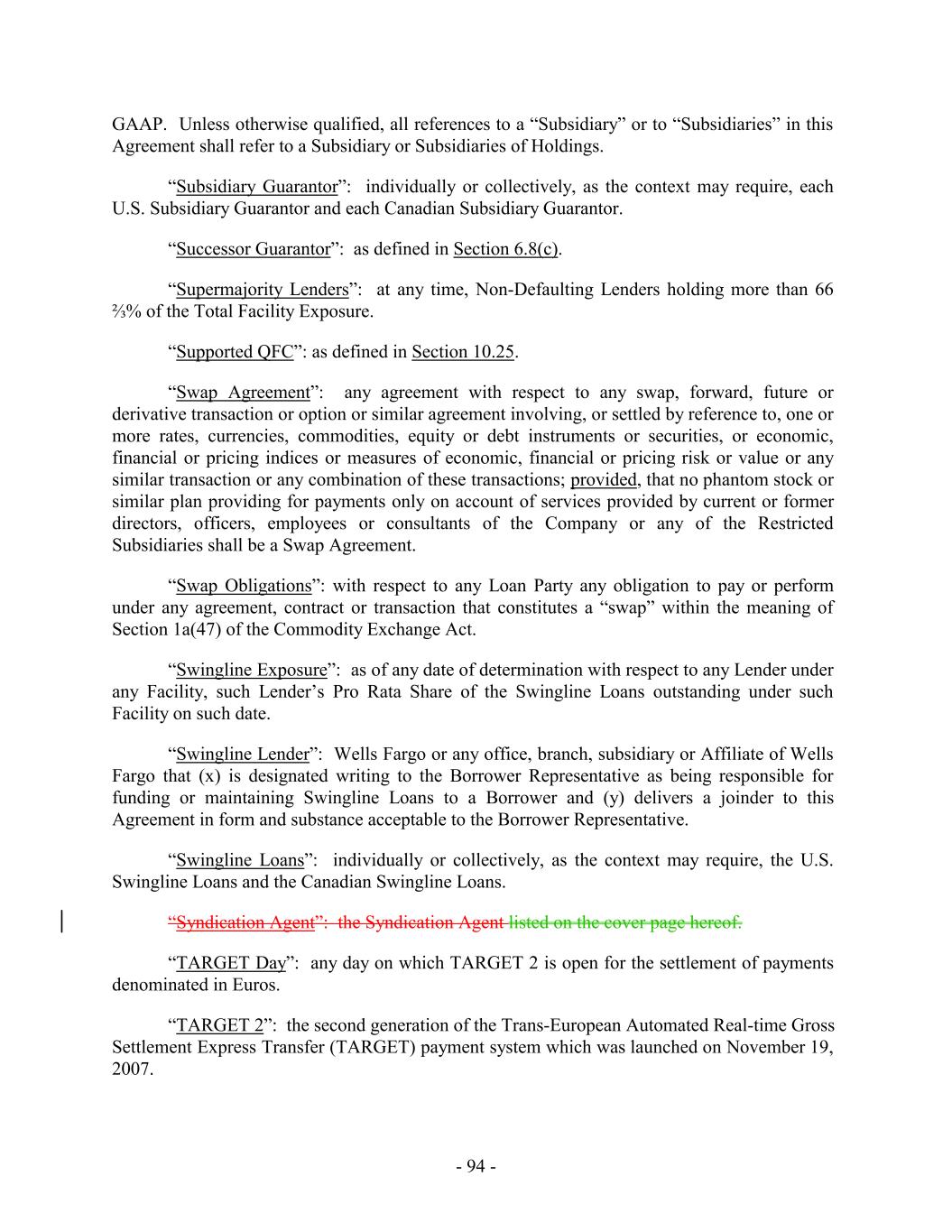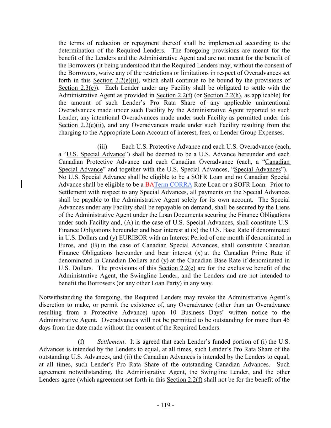- 5 - Average Global Excess Availability “Amendment No. 5”: Amendment No. 5, dated as of the Amendment No. 5 Effective Date, by and among the Loan Parties, the Administrative Agent and the Lenders party thereto. “Amendment No. 5 Effective Date”: December 31, 2019. “Amendment No. 6”: Amendment No. 6, dated as of the Amendment No. 6 Effective Date, by and among the Loan Parties, the Administrative Agent and the Lenders party thereto. “Amendment No. 6 Effective Date”: July 28, 2021. “Amendment No. 6 Transactions”: (i) the execution and delivery of Amendment No. 6, (ii) the consummation of the Existing Term Loan Refinancing and the execution and delivery of the Term Loan Credit Agreement and the funding of the loans thereunder on the Amendment No. 6 Effective Date, and (iii) the payment of fees and expenses in connection therewith and related transactions. “Amendment No. 7”: Amendment No. 7, dated as of the Amendment No. 7 Effective Date, by and among the Loan Parties, the Administrative Agent and the Lenders party thereto. “Amendment No. 7 Effective Date”: June 15, 2023. “Amendment No. 8”: Amendment No. 8, dated as of the Amendment No. 8 Effective Date, by and among the Loan Parties, the Administrative Agent and the Lenders party thereto. “Amendment No. 8 Effective Date”: March 26, 2025. “Anti-Corruption Laws”: as defined in Section 3.18(b). “Anti-Money Laundering Laws”: as defined in Section 3.18(a). “Applicable Currency”: (a) with respect to the U.S. Facility (including any Advances thereunder), U.S. Dollars, Euros or and any other freely transferable currency reasonably approved by the U.S. Revolving Lenders, the Administrative Agent and, in respect of U.S. Letters of Credit, the U.S. Issuing Banks in accordance with Section 1.5 and (b) with respect to the Canadian Facility (including any Advances thereunder), with respect to the Canadian Facility, U.S. Dollars, Canadian Dollars or and any other freely transferable currency reasonably approved by the Canadian Revolving Lenders, the Administrative Agent and, in respect of Canadian Letters of Credit, the Canadian Issuing Banks, in accordance with Section 1.5, in each case as applicable and the context requires. “Applicable Margin”: as of any date of determination and with respect to the Advances, the applicable margin set forth in the following table that corresponds to the Average Global Excess Availability for the most recently completed fiscal month: U.S. Base Rate Loans, Canadian Base Rate Loans SOFR Loans, BATerm CORRA Rate Loans and Level