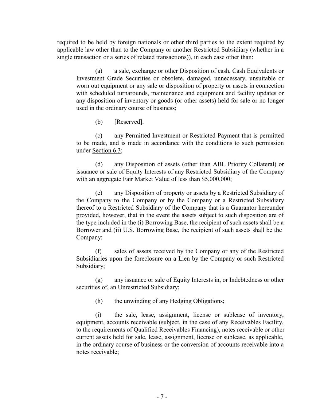 required to be held by foreign nationals or other third parties to the extent required by applicable law other than to the Company or another Restricted Subsidiary (whether in a single transaction or a series of related transactions)), in each case other than: (a) a sale, exchange or other Disposition of cash, Cash Equivalents or Investment Grade Securities or obsolete, damaged, unnecessary, unsuitable or worn out equipment or any sale or disposition of property or assets in connection with scheduled turnarounds, maintenance and equipment and facility updates or any disposition of inventory or goods (or other assets) held for sale or no longer used in the ordinary course of business; (b) [Reserved]. (c) any Permitted Investment or Restricted Payment that is permitted to be made, and is made in accordance with the conditions to such permission under Section 6.3; (d) any Disposition of assets (other than ABL Priority Collateral) or issuance or sale of Equity Interests of any Restricted Subsidiary of the Company with an aggregate Fair Market Value of less than $5,000,000; (e) any Disposition of property or assets by a Restricted Subsidiary of the Company to the Company or by the Company or a Restricted Subsidiary thereof to a Restricted Subsidiary of the Company that is a Guarantor hereunder provided, however, that in the event the assets subject to such disposition are of the type included in the (i) Borrowing Base, the recipient of such assets shall be a Borrower and (ii) U.S. Borrowing Base, the recipient of such assets shall be the Company; (f) sales of assets received by the Company or any of the Restricted Subsidiaries upon the foreclosure on a Lien by the Company or such Restricted Subsidiary; (g) any issuance or sale of Equity Interests in, or Indebtedness or other securities of, an Unrestricted Subsidiary; (h) the unwinding of any Hedging Obligations; (i) the sale, lease, assignment, license or sublease of inventory, equipment, accounts receivable (subject, in the case of any Receivables Facility, to the requirements of Qualified Receivables Financing), notes receivable or other current assets held for sale, lease, assignment, license or sublease, as applicable, in the ordinary course of business or the conversion of accounts receivable into a notes receivable; - 7 -
