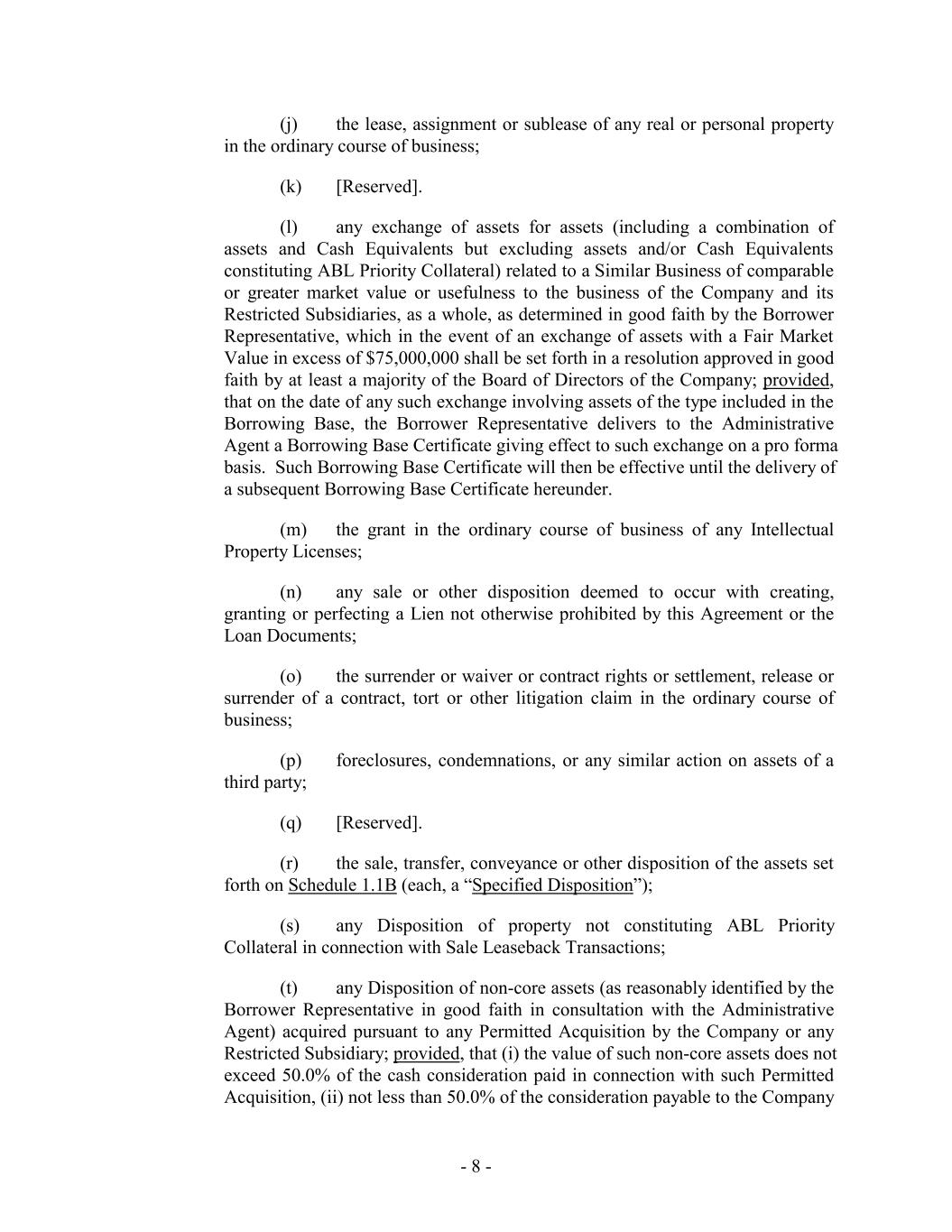(j) the lease, assignment or sublease of any real or personal property in the ordinary course of business; (k) [Reserved]. (l) any exchange of assets for assets (including a combination of assets and Cash Equivalents but excluding assets and/or Cash Equivalents constituting ABL Priority Collateral) related to a Similar Business of comparable or greater market value or usefulness to the business of the Company and its Restricted Subsidiaries, as a whole, as determined in good faith by the Borrower Representative, which in the event of an exchange of assets with a Fair Market Value in excess of $75,000,000 shall be set forth in a resolution approved in good faith by at least a majority of the Board of Directors of the Company; provided, that on the date of any such exchange involving assets of the type included in the Borrowing Base, the Borrower Representative delivers to the Administrative Agent a Borrowing Base Certificate giving effect to such exchange on a pro forma basis. Such Borrowing Base Certificate will then be effective until the delivery of a subsequent Borrowing Base Certificate hereunder. (m) the grant in the ordinary course of business of any Intellectual Property Licenses; (n) any sale or other disposition deemed to occur with creating, granting or perfecting a Lien not otherwise prohibited by this Agreement or the Loan Documents; (o) the surrender or waiver or contract rights or settlement, release or surrender of a contract, tort or other litigation claim in the ordinary course of business; (p) foreclosures, condemnations, or any similar action on assets of a third party; (q) [Reserved]. (r) the sale, transfer, conveyance or other disposition of the assets set forth on Schedule 1.1B (each, a “Specified Disposition”); (s) any Disposition of property not constituting ABL Priority Collateral in connection with Sale Leaseback Transactions; (t) any Disposition of non-core assets (as reasonably identified by the Borrower Representative in good faith in consultation with the Administrative Agent) acquired pursuant to any Permitted Acquisition by the Company or any Restricted Subsidiary; provided, that (i) the value of such non-core assets does not exceed 50.0% of the cash consideration paid in connection with such Permitted Acquisition, (ii) not less than 50.0% of the consideration payable to the Company - 8 -