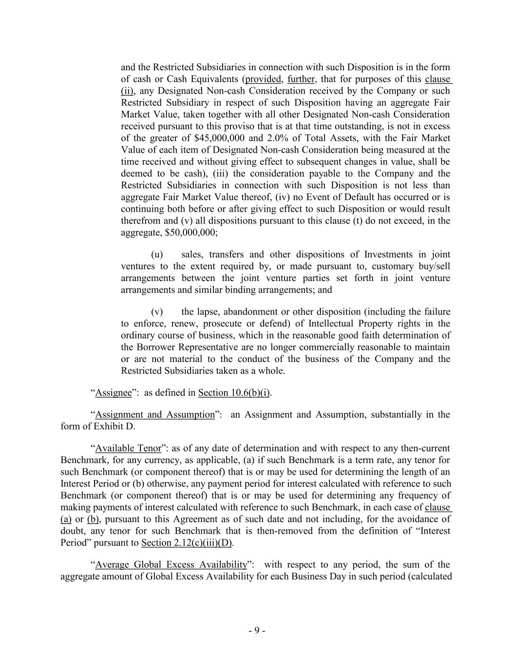 and the Restricted Subsidiaries in connection with such Disposition is in the form of cash or Cash Equivalents (provided, further, that for purposes of this clause (ii), any Designated Non-cash Consideration received by the Company or such Restricted Subsidiary in respect of such Disposition having an aggregate Fair Market Value, taken together with all other Designated Non-cash Consideration received pursuant to this proviso that is at that time outstanding, is not in excess of the greater of $45,000,000 and 2.0% of Total Assets, with the Fair Market Value of each item of Designated Non-cash Consideration being measured at the time received and without giving effect to subsequent changes in value, shall be deemed to be cash), (iii) the consideration payable to the Company and the Restricted Subsidiaries in connection with such Disposition is not less than aggregate Fair Market Value thereof, (iv) no Event of Default has occurred or is continuing both before or after giving effect to such Disposition or would result therefrom and (v) all dispositions pursuant to this clause (t) do not exceed, in the aggregate, $50,000,000; (u) sales, transfers and other dispositions of Investments in joint ventures to the extent required by, or made pursuant to, customary buy/sell arrangements between the joint venture parties set forth in joint venture arrangements and similar binding arrangements; and (v) the lapse, abandonment or other disposition (including the failure to enforce, renew, prosecute or defend) of Intellectual Property rights in the ordinary course of business, which in the reasonable good faith determination of the Borrower Representative are no longer commercially reasonable to maintain or are not material to the conduct of the business of the Company and the Restricted Subsidiaries taken as a whole. “Assignee”: as defined in Section 10.6(b)(i). “Assignment and Assumption”: an Assignment and Assumption, substantially in the form of Exhibit D. “Available Tenor”: as of any date of determination and with respect to any then-current Benchmark, for any currency, as applicable, (a) if such Benchmark is a term rate, any tenor for such Benchmark (or component thereof) that is or may be used for determining the length of an Interest Period or (b) otherwise, any payment period for interest calculated with reference to such Benchmark (or component thereof) that is or may be used for determining any frequency of making payments of interest calculated with reference to such Benchmark, in each case of clause (a) or (b), pursuant to this Agreement as of such date and not including, for the avoidance of doubt, any tenor for such Benchmark that is then-removed from the definition of “Interest Period” pursuant to Section 2.12(c)(iii)(D). “Average Global Excess Availability”: with respect to any period, the sum of the aggregate amount of Global Excess Availability for each Business Day in such period (calculated - 9 -
