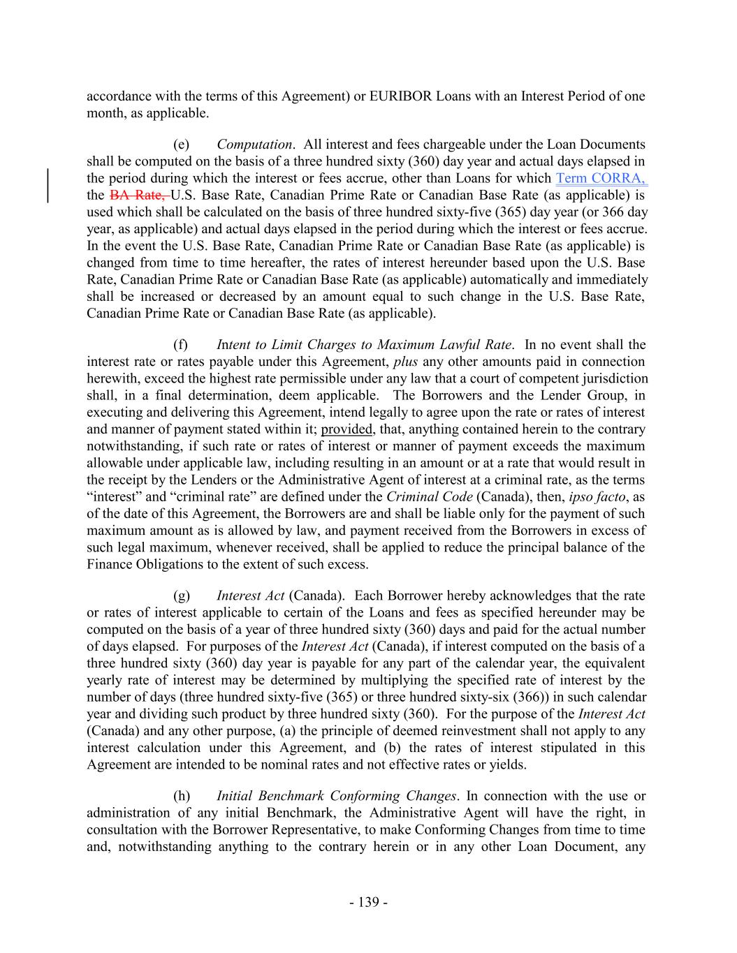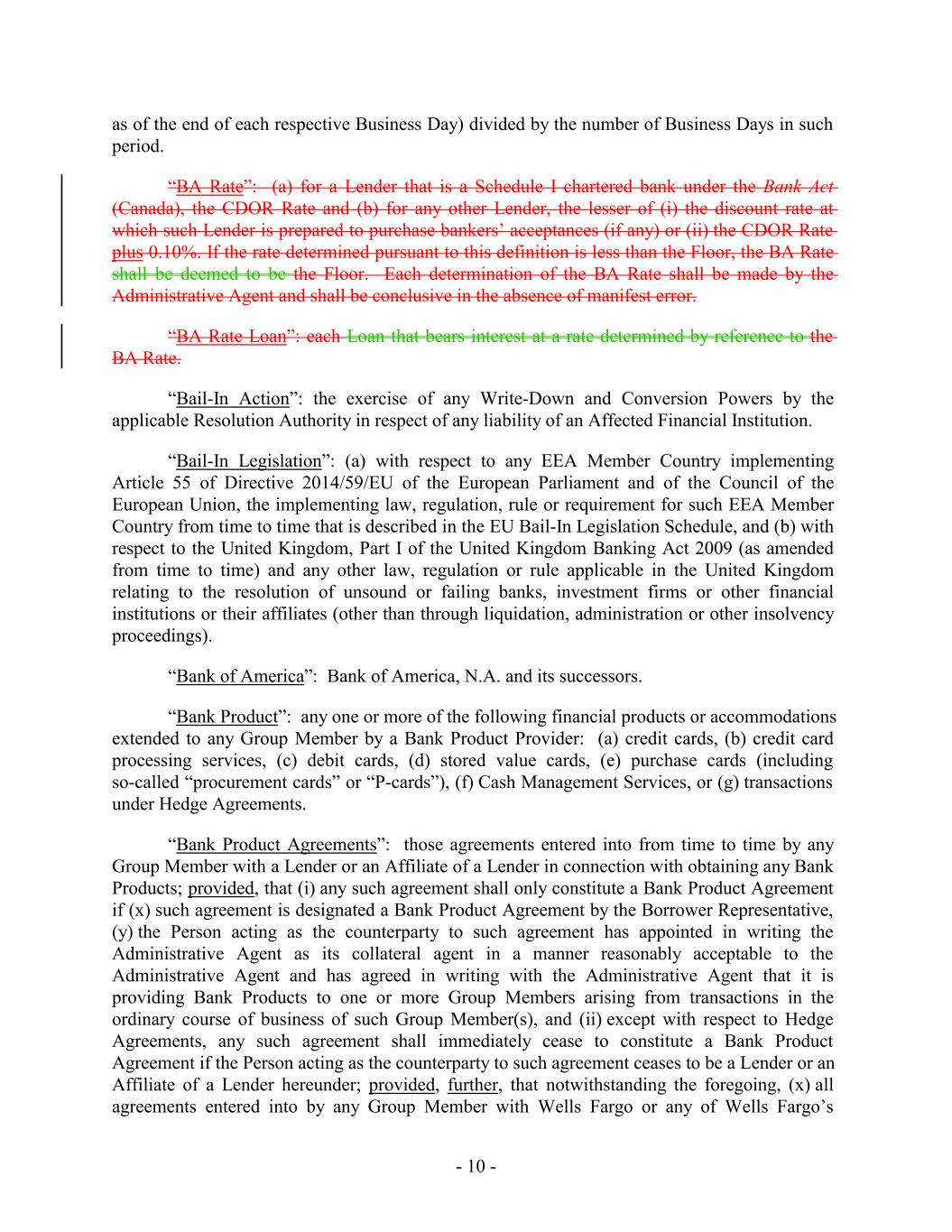 as of the end of each respective Business Day) divided by the number of Business Days in such period. “BA Rate”: (a) for a Lender that is a Schedule I chartered bank under the Bank Act (Canada), the CDOR Rate and (b) for any other Lender, the lesser of (i) the discount rate at which such Lender is prepared to purchase bankers’ acceptances (if any) or (ii) the CDOR Rate plus 0.10%. If the rate determined pursuant to this definition is less than the Floor, the BA Rate shall be deemed to be the Floor. Each determination of the BA Rate shall be made by the Administrative Agent and shall be conclusive in the absence of manifest error. “BA Rate Loan”: each Loan that bears interest at a rate determined by reference to the BA Rate. “Bail-In Action”: the exercise of any Write-Down and Conversion Powers by the applicable Resolution Authority in respect of any liability of an Affected Financial Institution. “Bail-In Legislation”: (a) with respect to any EEA Member Country implementing Article 55 of Directive 2014/59/EU of the European Parliament and of the Council of the European Union, the implementing law, regulation, rule or requirement for such EEA Member Country from time to time that is described in the EU Bail-In Legislation Schedule, and (b) with respect to the United Kingdom, Part I of the United Kingdom Banking Act 2009 (as amended from time to time) and any other law, regulation or rule applicable in the United Kingdom relating to the resolution of unsound or failing banks, investment firms or other financial institutions or their affiliates (other than through liquidation, administration or other insolvency proceedings). “Bank of America”: Bank of America, N.A. and its successors. “Bank Product”: any one or more of the following financial products or accommodations extended to any Group Member by a Bank Product Provider: (a) credit cards, (b) credit card processing services, (c) debit cards, (d) stored value cards, (e) purchase cards (including so-called “procurement cards” or “P-cards”), (f) Cash Management Services, or (g) transactions under Hedge Agreements. “Bank Product Agreements”: those agreements entered into from time to time by any Group Member with a Lender or an Affiliate of a Lender in connection with obtaining any Bank Products; provided, that (i) any such agreement shall only constitute a Bank Product Agreement if (x) such agreement is designated a Bank Product Agreement by the Borrower Representative, (y) the Person acting as the counterparty to such agreement has appointed in writing the Administrative Agent as its collateral agent in a manner reasonably acceptable to the Administrative Agent and has agreed in writing with the Administrative Agent that it is providing Bank Products to one or more Group Members arising from transactions in the ordinary course of business of such Group Member(s), and (ii) except with respect to Hedge Agreements, any such agreement shall immediately cease to constitute a Bank Product Agreement if the Person acting as the counterparty to such agreement ceases to be a Lender or an Affiliate of a Lender hereunder; provided, further, that notwithstanding the foregoing, (x) all agreements entered into by any Group Member with Wells Fargo or any of Wells Fargo’s - 10 -