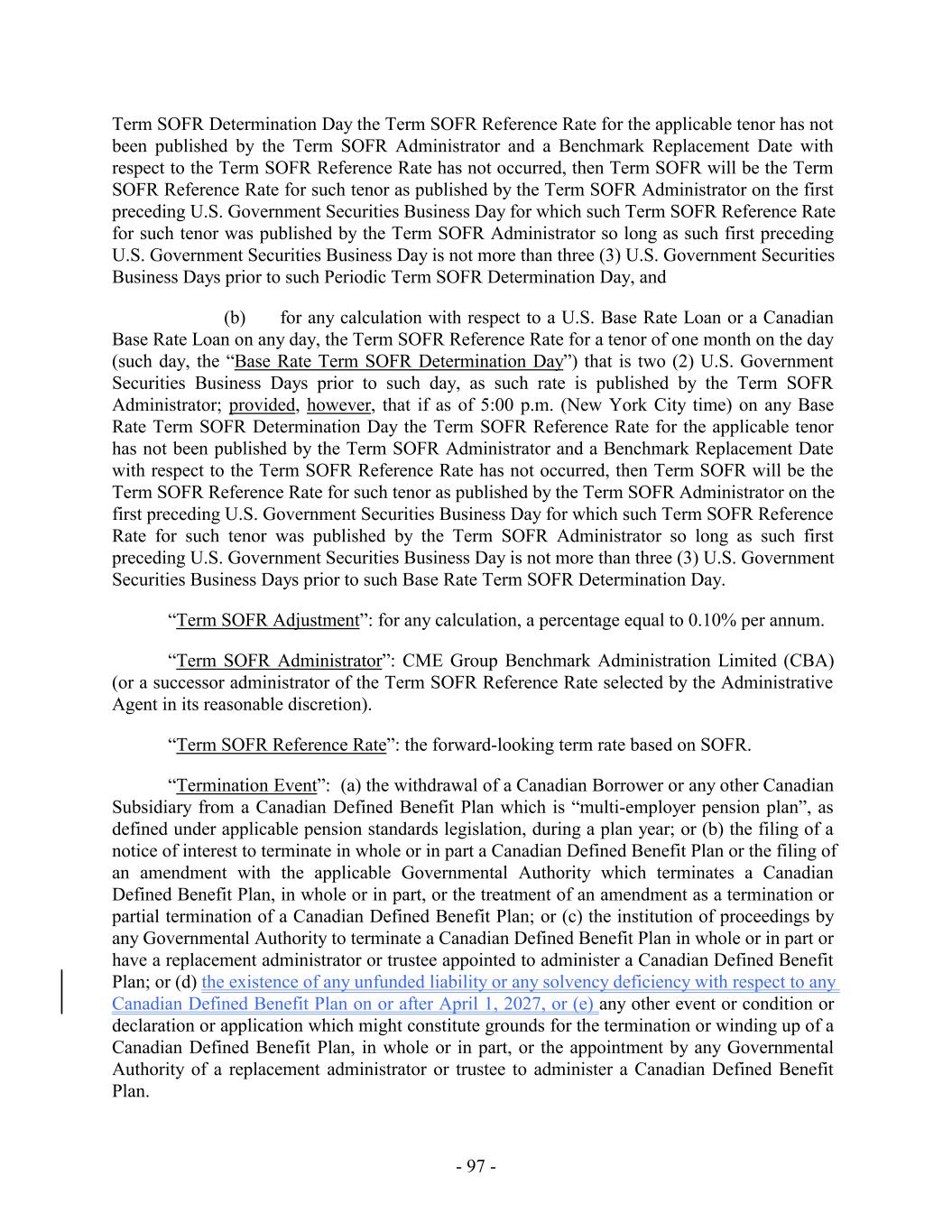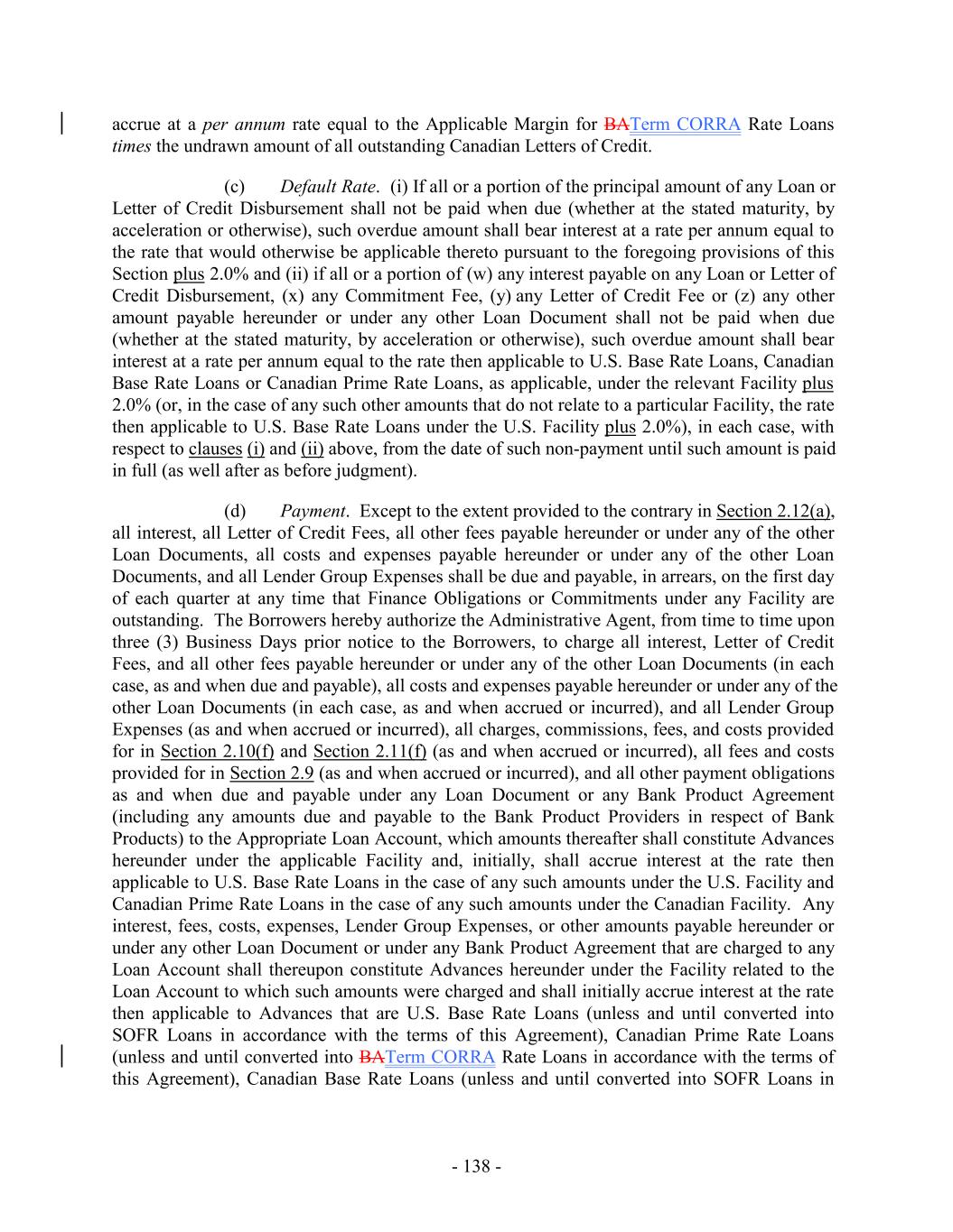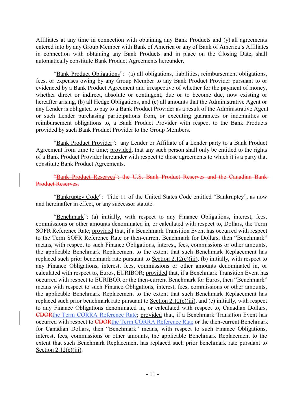 Affiliates at any time in connection with obtaining any Bank Products and (y) all agreements entered into by any Group Member with Bank of America or any of Bank of America’s Affiliates in connection with obtaining any Bank Products and in place on the Closing Date, shall automatically constitute Bank Product Agreements hereunder. “Bank Product Obligations”: (a) all obligations, liabilities, reimbursement obligations, fees, or expenses owing by any Group Member to any Bank Product Provider pursuant to or evidenced by a Bank Product Agreement and irrespective of whether for the payment of money, whether direct or indirect, absolute or contingent, due or to become due, now existing or hereafter arising, (b) all Hedge Obligations, and (c) all amounts that the Administrative Agent or any Lender is obligated to pay to a Bank Product Provider as a result of the Administrative Agent or such Lender purchasing participations from, or executing guarantees or indemnities or reimbursement obligations to, a Bank Product Provider with respect to the Bank Products provided by such Bank Product Provider to the Group Members. “Bank Product Provider”: any Lender or Affiliate of a Lender party to a Bank Product Agreement from time to time; provided, that any such person shall only be entitled to the rights of a Bank Product Provider hereunder with respect to those agreements to which it is a party that constitute Bank Product Agreements. “Bank Product Reserves”: the U.S. Bank Product Reserves and the Canadian Bank Product Reserves. “Bankruptcy Code”: Title 11 of the United States Code entitled “Bankruptcy”, as now and hereinafter in effect, or any successor statute. “Benchmark”: (a) initially, with respect to any Finance Obligations, interest, fees, commissions or other amounts denominated in, or calculated with respect to, Dollars, the Term SOFR Reference Rate; provided that, if a Benchmark Transition Event has occurred with respect to the Term SOFR Reference Rate or then-current Benchmark for Dollars, then “Benchmark” means, with respect to such Finance Obligations, interest, fees, commissions or other amounts, the applicable Benchmark Replacement to the extent that such Benchmark Replacement has replaced such prior benchmark rate pursuant to Section 2.12(c)(iii), (b) initially, with respect to any Finance Obligations, interest, fees, commissions or other amounts denominated in, or calculated with respect to, Euros, EURIBOR; provided that, if a Benchmark Transition Event has occurred with respect to EURIBOR or the then-current Benchmark for Euros, then “Benchmark” means with respect to such Finance Obligations, interest, fees, commissions or other amounts, the applicable Benchmark Replacement to the extent that such Benchmark Replacement has replaced such prior benchmark rate pursuant to Section 2.12(c)(iii), and (c) initially, with respect to any Finance Obligations denominated in, or calculated with respect to, Canadian Dollars, CDORthe Term CORRA Reference Rate; provided that, if a Benchmark Transition Event has occurred with respect to CDORthe Term CORRA Reference Rate or the then-current Benchmark for Canadian Dollars, then “Benchmark” means, with respect to such Finance Obligations, interest, fees, commissions or other amounts, the applicable Benchmark Replacement to the extent that such Benchmark Replacement has replaced such prior benchmark rate pursuant to Section 2.12(c)(iii). - 11 -