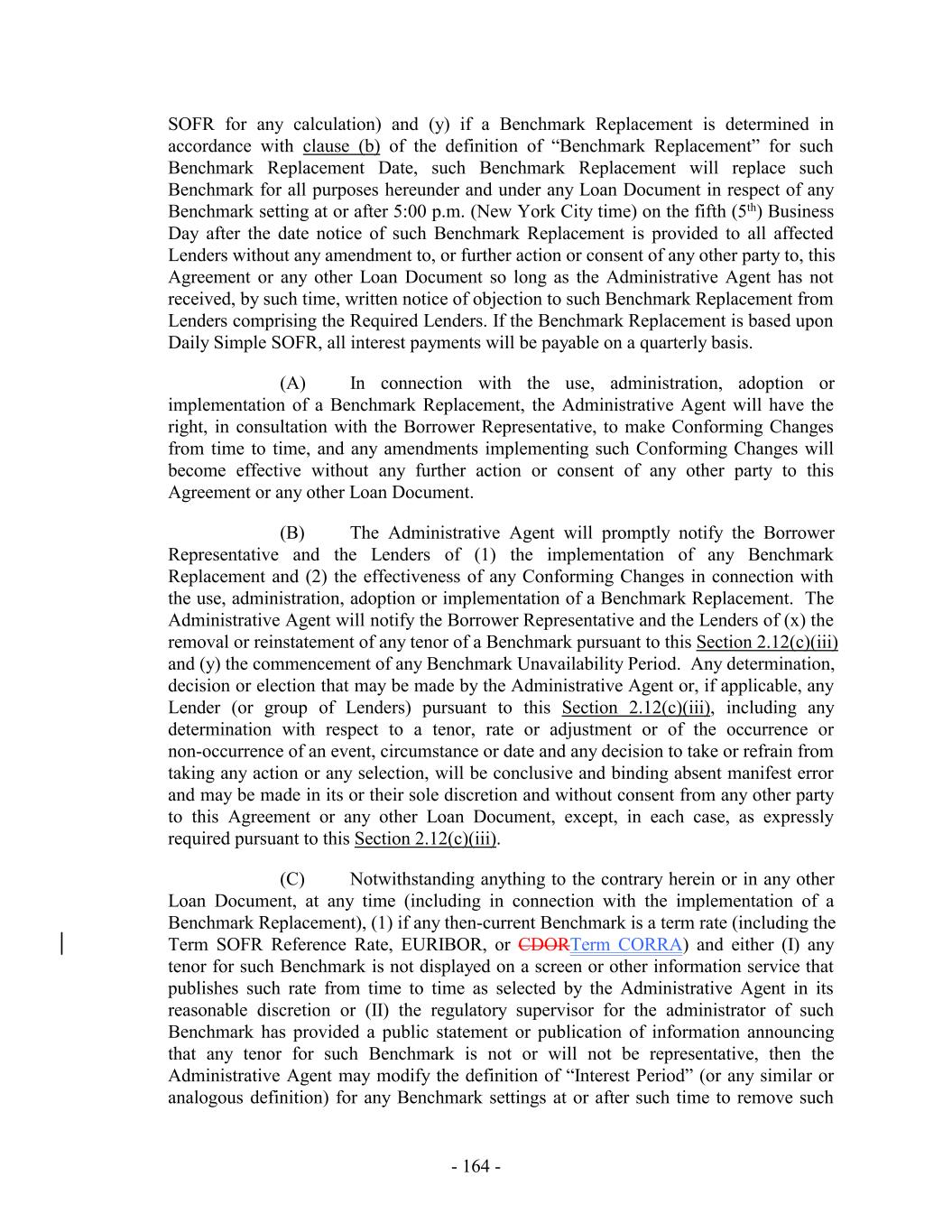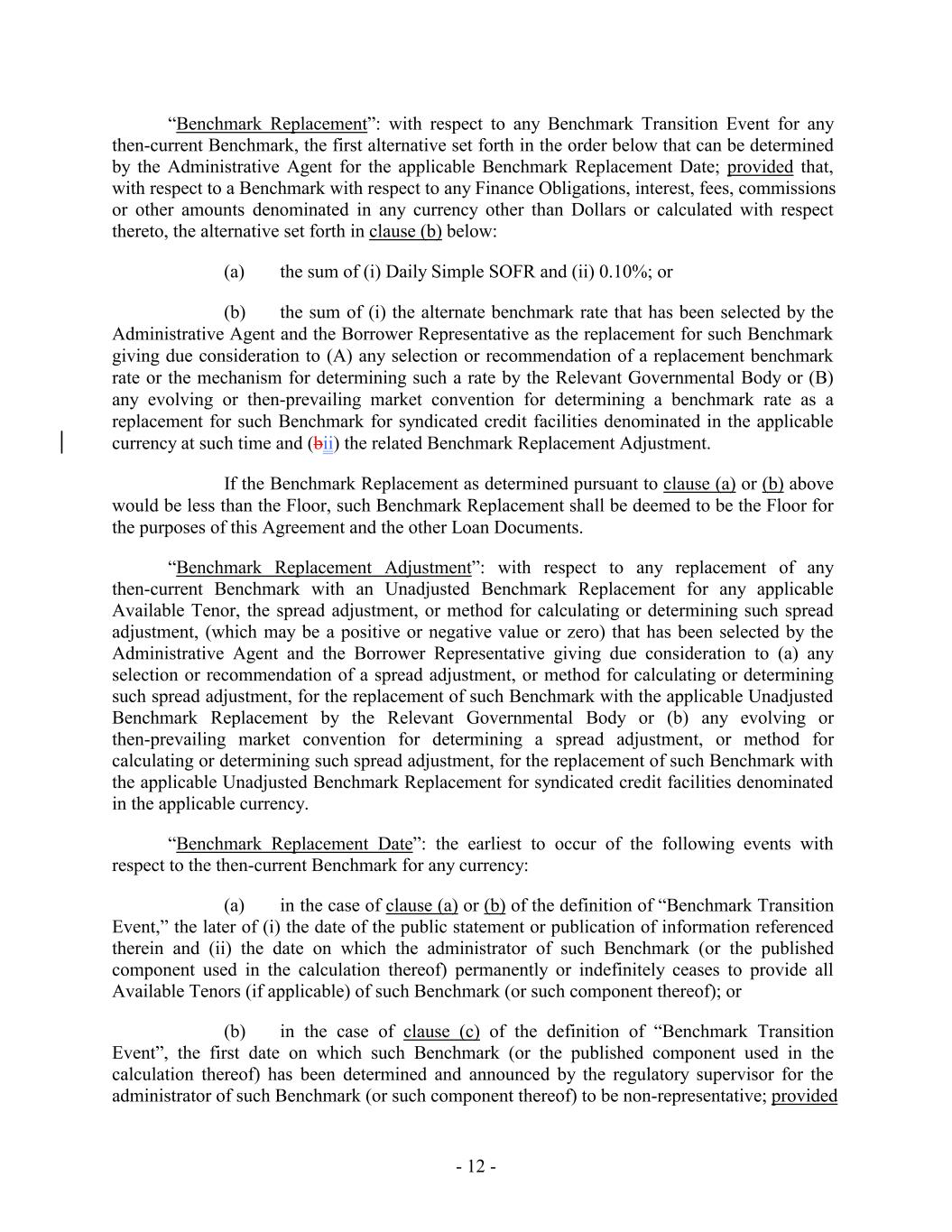 “Benchmark Replacement”: with respect to any Benchmark Transition Event for any then-current Benchmark, the first alternative set forth in the order below that can be determined by the Administrative Agent for the applicable Benchmark Replacement Date; provided that, with respect to a Benchmark with respect to any Finance Obligations, interest, fees, commissions or other amounts denominated in any currency other than Dollars or calculated with respect thereto, the alternative set forth in clause (b) below: (a) the sum of (i) Daily Simple SOFR and (ii) 0.10%; or (b) the sum of (i) the alternate benchmark rate that has been selected by the Administrative Agent and the Borrower Representative as the replacement for such Benchmark giving due consideration to (A) any selection or recommendation of a replacement benchmark rate or the mechanism for determining such a rate by the Relevant Governmental Body or (B) any evolving or then-prevailing market convention for determining a benchmark rate as a replacement for such Benchmark for syndicated credit facilities denominated in the applicable currency at such time and (bii) the related Benchmark Replacement Adjustment. If the Benchmark Replacement as determined pursuant to clause (a) or (b) above would be less than the Floor, such Benchmark Replacement shall be deemed to be the Floor for the purposes of this Agreement and the other Loan Documents. “Benchmark Replacement Adjustment”: with respect to any replacement of any then-current Benchmark with an Unadjusted Benchmark Replacement for any applicable Available Tenor, the spread adjustment, or method for calculating or determining such spread adjustment, (which may be a positive or negative value or zero) that has been selected by the Administrative Agent and the Borrower Representative giving due consideration to (a) any selection or recommendation of a spread adjustment, or method for calculating or determining such spread adjustment, for the replacement of such Benchmark with the applicable Unadjusted Benchmark Replacement by the Relevant Governmental Body or (b) any evolving or then-prevailing market convention for determining a spread adjustment, or method for calculating or determining such spread adjustment, for the replacement of such Benchmark with the applicable Unadjusted Benchmark Replacement for syndicated credit facilities denominated in the applicable currency. “Benchmark Replacement Date”: the earliest to occur of the following events with respect to the then-current Benchmark for any currency: (a) in the case of clause (a) or (b) of the definition of “Benchmark Transition Event,” the later of (i) the date of the public statement or publication of information referenced therein and (ii) the date on which the administrator of such Benchmark (or the published component used in the calculation thereof) permanently or indefinitely ceases to provide all Available Tenors (if applicable) of such Benchmark (or such component thereof); or (b) in the case of clause (c) of the definition of “Benchmark Transition Event”, the first date on which such Benchmark (or the published component used in the calculation thereof) has been determined and announced by the regulatory supervisor for the administrator of such Benchmark (or such component thereof) to be non-representative; provided - 12 -