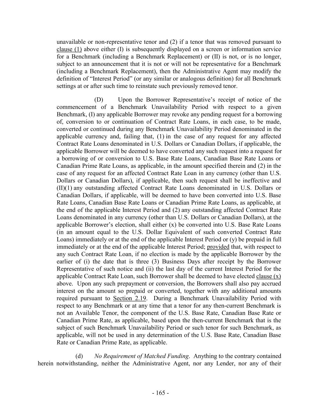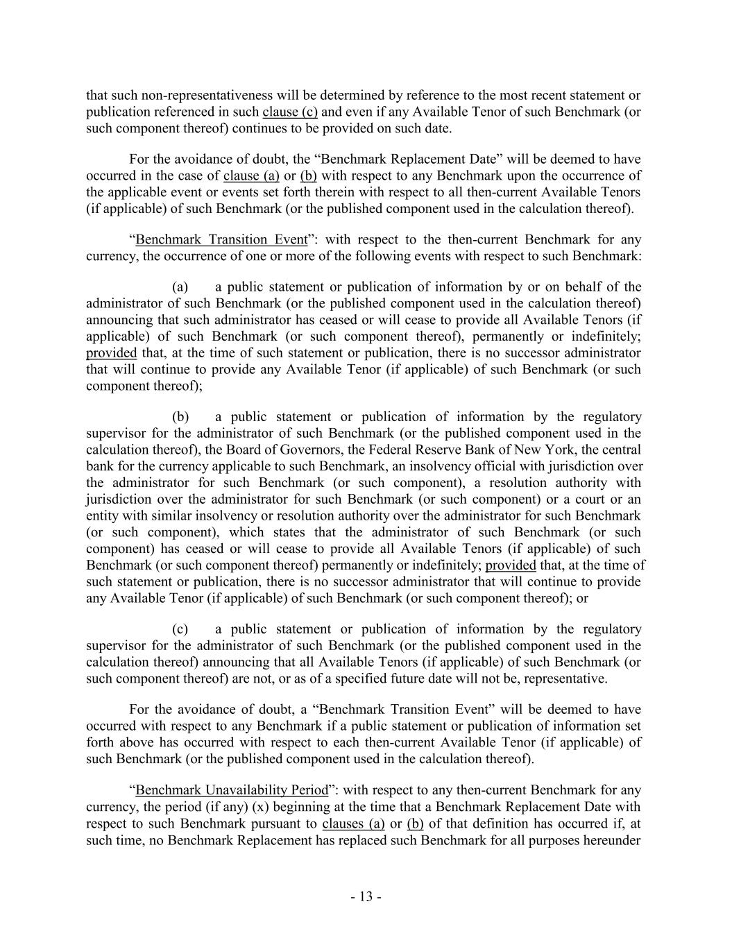that such non-representativeness will be determined by reference to the most recent statement or publication referenced in such clause (c) and even if any Available Tenor of such Benchmark (or such component thereof) continues to be provided on such date. For the avoidance of doubt, the “Benchmark Replacement Date” will be deemed to have occurred in the case of clause (a) or (b) with respect to any Benchmark upon the occurrence of the applicable event or events set forth therein with respect to all then-current Available Tenors (if applicable) of such Benchmark (or the published component used in the calculation thereof). “Benchmark Transition Event”: with respect to the then-current Benchmark for any currency, the occurrence of one or more of the following events with respect to such Benchmark: (a) a public statement or publication of information by or on behalf of the administrator of such Benchmark (or the published component used in the calculation thereof) announcing that such administrator has ceased or will cease to provide all Available Tenors (if applicable) of such Benchmark (or such component thereof), permanently or indefinitely; provided that, at the time of such statement or publication, there is no successor administrator that will continue to provide any Available Tenor (if applicable) of such Benchmark (or such component thereof); (b) a public statement or publication of information by the regulatory supervisor for the administrator of such Benchmark (or the published component used in the calculation thereof), the Board of Governors, the Federal Reserve Bank of New York, the central bank for the currency applicable to such Benchmark, an insolvency official with jurisdiction over the administrator for such Benchmark (or such component), a resolution authority with jurisdiction over the administrator for such Benchmark (or such component) or a court or an entity with similar insolvency or resolution authority over the administrator for such Benchmark (or such component), which states that the administrator of such Benchmark (or such component) has ceased or will cease to provide all Available Tenors (if applicable) of such Benchmark (or such component thereof) permanently or indefinitely; provided that, at the time of such statement or publication, there is no successor administrator that will continue to provide any Available Tenor (if applicable) of such Benchmark (or such component thereof); or (c) a public statement or publication of information by the regulatory supervisor for the administrator of such Benchmark (or the published component used in the calculation thereof) announcing that all Available Tenors (if applicable) of such Benchmark (or such component thereof) are not, or as of a specified future date will not be, representative. For the avoidance of doubt, a “Benchmark Transition Event” will be deemed to have occurred with respect to any Benchmark if a public statement or publication of information set forth above has occurred with respect to each then-current Available Tenor (if applicable) of such Benchmark (or the published component used in the calculation thereof). “Benchmark Unavailability Period”: with respect to any then-current Benchmark for any currency, the period (if any) (x) beginning at the time that a Benchmark Replacement Date with respect to such Benchmark pursuant to clauses (a) or (b) of that definition has occurred if, at such time, no Benchmark Replacement has replaced such Benchmark for all purposes hereunder - 13 -
