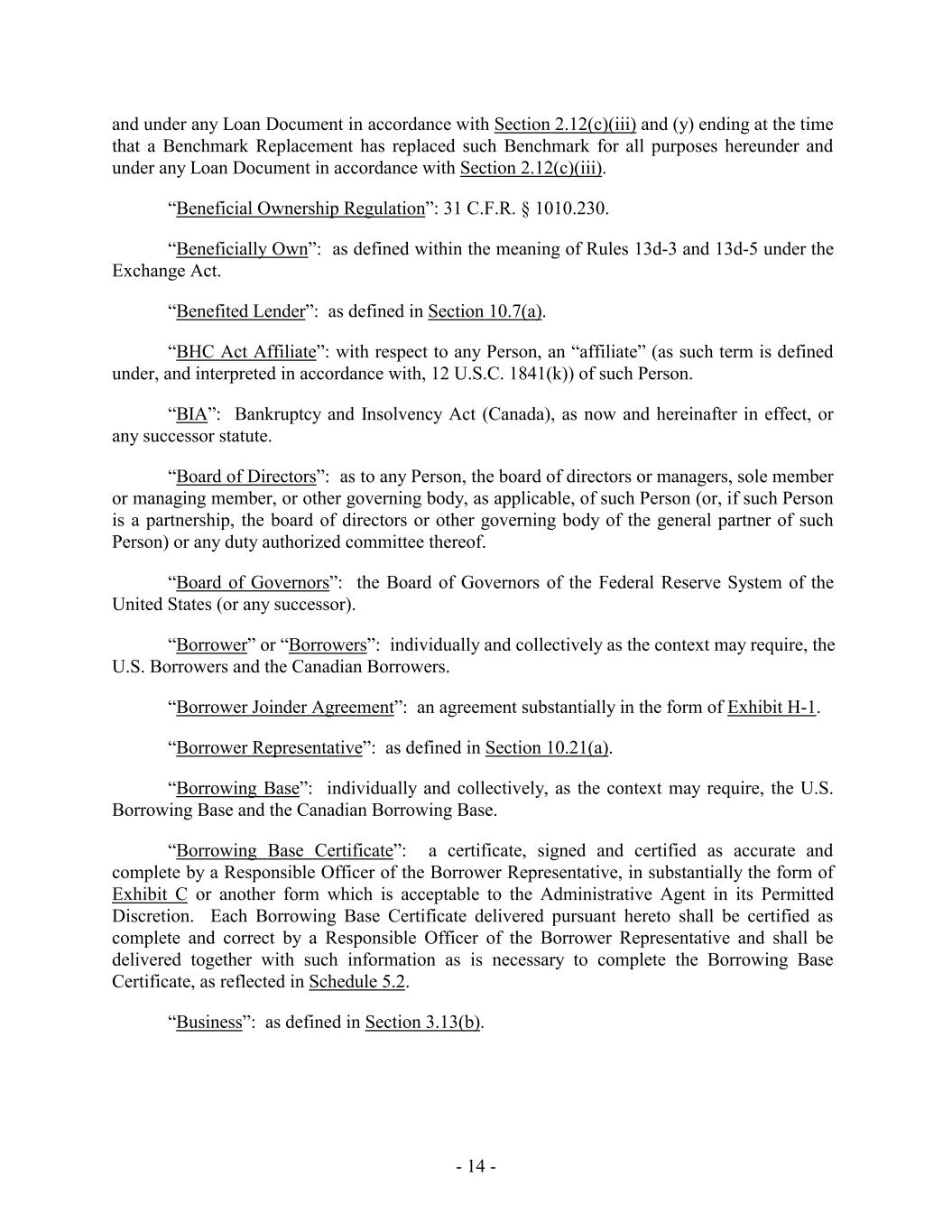 and under any Loan Document in accordance with Section 2.12(c)(iii) and (y) ending at the time that a Benchmark Replacement has replaced such Benchmark for all purposes hereunder and under any Loan Document in accordance with Section 2.12(c)(iii). “Beneficial Ownership Regulation”: 31 C.F.R. § 1010.230. “Beneficially Own”: as defined within the meaning of Rules 13d-3 and 13d-5 under the Exchange Act. “Benefited Lender”: as defined in Section 10.7(a). “BHC Act Affiliate”: with respect to any Person, an “affiliate” (as such term is defined under, and interpreted in accordance with, 12 U.S.C. 1841(k)) of such Person. “BIA”: Bankruptcy and Insolvency Act (Canada), as now and hereinafter in effect, or any successor statute. “Board of Directors”: as to any Person, the board of directors or managers, sole member or managing member, or other governing body, as applicable, of such Person (or, if such Person is a partnership, the board of directors or other governing body of the general partner of such Person) or any duty authorized committee thereof. “Board of Governors”: the Board of Governors of the Federal Reserve System of the United States (or any successor). “Borrower” or “Borrowers”: individually and collectively as the context may require, the U.S. Borrowers and the Canadian Borrowers. “Borrower Joinder Agreement”: an agreement substantially in the form of Exhibit H-1. “Borrower Representative”: as defined in Section 10.21(a). “Borrowing Base”: individually and collectively, as the context may require, the U.S. Borrowing Base and the Canadian Borrowing Base. “Borrowing Base Certificate”: a certificate, signed and certified as accurate and complete by a Responsible Officer of the Borrower Representative, in substantially the form of Exhibit C or another form which is acceptable to the Administrative Agent in its Permitted Discretion. Each Borrowing Base Certificate delivered pursuant hereto shall be certified as complete and correct by a Responsible Officer of the Borrower Representative and shall be delivered together with such information as is necessary to complete the Borrowing Base Certificate, as reflected in Schedule 5.2. “Business”: as defined in Section 3.13(b). - 14 -