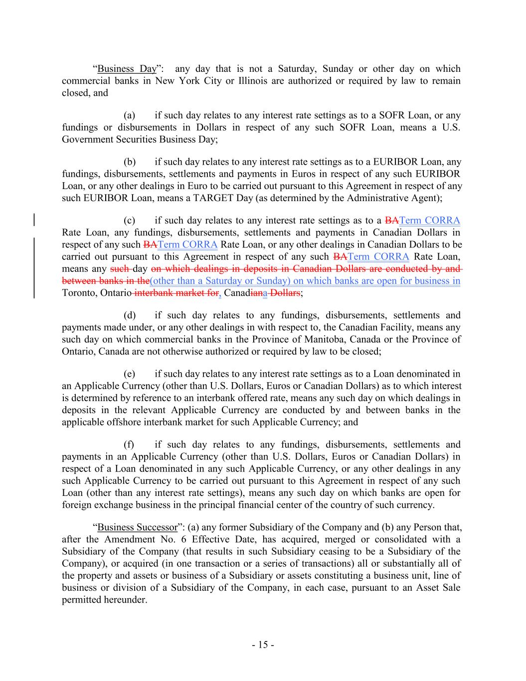 “Business Day”: any day that is not a Saturday, Sunday or other day on which commercial banks in New York City or Illinois are authorized or required by law to remain closed, and (a) if such day relates to any interest rate settings as to a SOFR Loan, or any fundings or disbursements in Dollars in respect of any such SOFR Loan, means a U.S. Government Securities Business Day; (b) if such day relates to any interest rate settings as to a EURIBOR Loan, any fundings, disbursements, settlements and payments in Euros in respect of any such EURIBOR Loan, or any other dealings in Euro to be carried out pursuant to this Agreement in respect of any such EURIBOR Loan, means a TARGET Day (as determined by the Administrative Agent); (c) if such day relates to any interest rate settings as to a BATerm CORRA Rate Loan, any fundings, disbursements, settlements and payments in Canadian Dollars in respect of any such BATerm CORRA Rate Loan, or any other dealings in Canadian Dollars to be carried out pursuant to this Agreement in respect of any such BATerm CORRA Rate Loan, means any such day on which dealings in deposits in Canadian Dollars are conducted by and between banks in the(other than a Saturday or Sunday) on which banks are open for business in Toronto, Ontario interbank market for, Canadiana Dollars; (d) if such day relates to any fundings, disbursements, settlements and payments made under, or any other dealings in with respect to, the Canadian Facility, means any such day on which commercial banks in the Province of Manitoba, Canada or the Province of Ontario, Canada are not otherwise authorized or required by law to be closed; (e) if such day relates to any interest rate settings as to a Loan denominated in an Applicable Currency (other than U.S. Dollars, Euros or Canadian Dollars) as to which interest is determined by reference to an interbank offered rate, means any such day on which dealings in deposits in the relevant Applicable Currency are conducted by and between banks in the applicable offshore interbank market for such Applicable Currency; and (f) if such day relates to any fundings, disbursements, settlements and payments in an Applicable Currency (other than U.S. Dollars, Euros or Canadian Dollars) in respect of a Loan denominated in any such Applicable Currency, or any other dealings in any such Applicable Currency to be carried out pursuant to this Agreement in respect of any such Loan (other than any interest rate settings), means any such day on which banks are open for foreign exchange business in the principal financial center of the country of such currency. “Business Successor”: (a) any former Subsidiary of the Company and (b) any Person that, after the Amendment No. 6 Effective Date, has acquired, merged or consolidated with a Subsidiary of the Company (that results in such Subsidiary ceasing to be a Subsidiary of the Company), or acquired (in one transaction or a series of transactions) all or substantially all of the property and assets or business of a Subsidiary or assets constituting a business unit, line of business or division of a Subsidiary of the Company, in each case, pursuant to an Asset Sale permitted hereunder. - 15 -